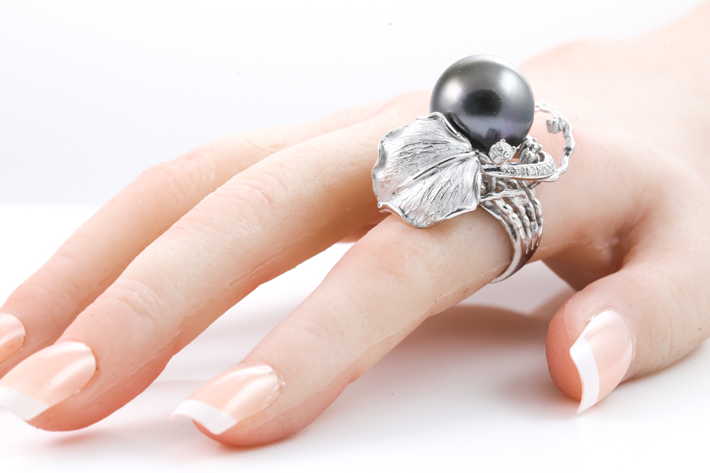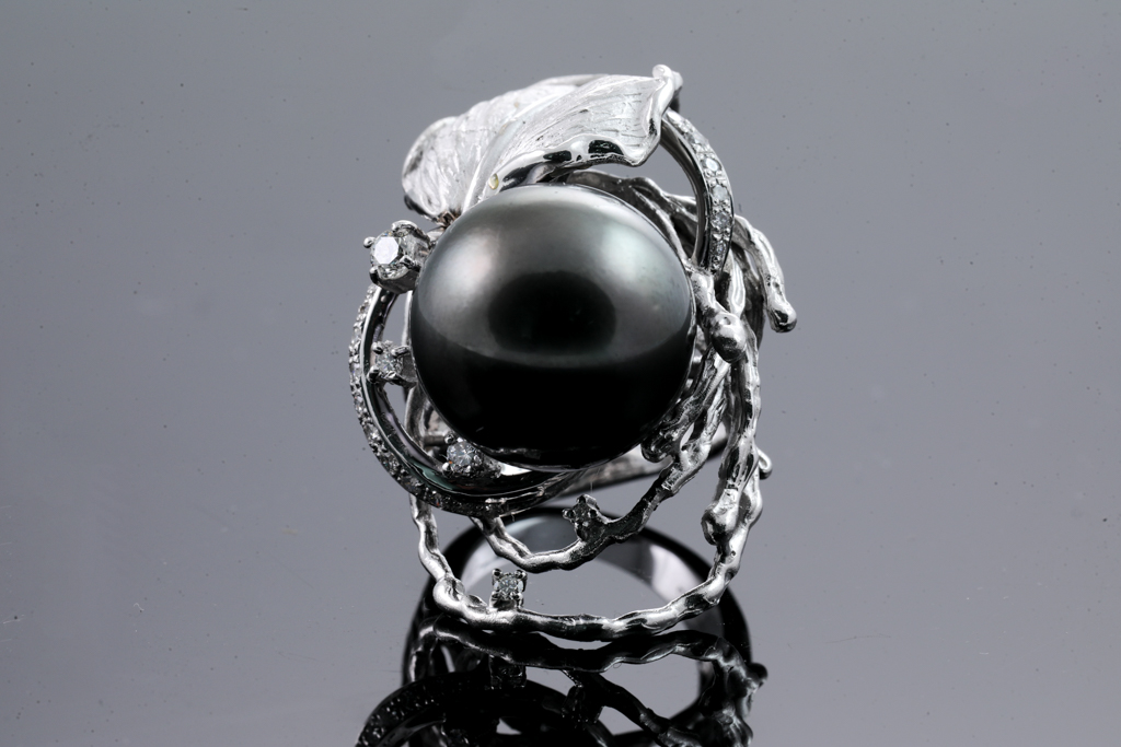 Pearl and Diamond ring with Tahitian Pearl of 16.5mm and round Diamonds totalling 0.43cts (Estimated grading: G SI). Platinum. Ring size: K. Weight: 33g. (Pre-owned)