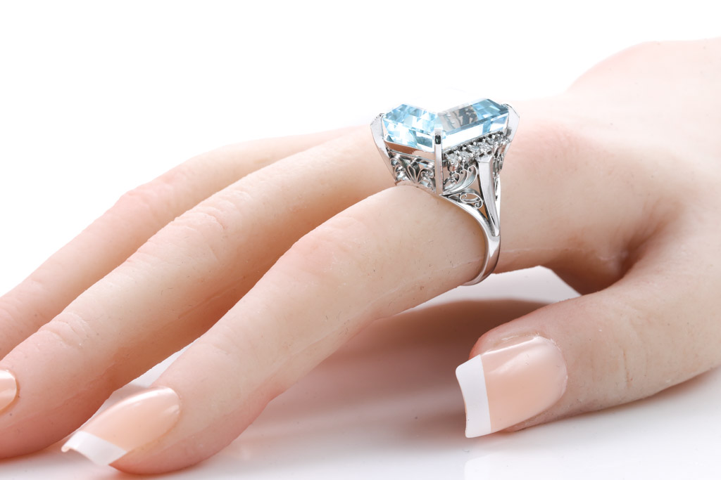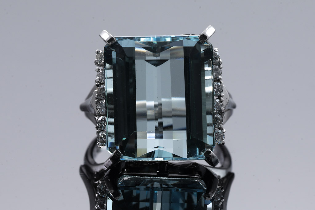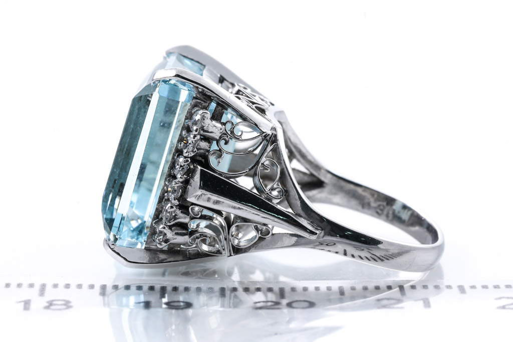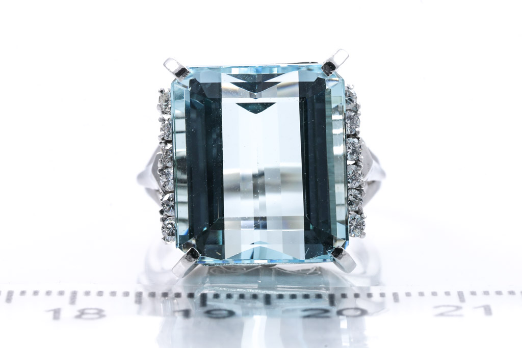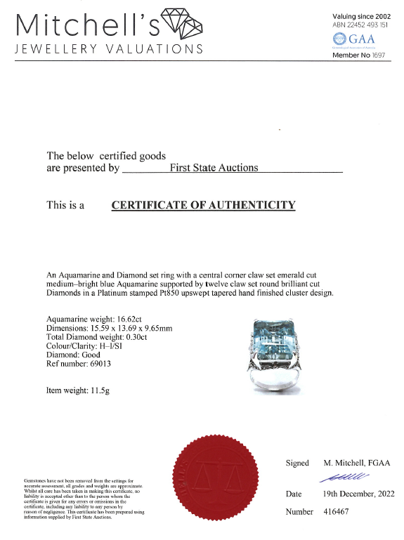 Aquamarine and Diamond ring with emerald cut Aquamarine of 16.62ct and round Diamonds totalling 0.30cts (Estimated grading: H-I SI). Platinum. Ring size L1/2. Weight: 11.5g. With certificate #416467. (Pre-owned)