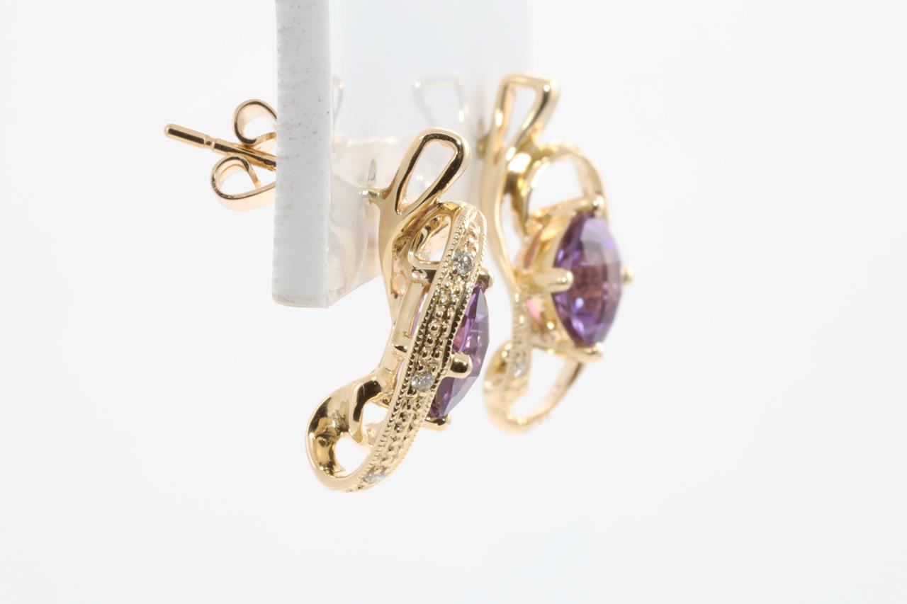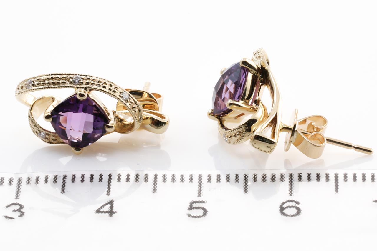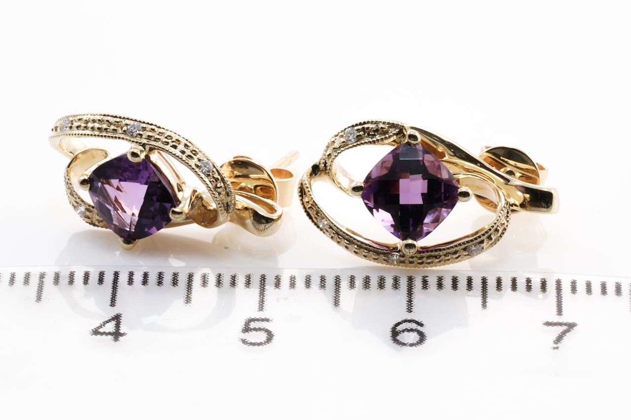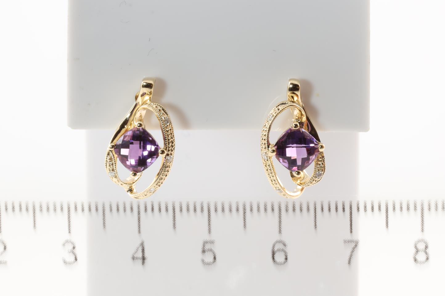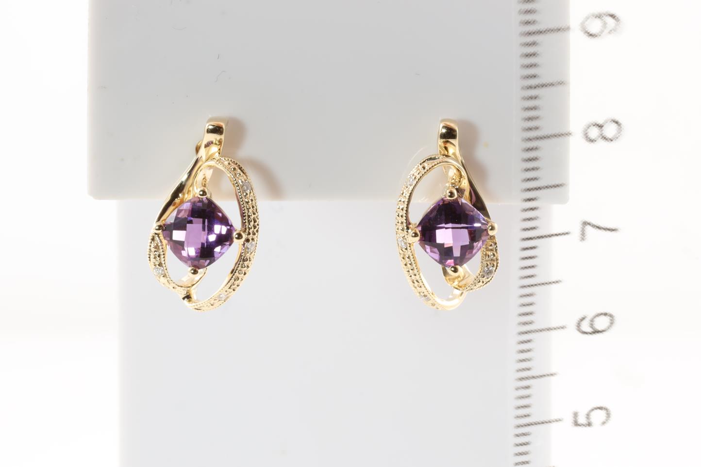 Amethyst and Diamond earrings with cushion checkerboard cut Amethysts totalling 1.66cts and Diamonds totalling 0.05cts. 14ct Yellow gold. Weight:3.2g (New)