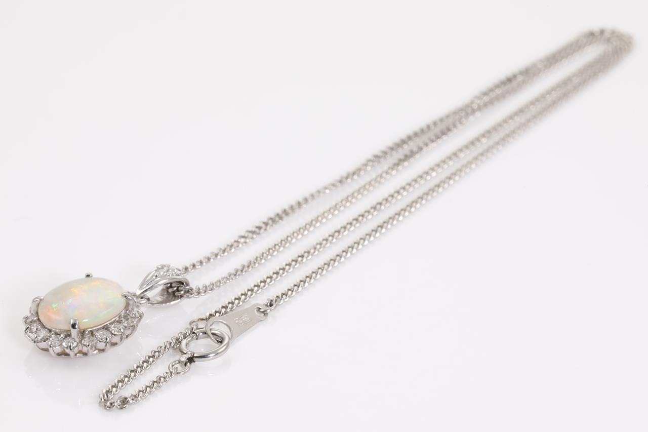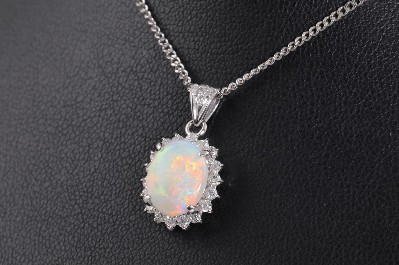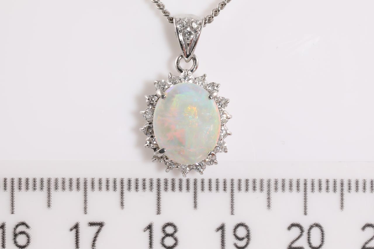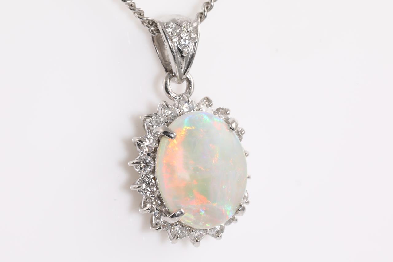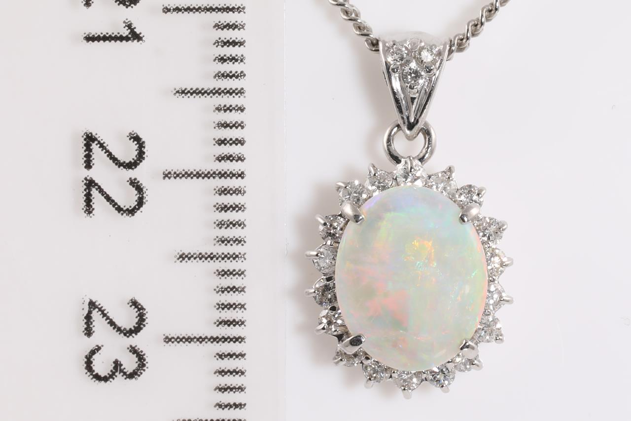Opal and Diamond pendant with oval cabochon cut white Opal of 31.67ct and Diamonds totalling 0.43cts (Estimated grading: G VS). Platinum with 40cm adjustable chain. Weight: 7.7g (Pre-owned)