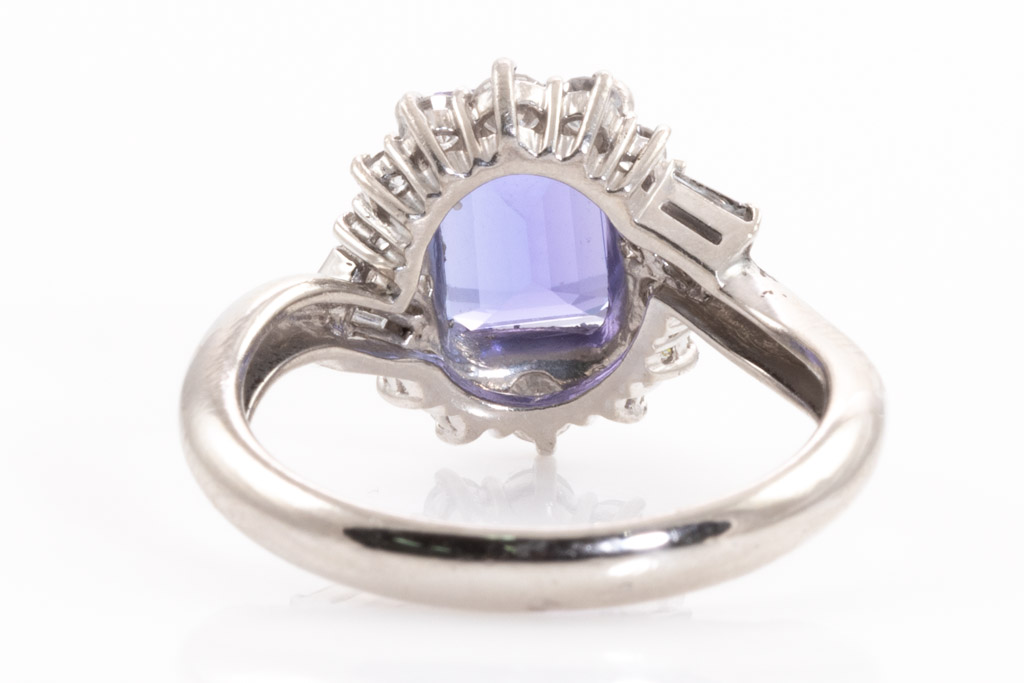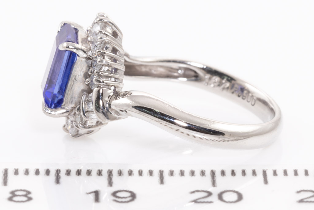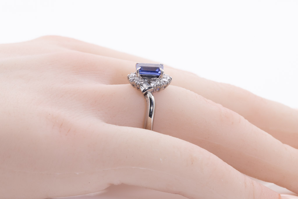 Tanzanite and Diamond ring with emerald cut Tanzanite of 1.67ct and round &baguette cut Diamonds totalling 0.50cts (Estimated grading: G-H SI). Platinum. Ring size K. Weight: 5.7g. (Pre-owned)