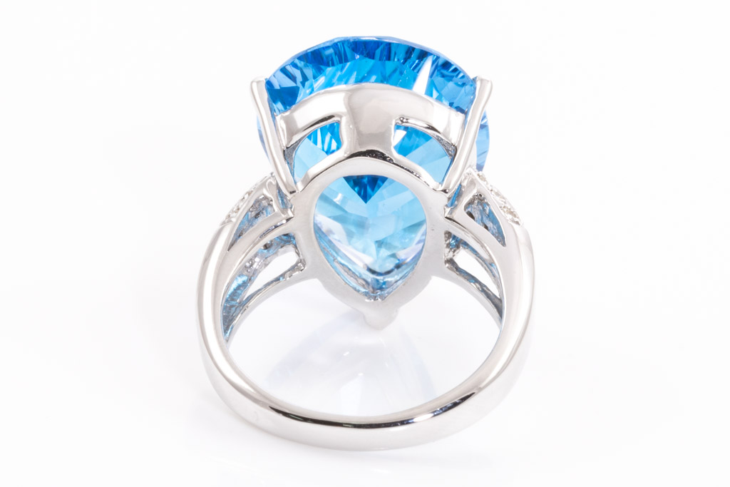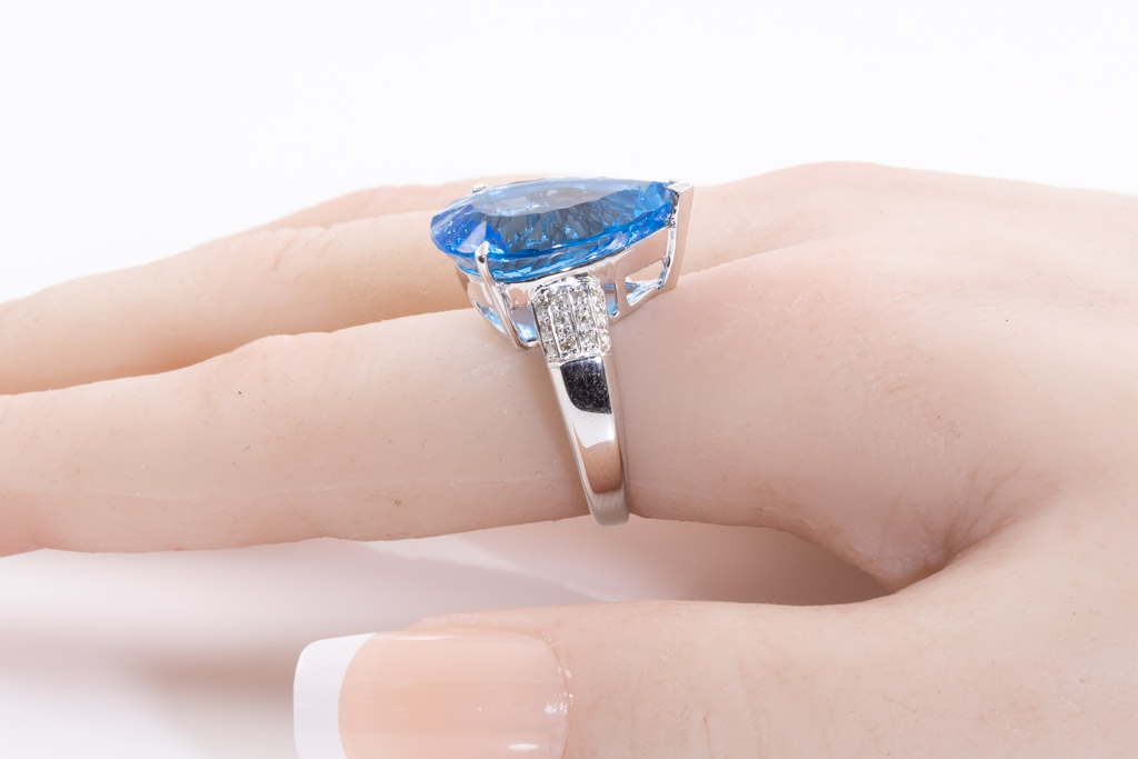 Topaz and Diamond ring with pear shape blue Topaz of 16.83ct and Diamonds totalling 0.16cts. 18ct white gold. Ring size M1/2. Weight: 11.2g. (Pre-owned)