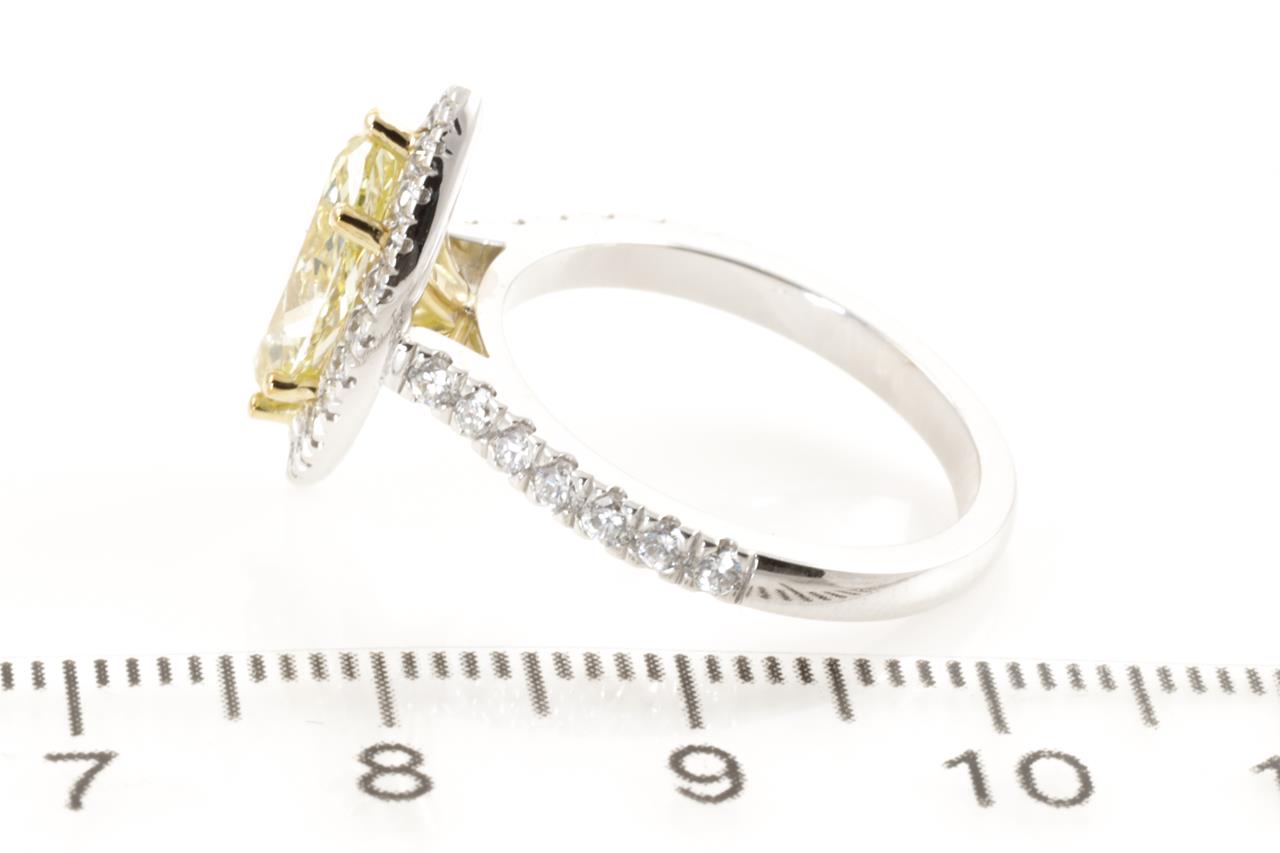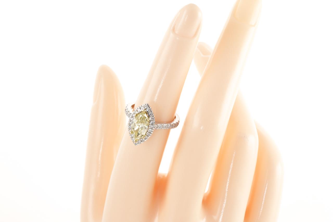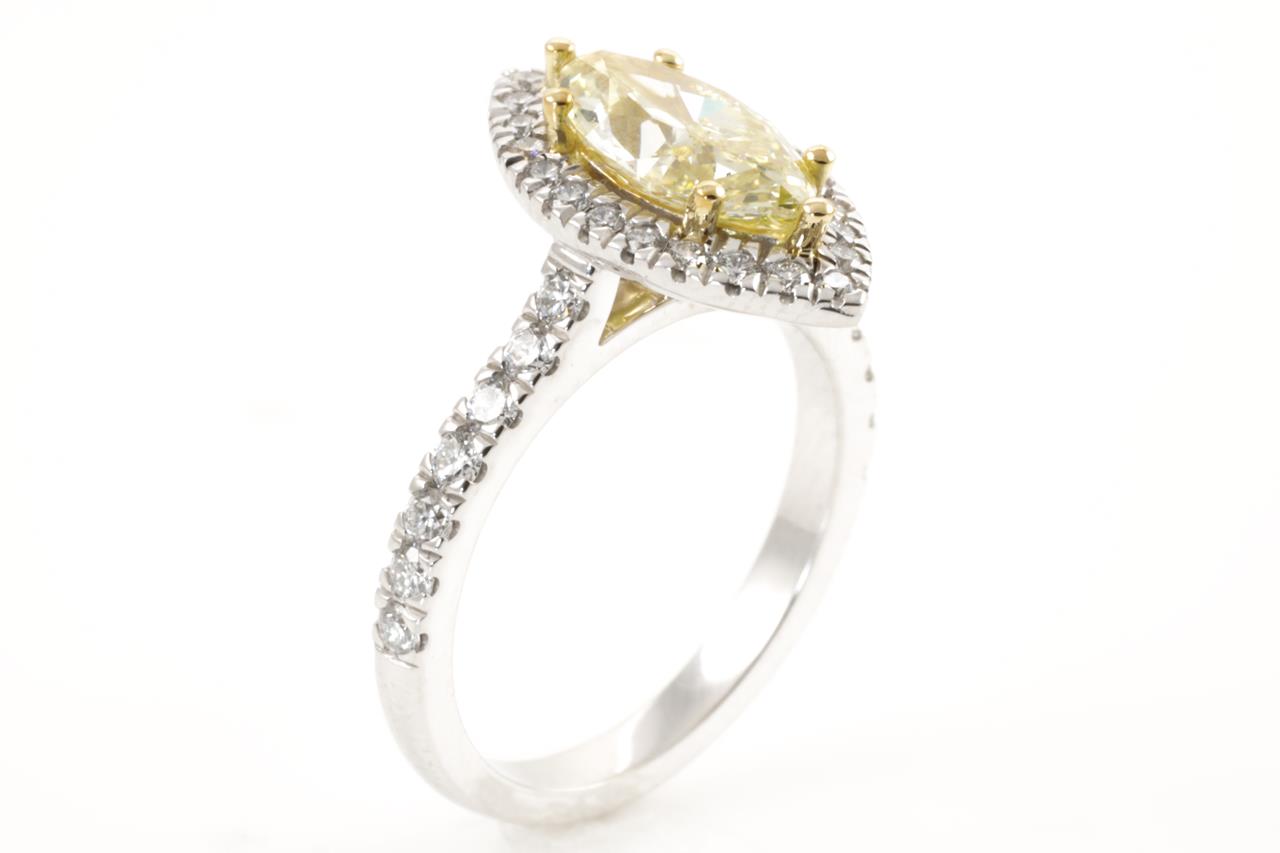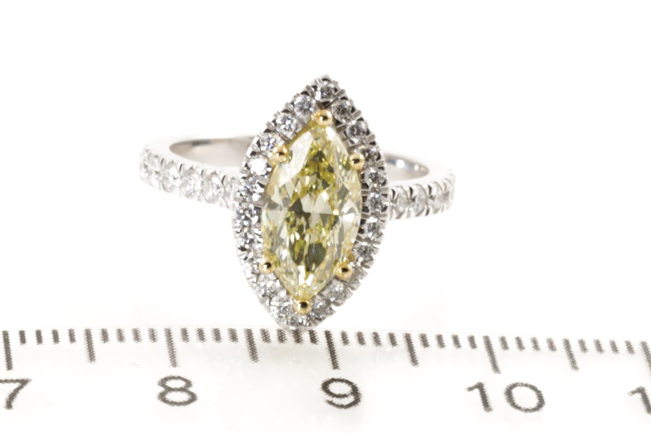 Diamond ring with centre marquise cut Diamond of 1.68ct (with GIA report graded as Natural Fancy Light Yellow Even VS1 #5151440042) and surrounding diamonds totalling 0.57cts (Estimated grading: F VS-SI). 18ct yellow & white gold. Ring size: L1/2. Weight: 5.6g. (New)
