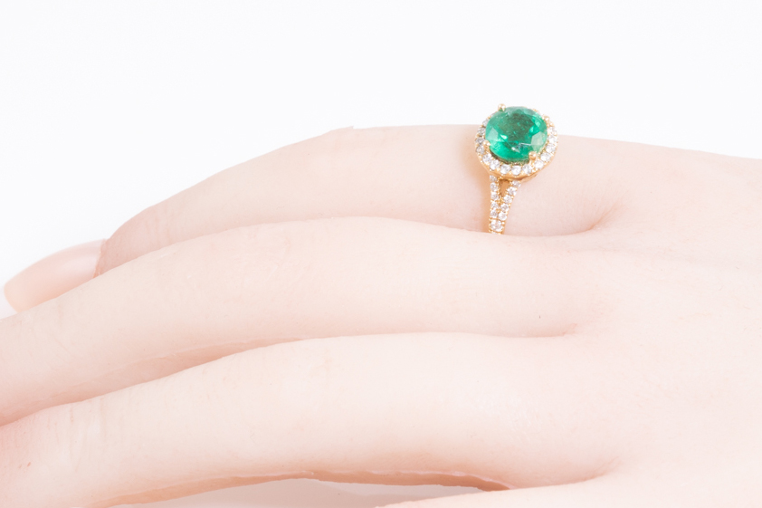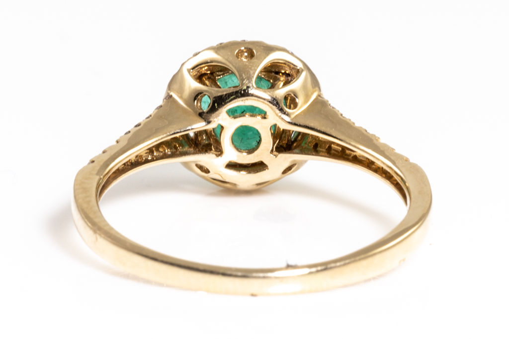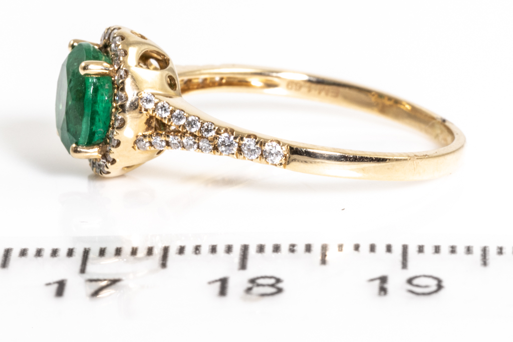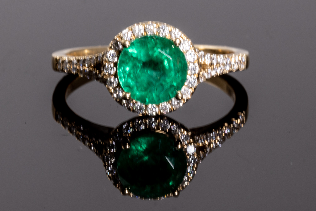 Emerald and Diamond ring with a round Emerald of 1.69ct and round Diamonds totalling 0.35cts (Estimated grading: H SI-P1). 14ct yellow gold. Ring size R. Weight 3.4g (As New)
