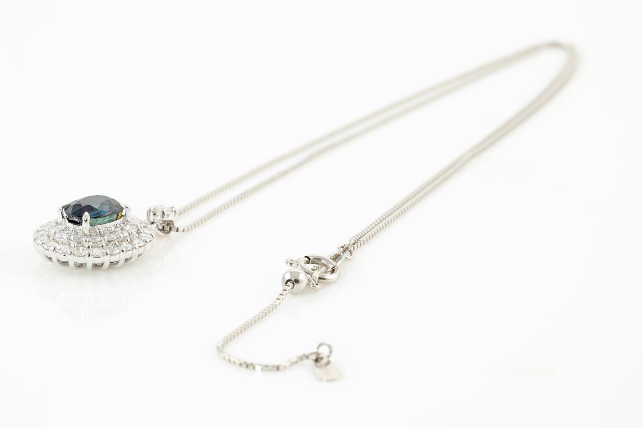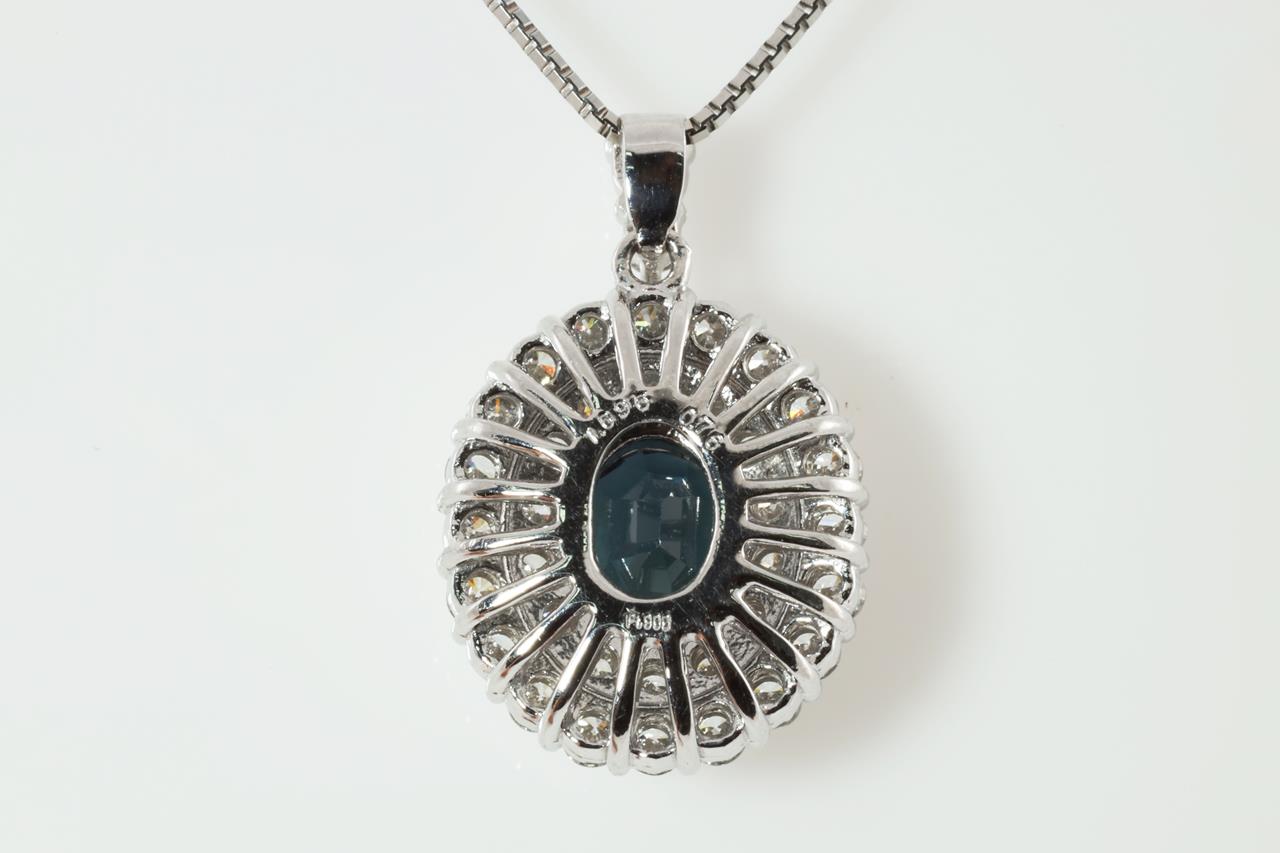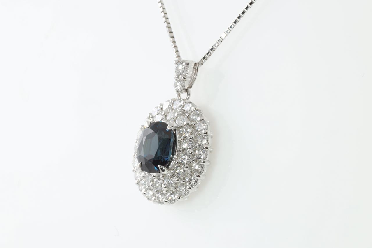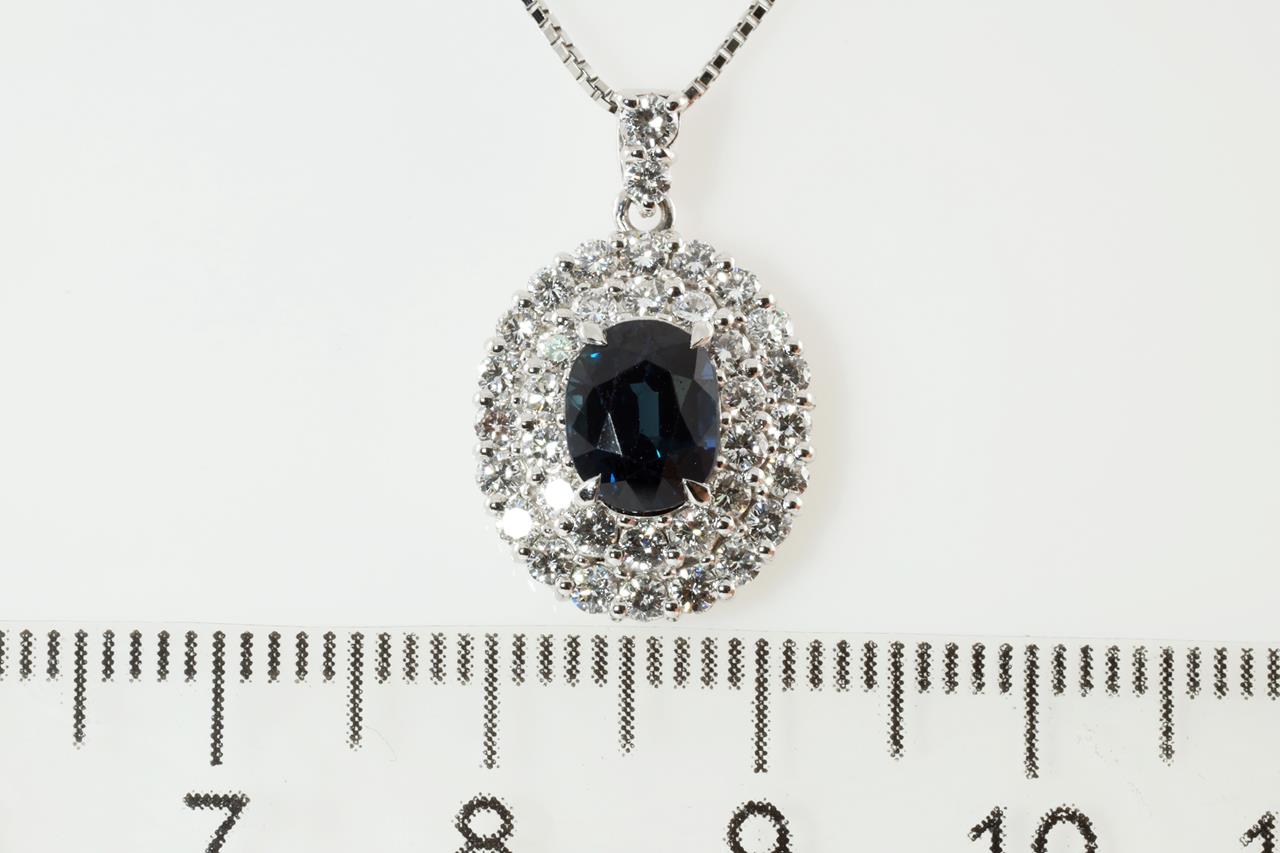 Sapphire and Diamond pendant with oval cut blue Sapphire of 1.69ct and round Diamonds totalling 0.76cts (Estimated grading: G-H VS). Platinum with platinum 45cm adjustable chain. Weight: 6.0g (Pre-owned)