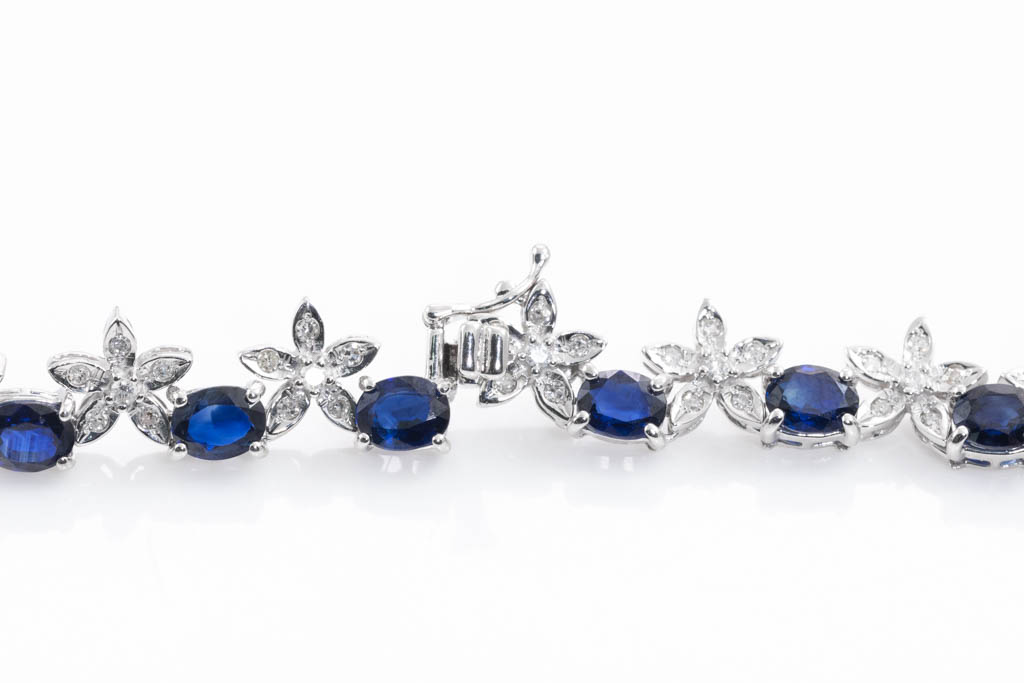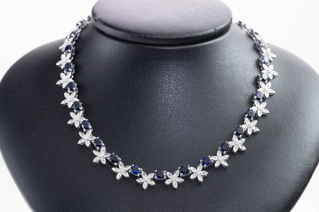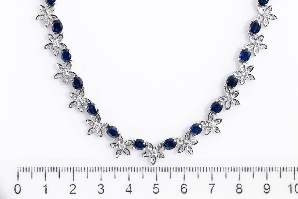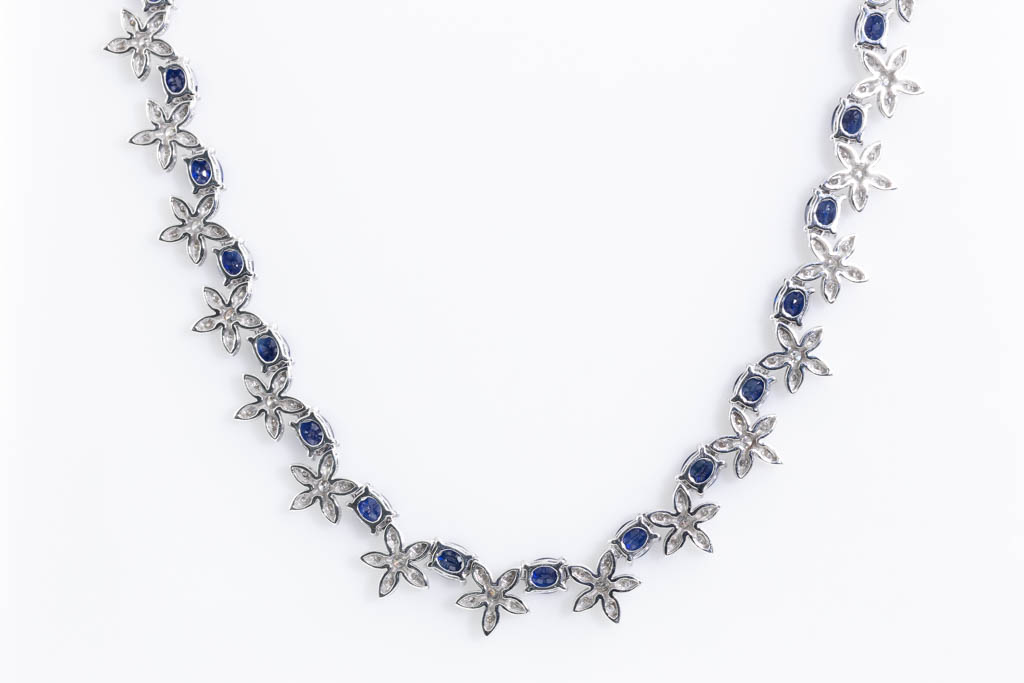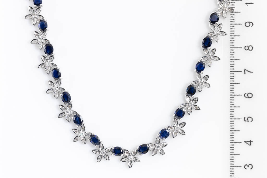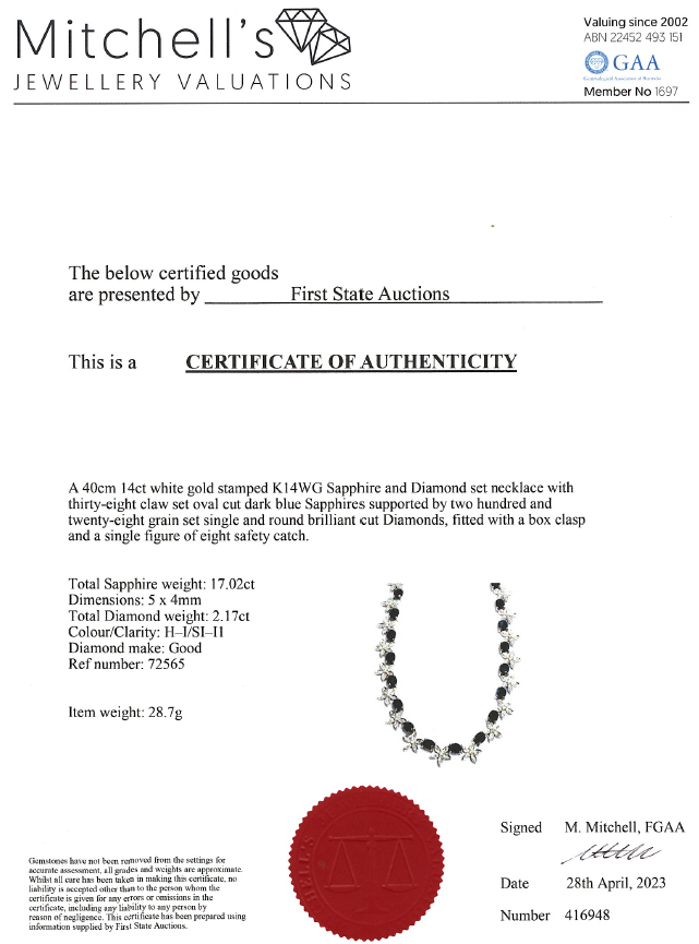 Sapphire and Diamond necklace with oval shape blue Sapphire totalling 17.02cts and round Diamonds totalling 2.17cts (Estimated grading: H-I SI-P1). 14ct white gold. Length: 40cm. Weight: 28.7g. With Certificate #416948. (Pre-owned)