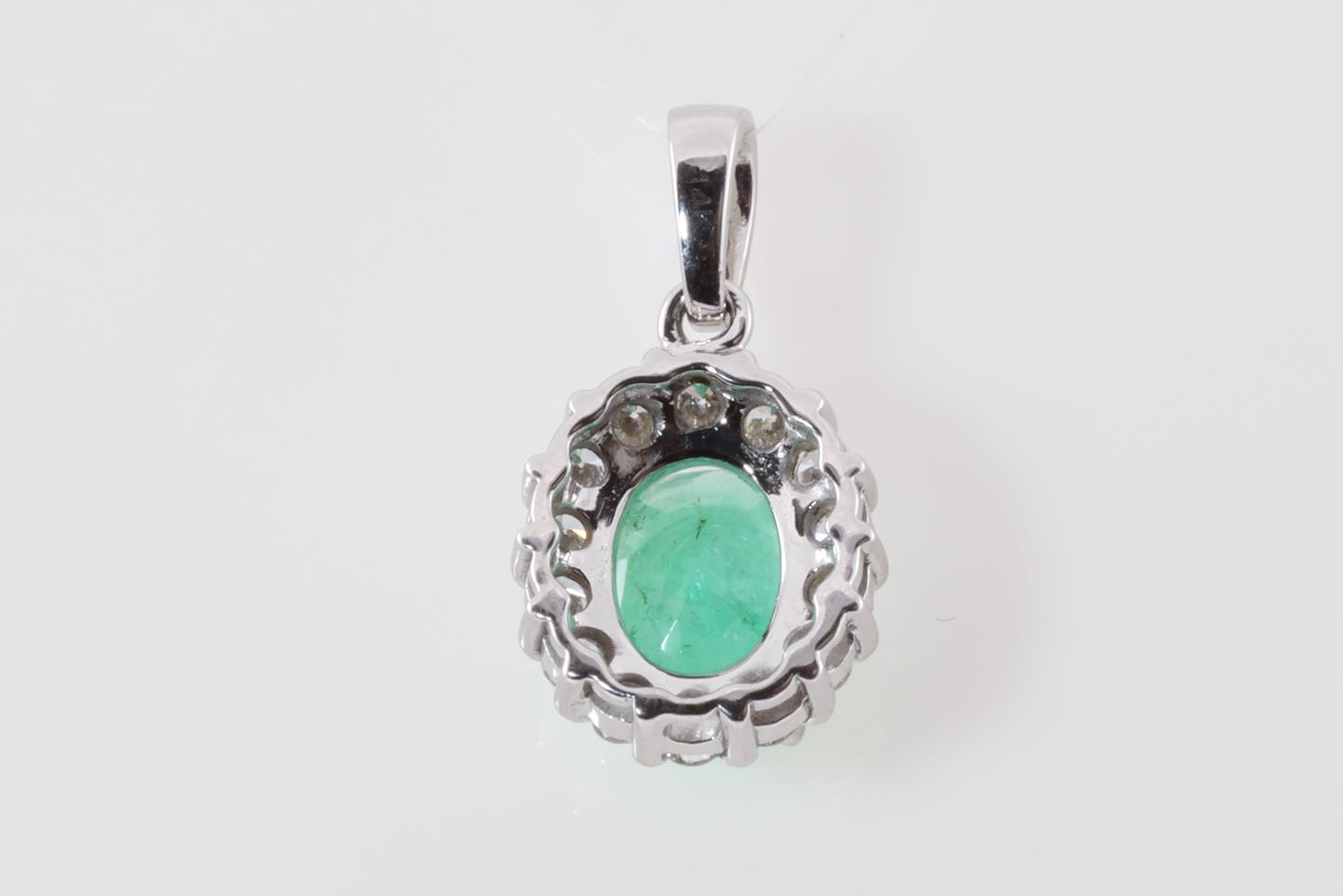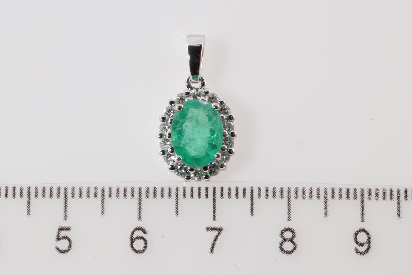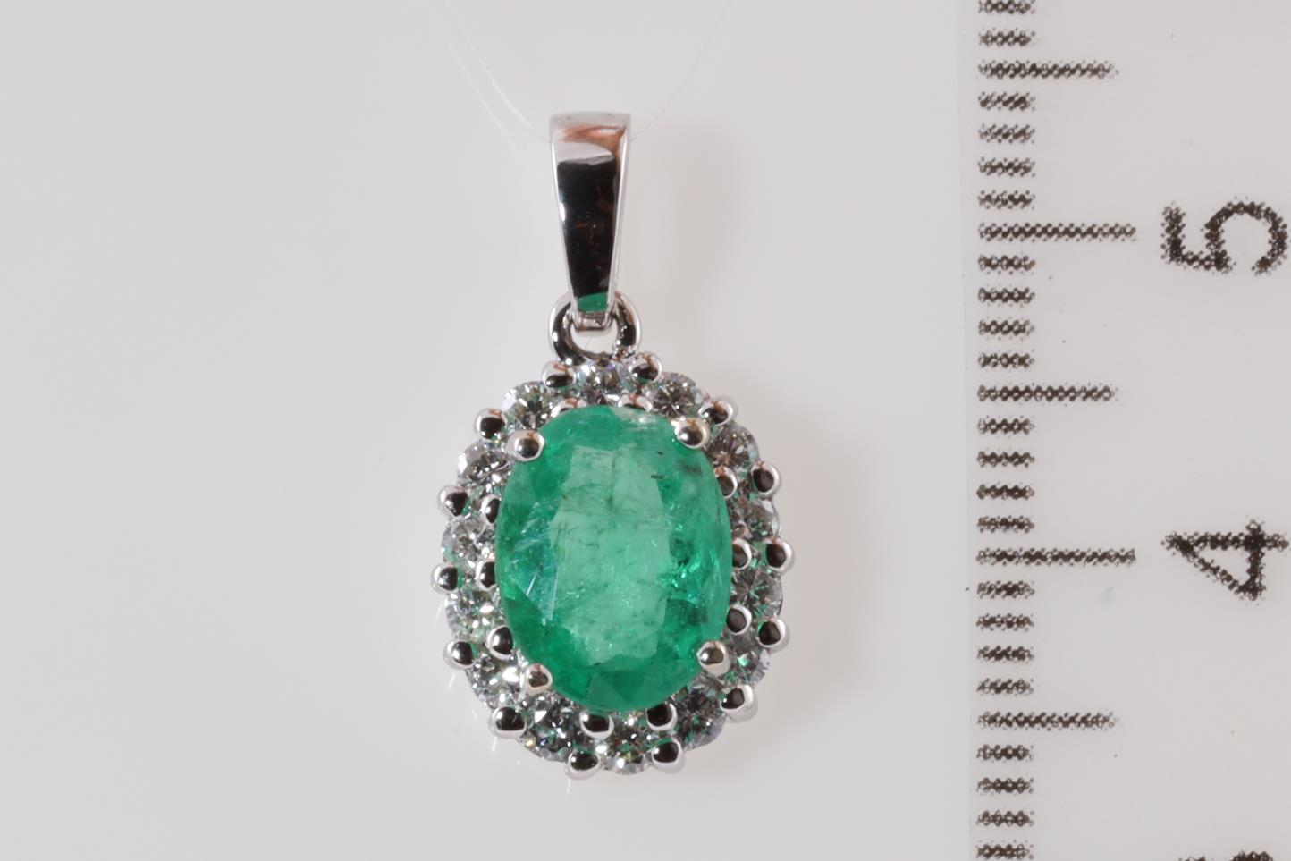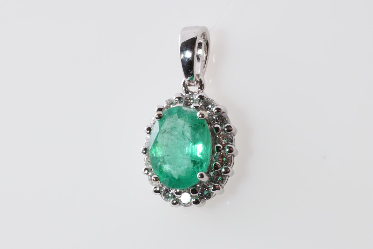 Emerald and Diamond pendant with an oval Emerald of 1.70ct and round Diamonds totalling 0.41cts (Estimated grading: G-H VS-SI). 14ct white gold. No chain provided. Weight: 2.1g (As New)