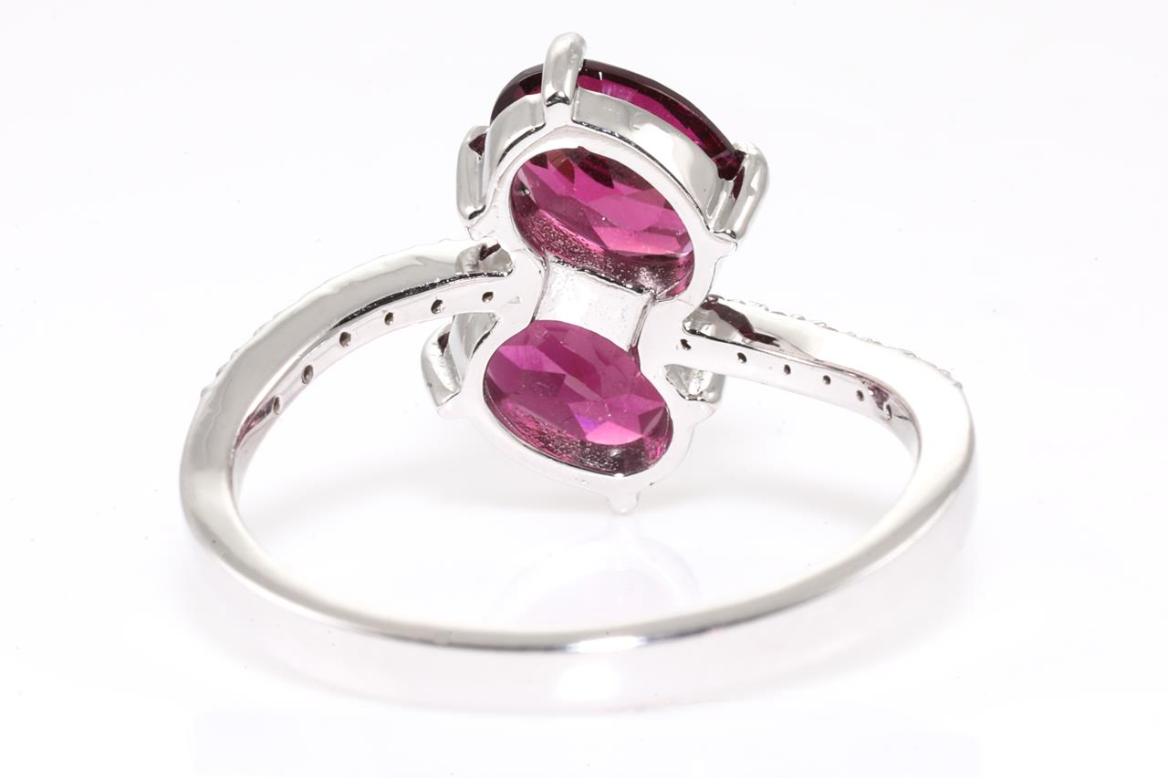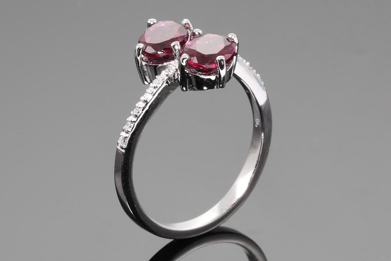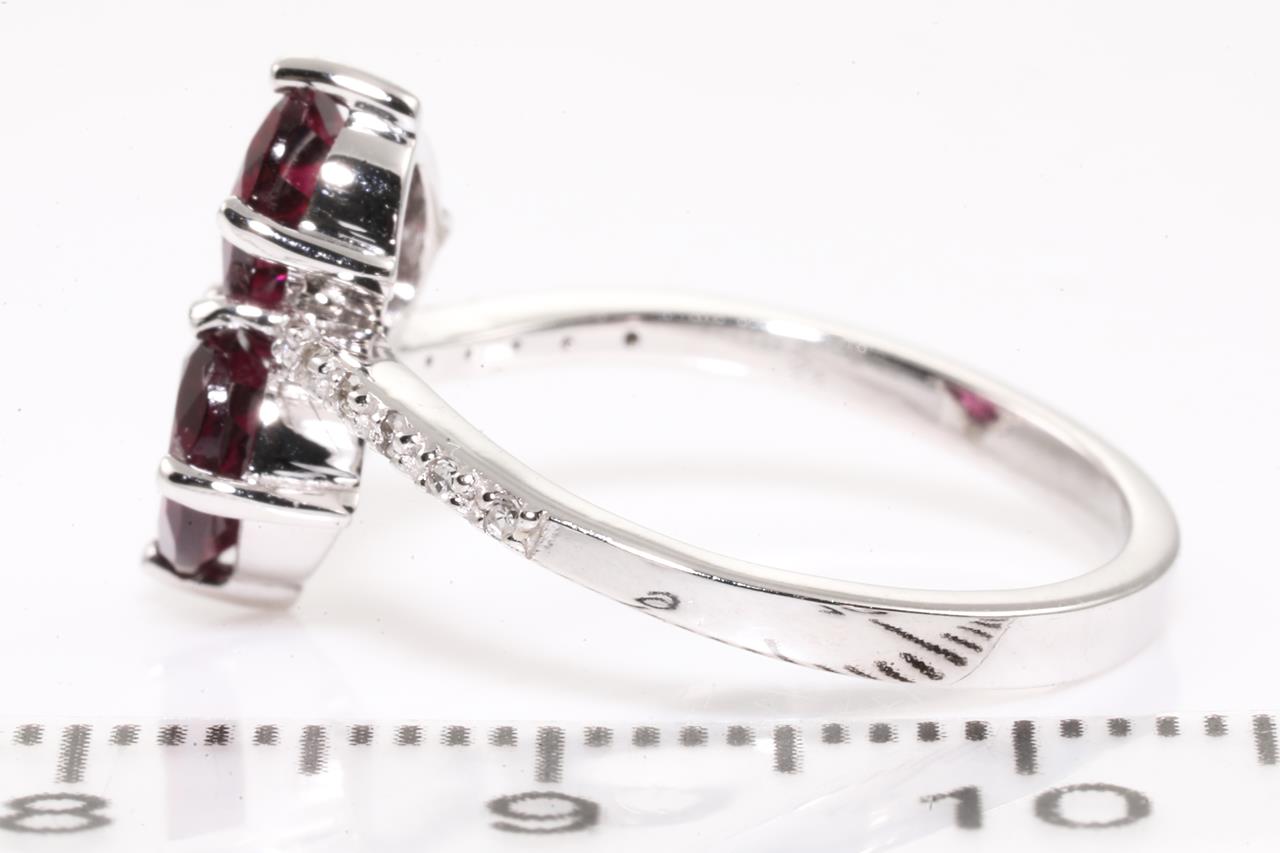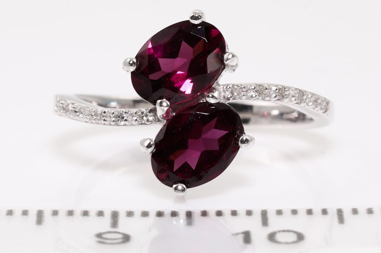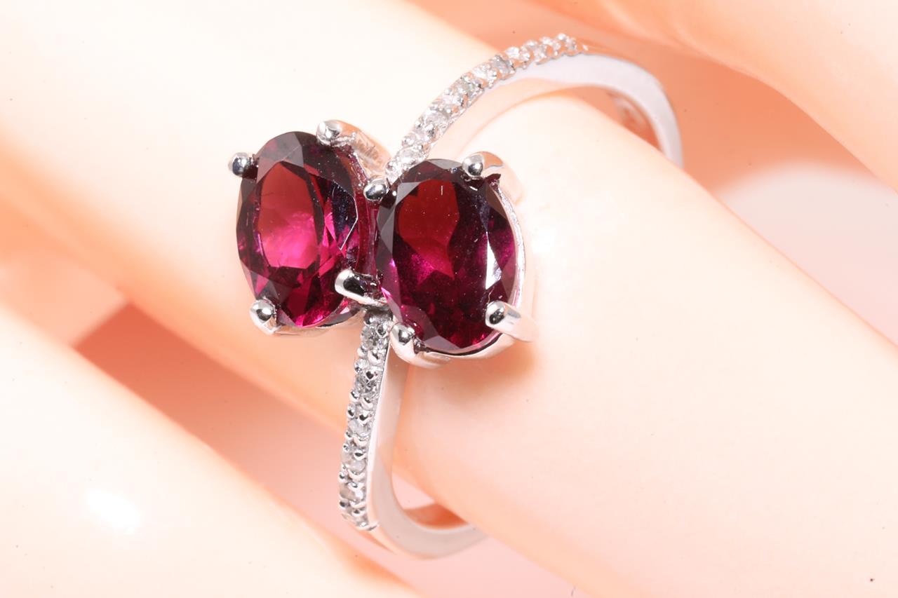 Garnet and Diamond ring with 2 oval red Garnets totalling approximately 1.70cts and round Diamonds totalling approximately 0.06cts. 14ct white gold. Ring size L. Weight: 2.9g. (As new)