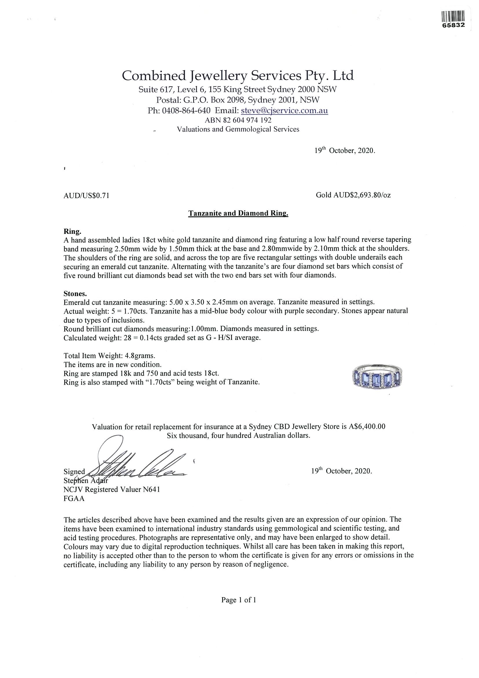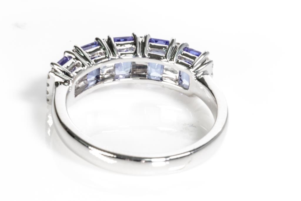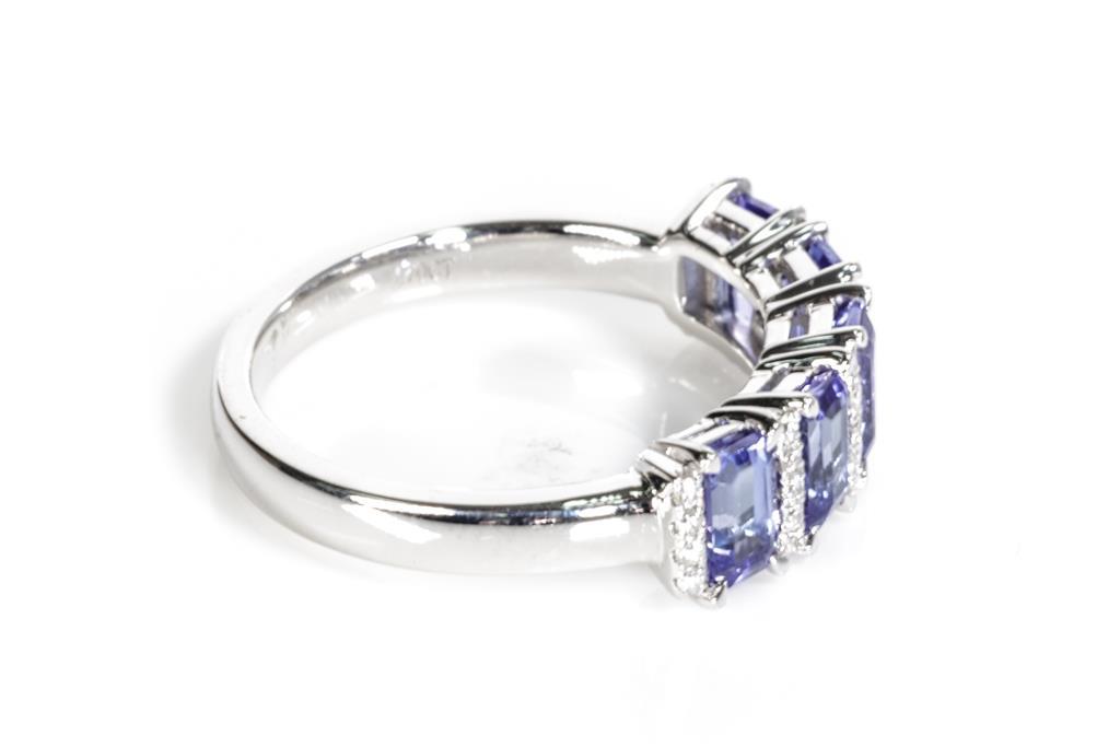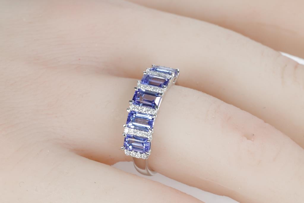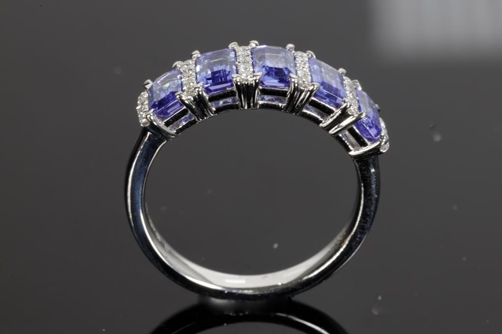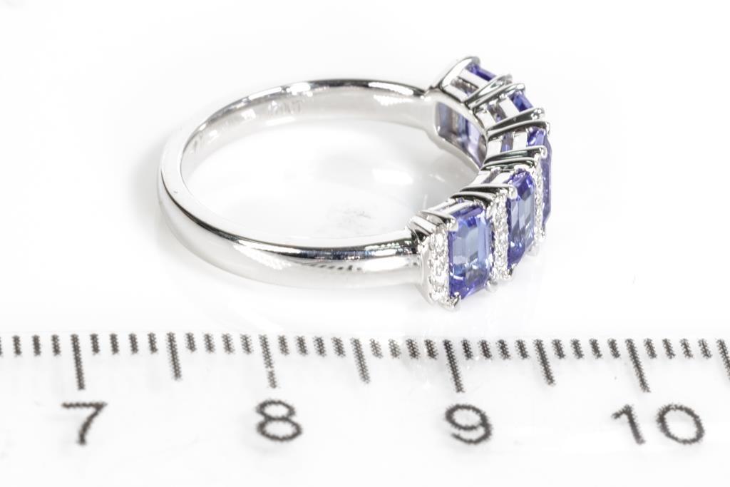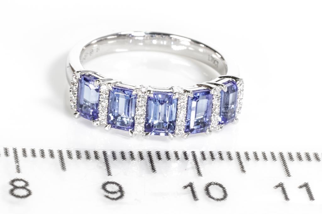 Tanzanite and Diamond ring with five emerald cut Tanzanite totalling 1.70cts and round Diamonds totalling approximately 0.14cts. 18ct white gold. Ring size L 1/2. Weight 4.0g. With valuation. (Pre-owned)