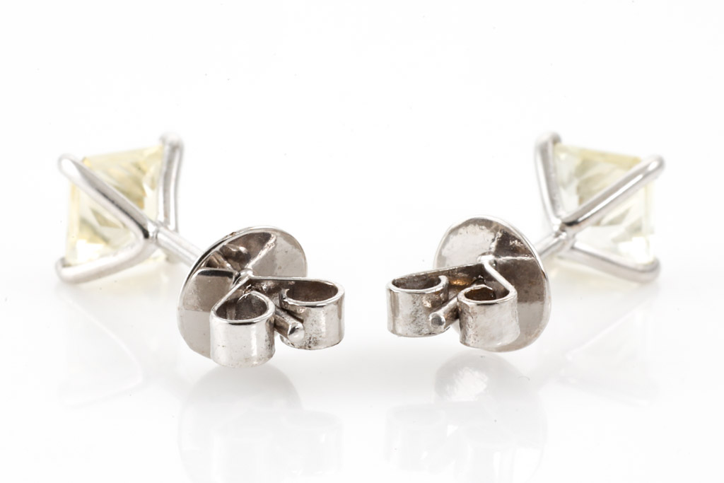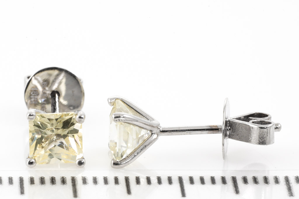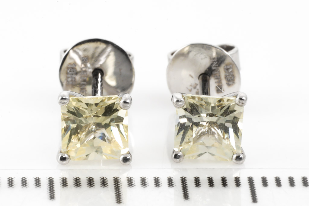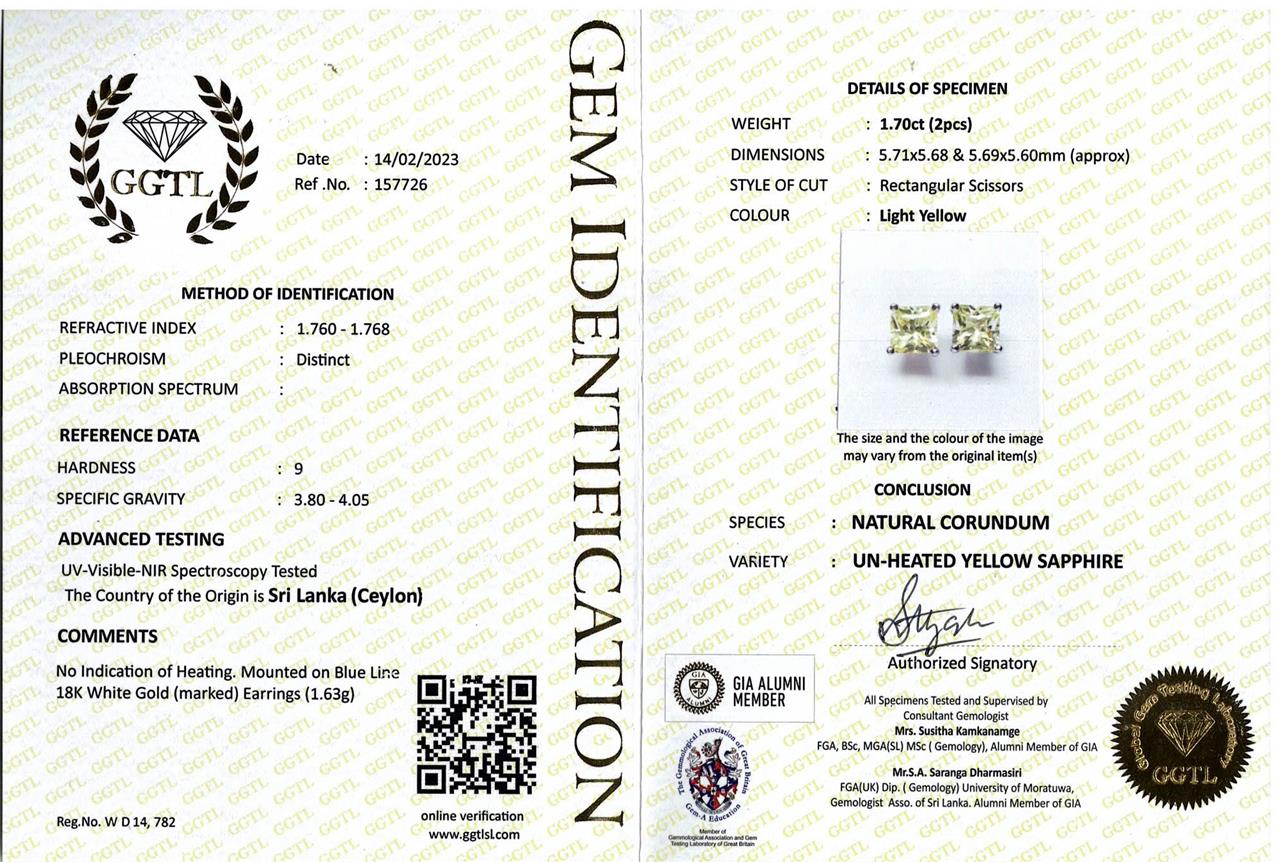 Sapphire Studs set with princess cut unheated Ceylon Light yellow Sapphires totalling 1.70cts. 18ct white gold. Weight 1.6g. With GGTL certificate #157726.