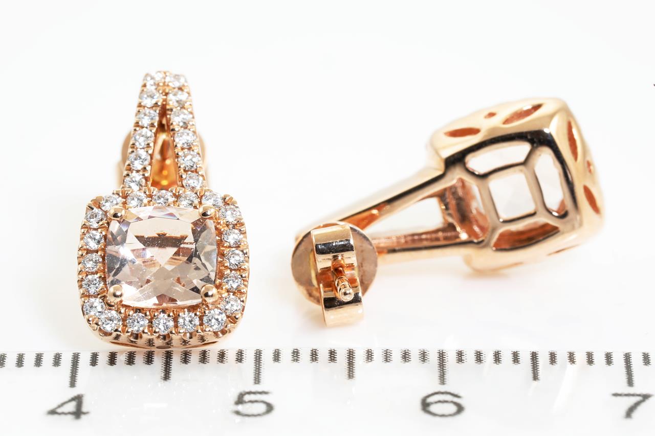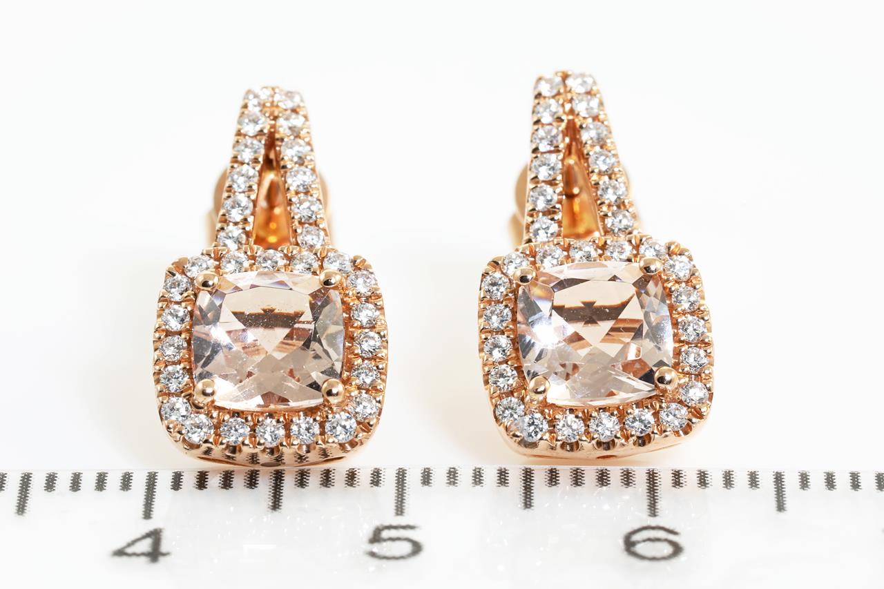 Morganite and Diamond earrings with cushion cut Morganites totalling 1.71cts and Diamonds totalling 0.44cts (Estimated grading: H SI). 14ct rose gold. Weight: 4.9g. (New)