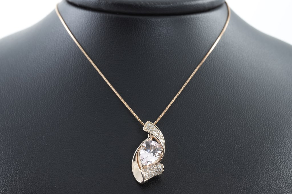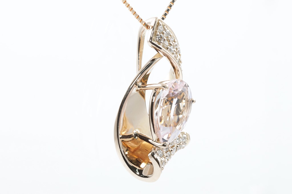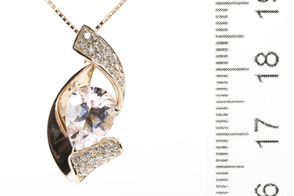 Morganite and Diamond pendant with a pear shape Morganite of 1.71ct and round Diamonds totalling 0.20cts. 18ct rose gold with 44cm adjustable chain. Weight: 6.0g. (Pre-owned)