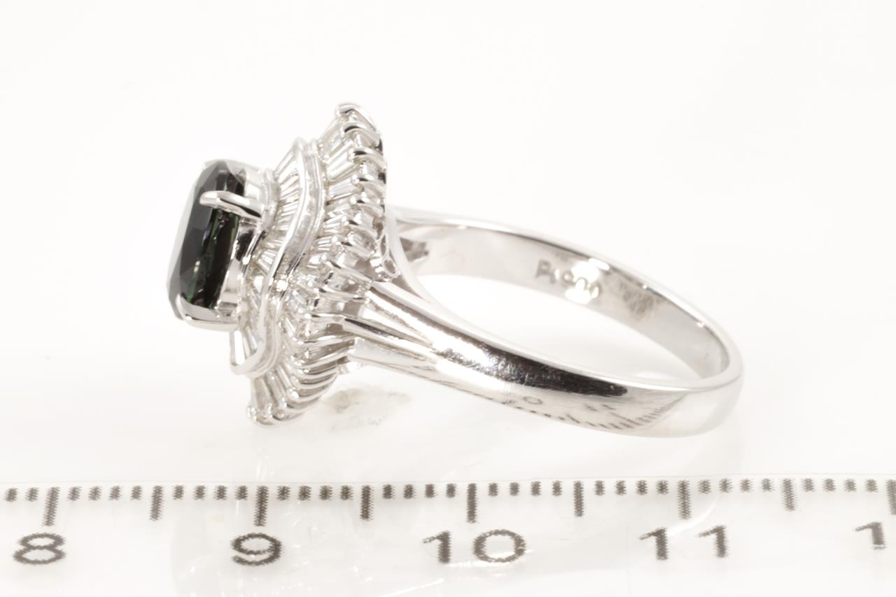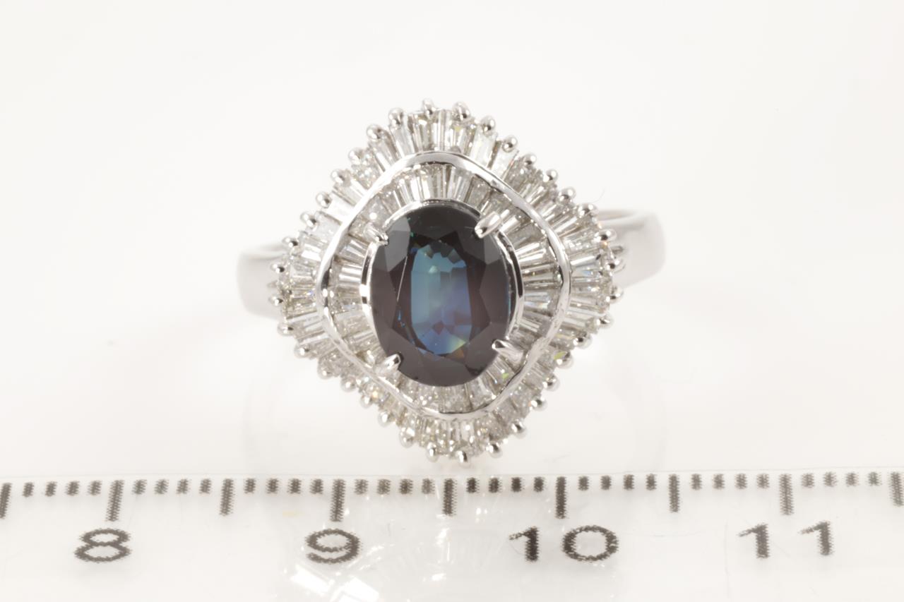 Sapphire and Diamond ring with a dark blue oval Sapphire of 1.71ct and Diamonds totalling 1.01cts (Estimated grading: G-H SI2-P1). Platinum. Weight: 8.4g. Ring size M1/2. (Pre-owned)