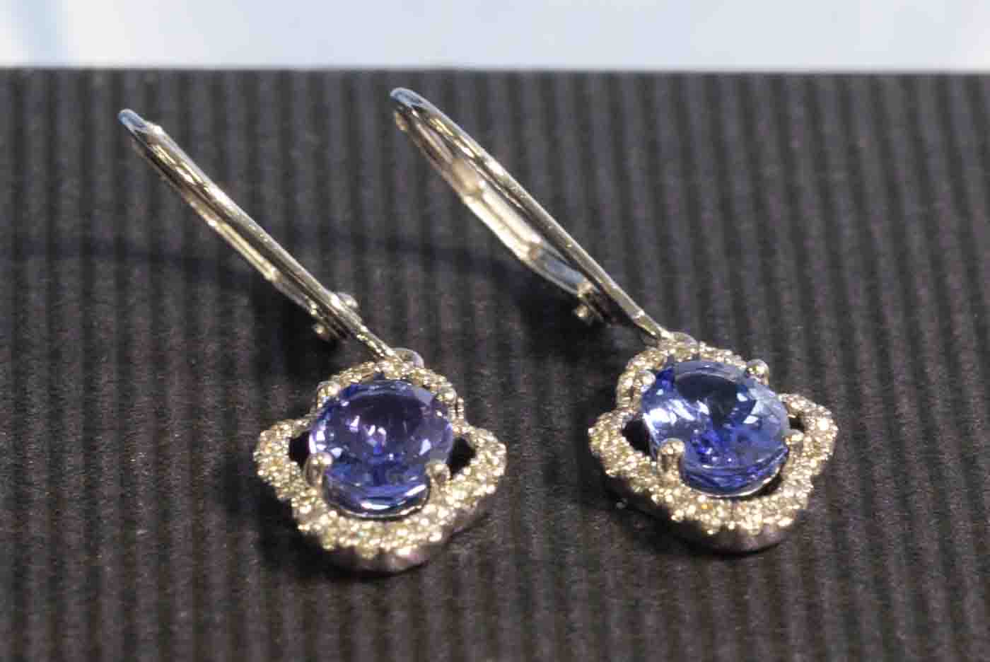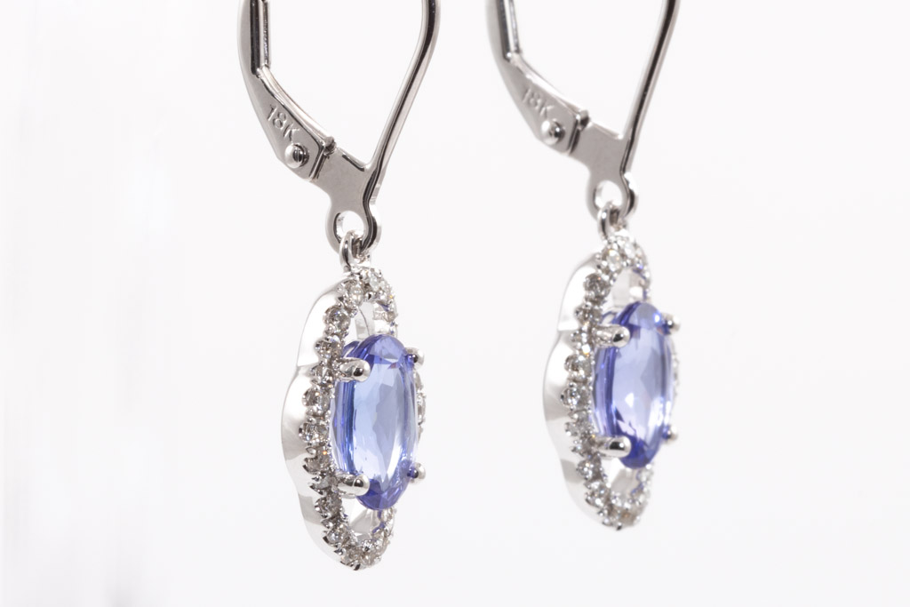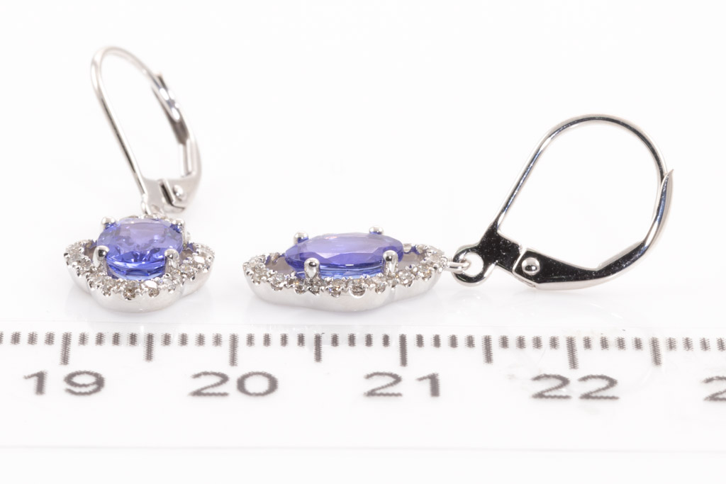 Tanzanite and Diamond leverback earrings with oval Tanzanite's totalling 1.71cts and round Diamonds totalling 0.32cts (Estimated grading: I-J SI). 18ct white gold. Weight: 2.6g. (New)