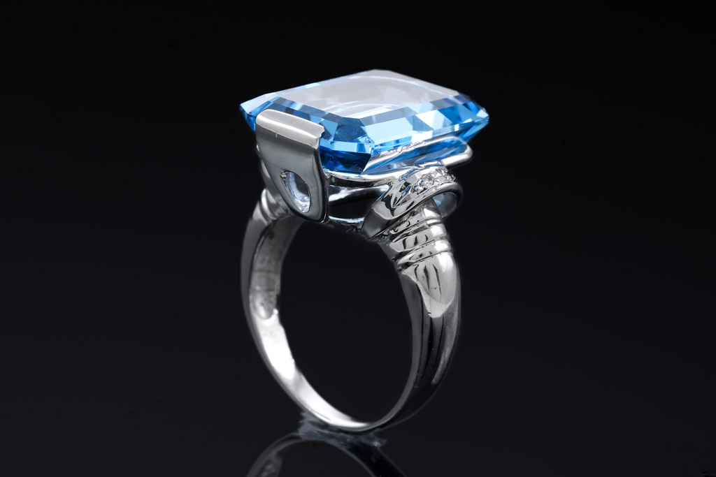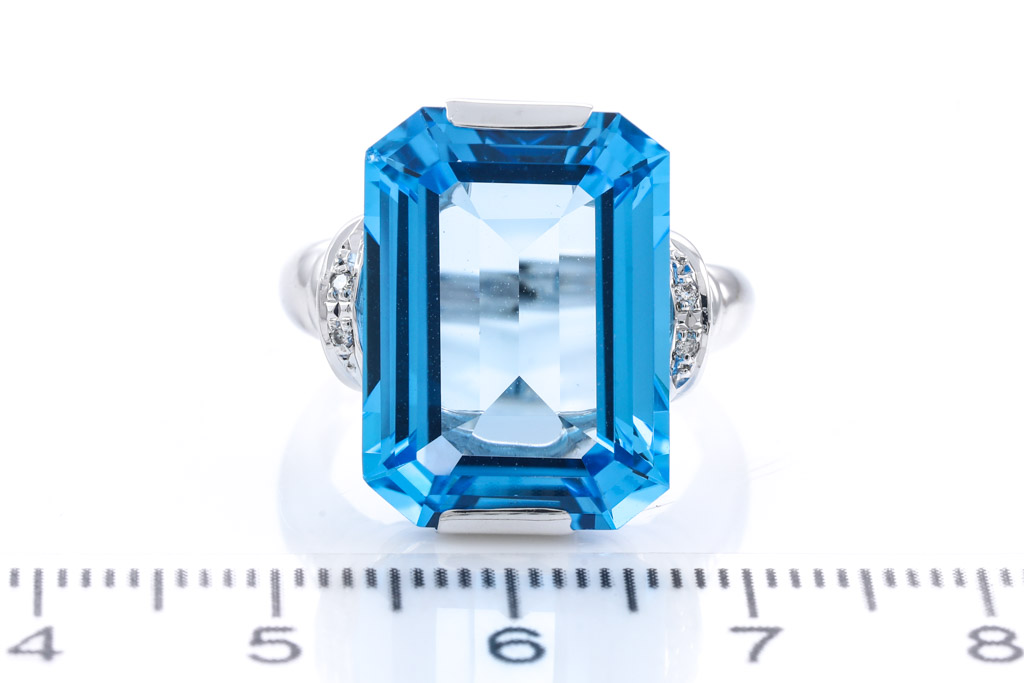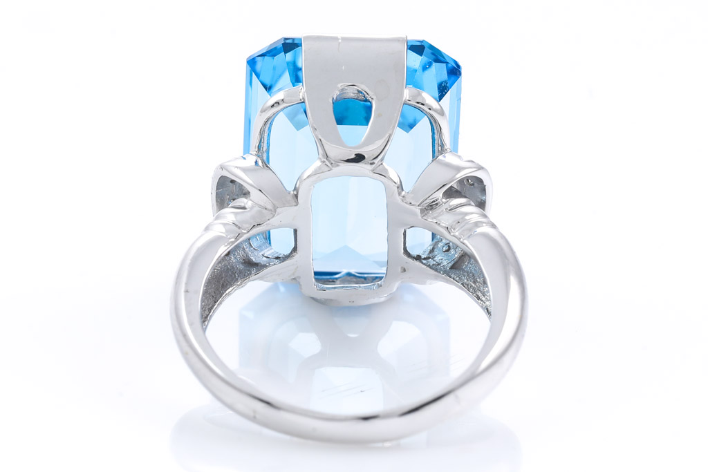 Topaz and Diamond ring with emerald cut blue Topaz of 17.20ct and Diamonds totalling 0.03cts. 18ct white gold. Ring size L1/2. Weight: 8.8g. (Pre-owned)