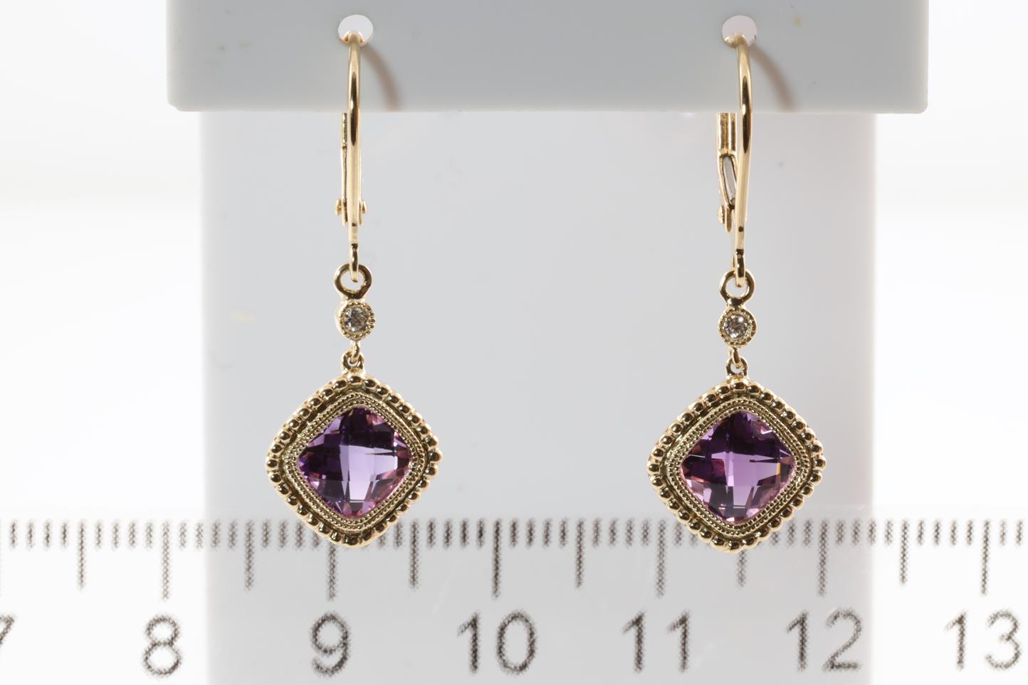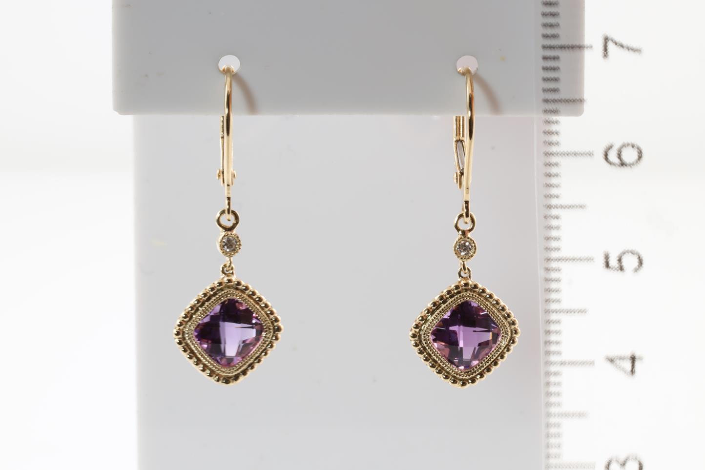Amethyst and Diamond leverback earrings with cushion checkerboard cut Amethysts totalling 1.72cts and Diamonds totalling 0.03cts. 14ct Yellow gold. Weight 2.54g (New)