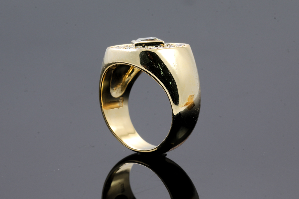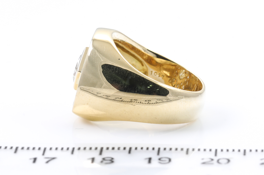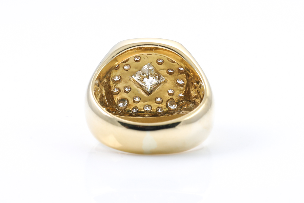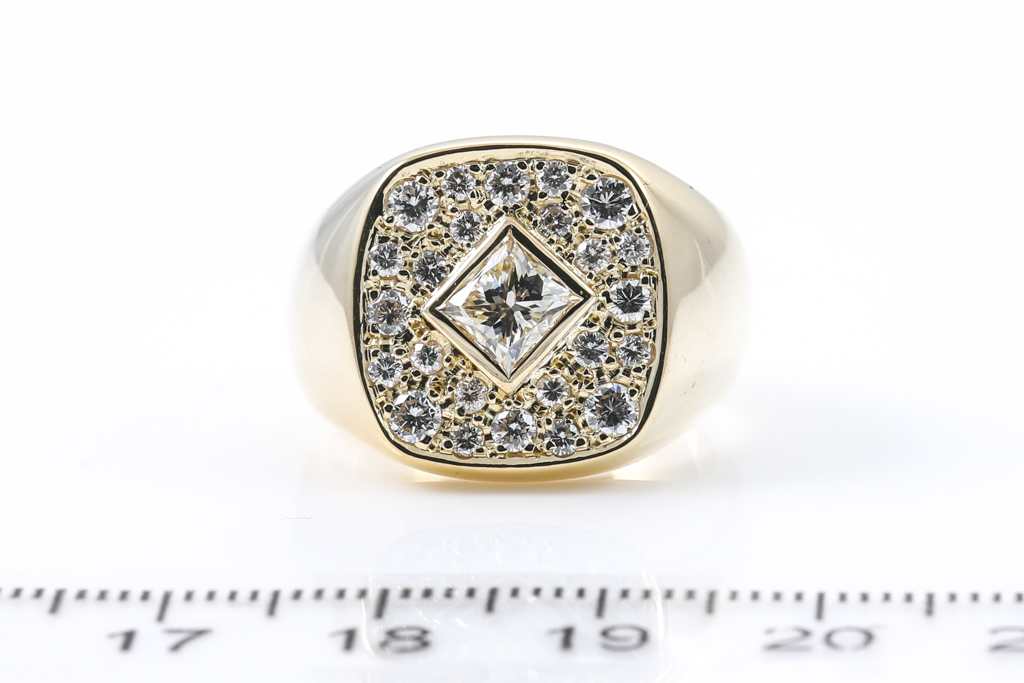 Mens ring with princess and round cut Diamonds totalling 1.72cts (Estimated grading: H VS-SI). 18ct yellow gold. Ring size Q. Weight: 18.8g. With Certificate #416220. (Pre-owned)