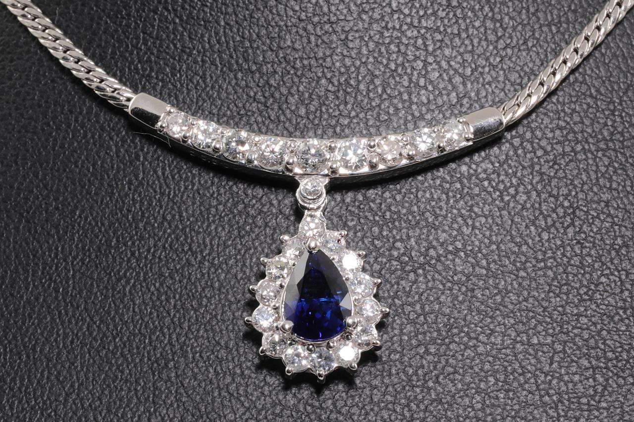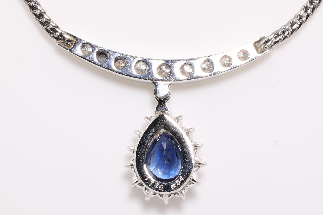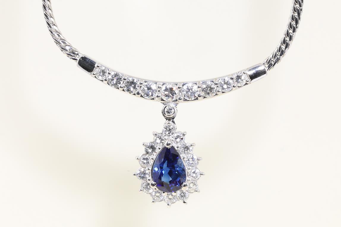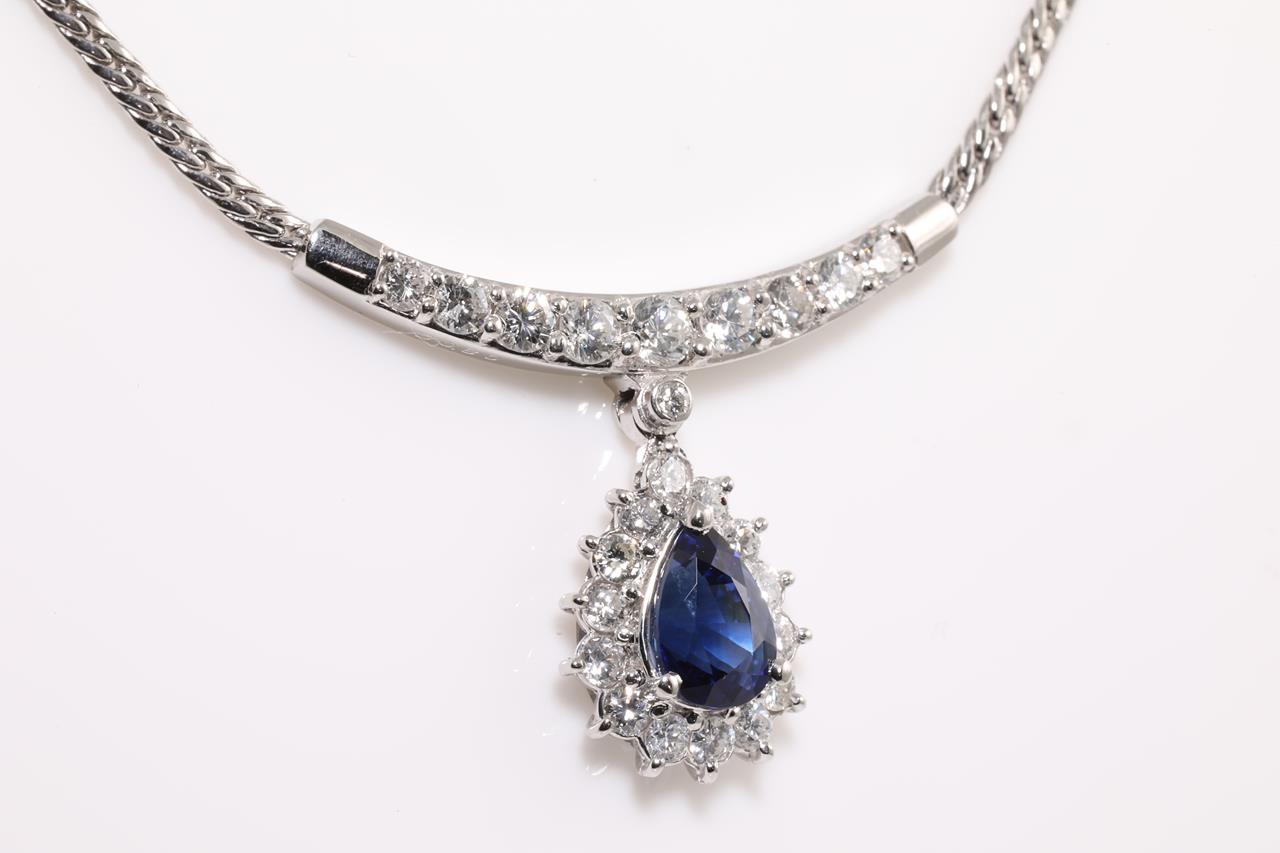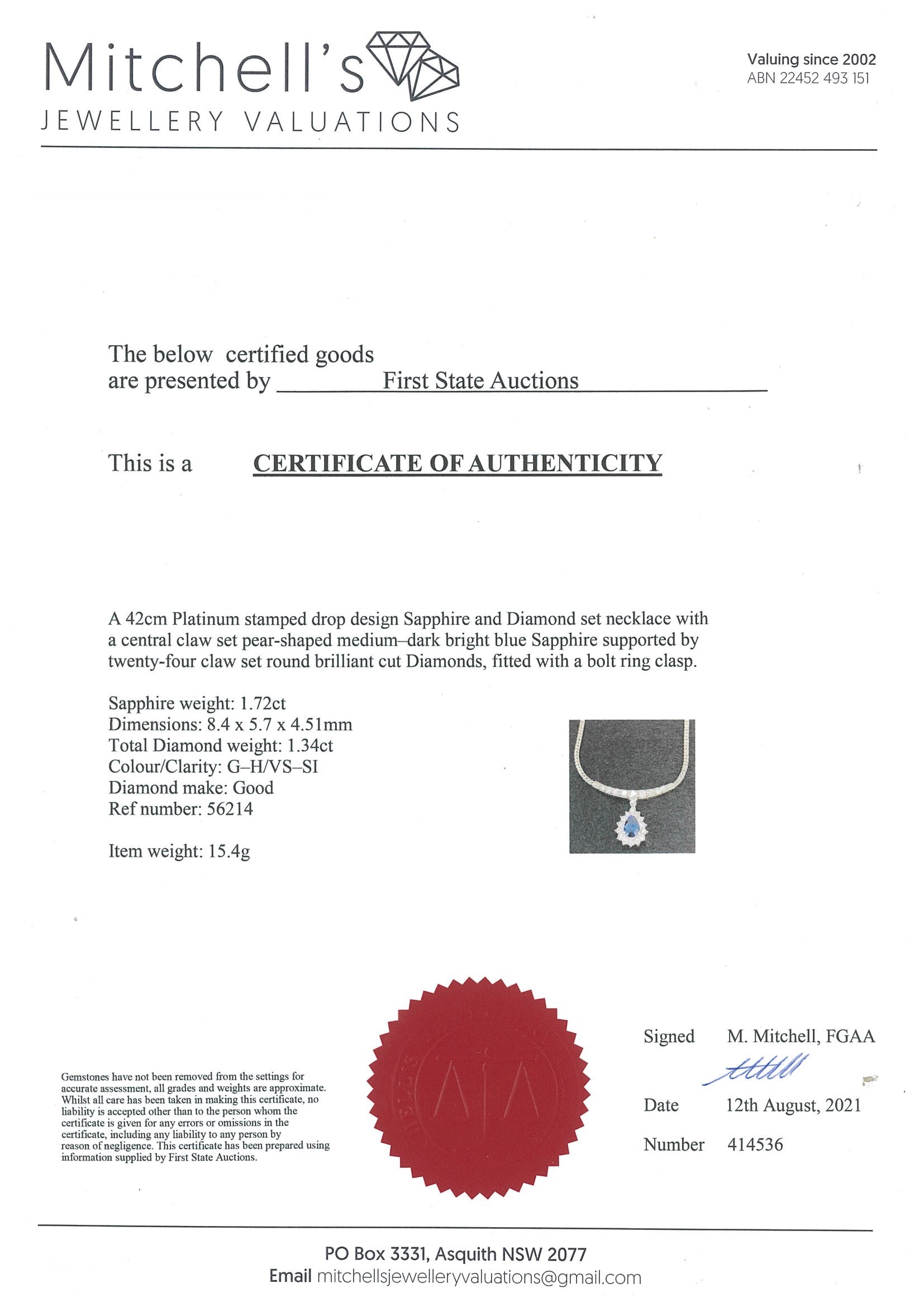 Sapphire and Diamond necklace with a pear shape Sapphire of 1.72ct and Diamonds totalling 1.34cts (Estimated grading: G-H VS-SI). Platinum. Length: 42cm. Weight: 15.4g. With certificate #414536. (As New)