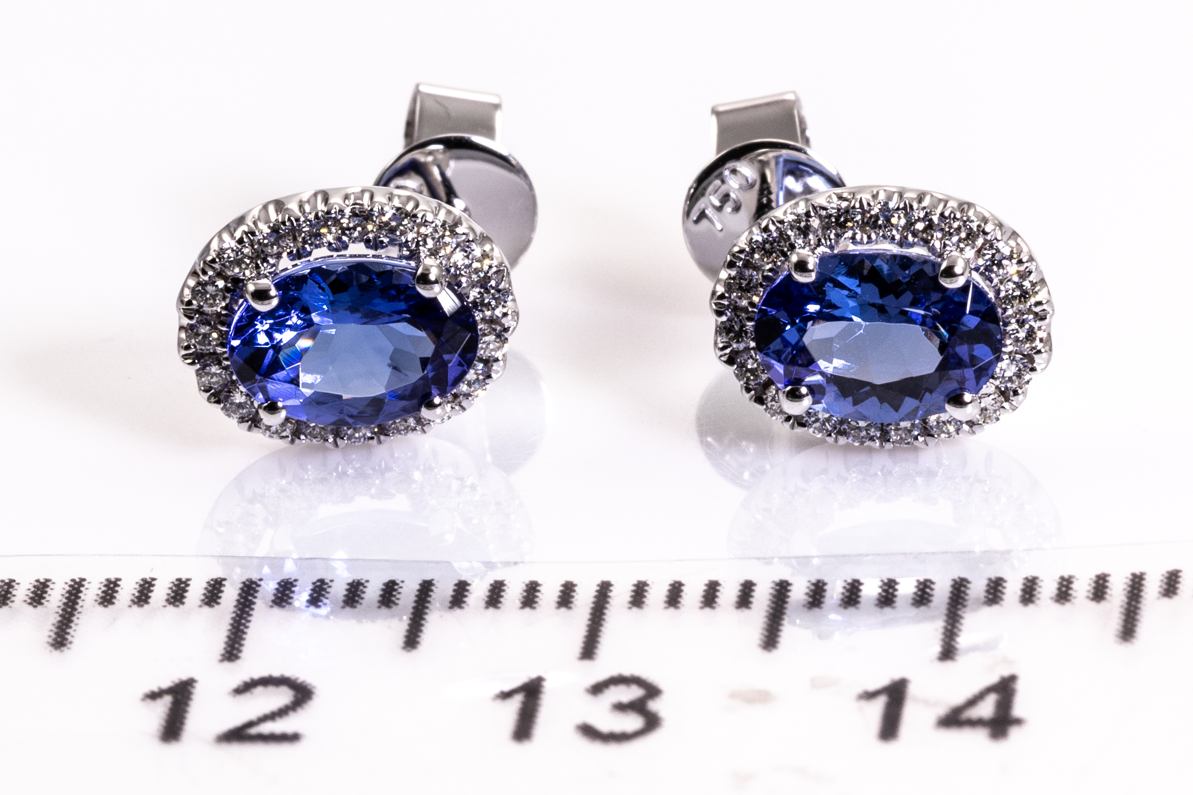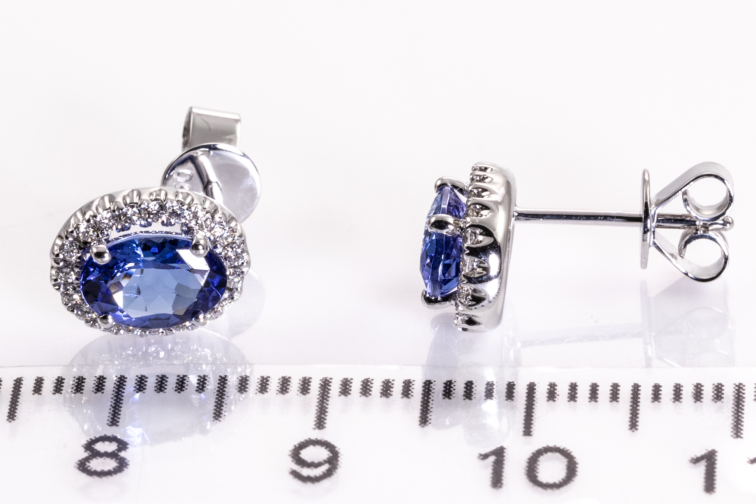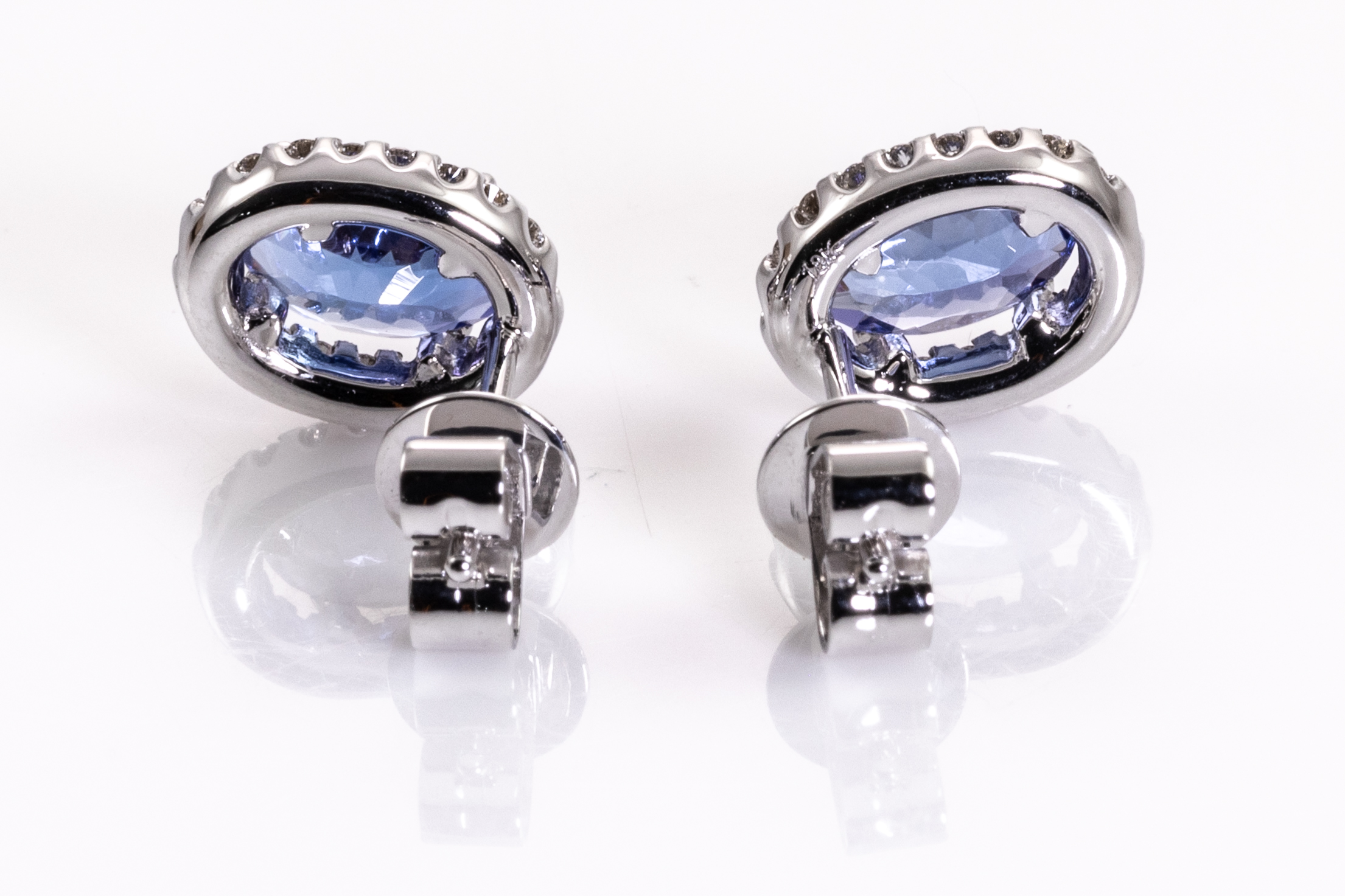 Tanzanite and Diamond earrings with oval shape Tanzanites totalling 1.72cts and Diamonds totalling 0.23cts. 18ct white gold. Weight: 2.9g. (New)