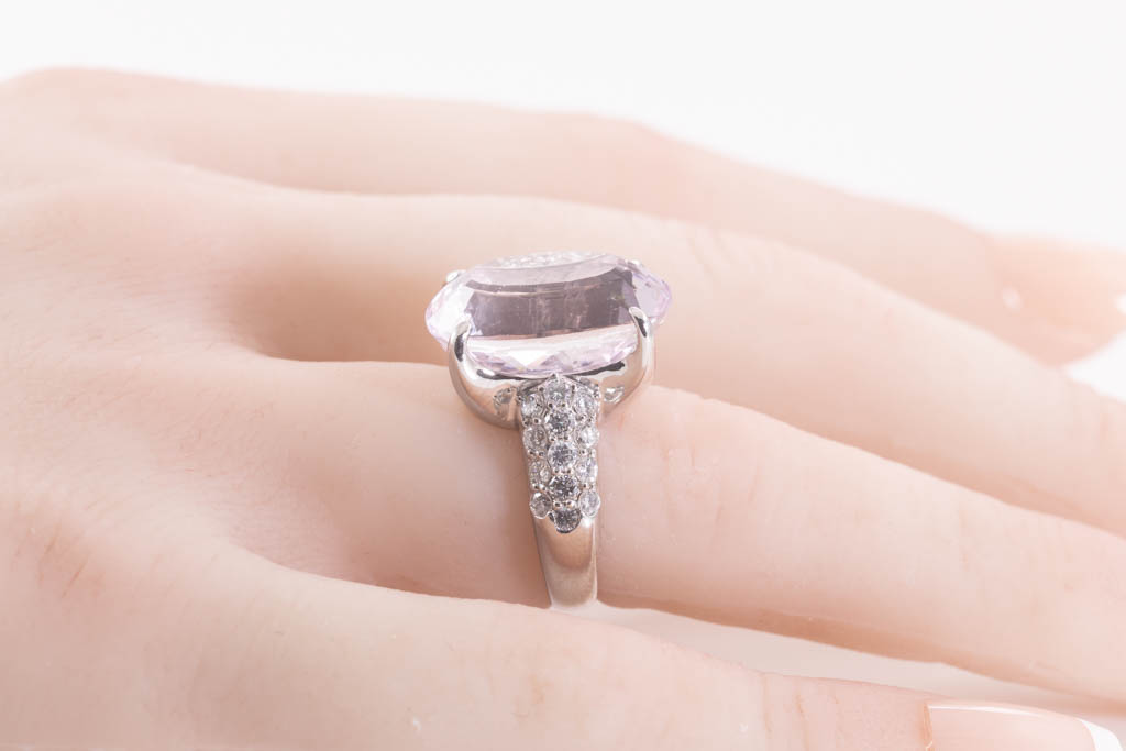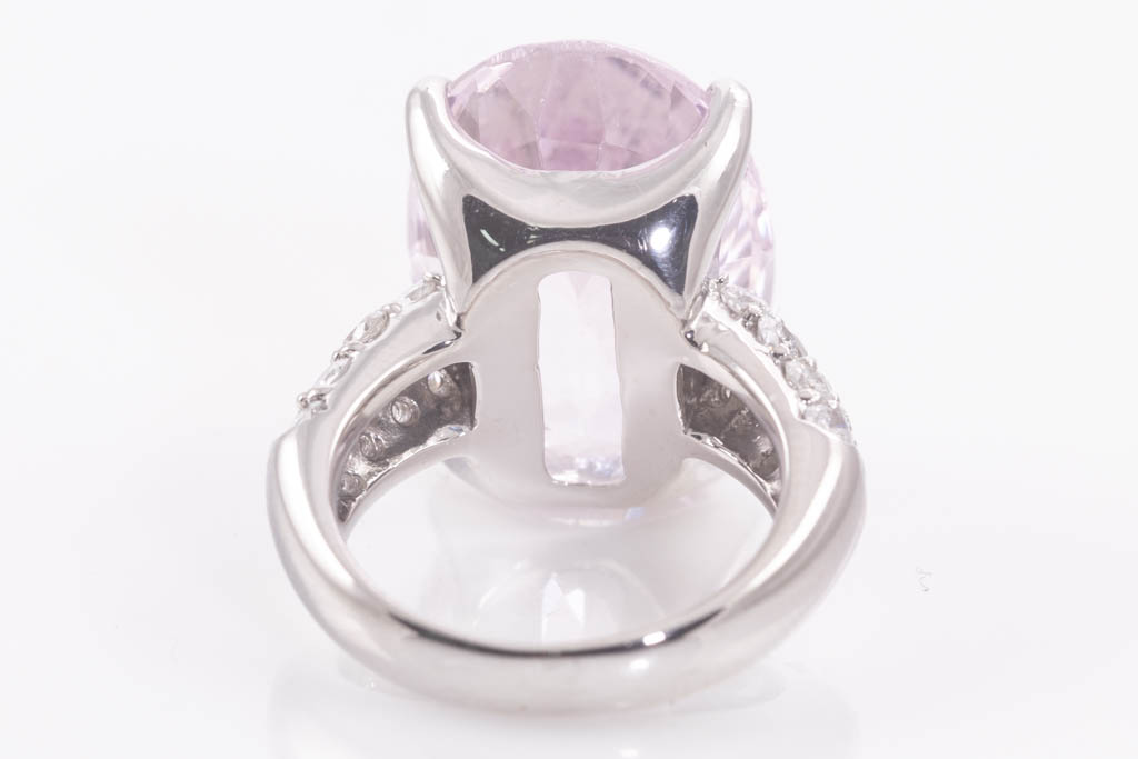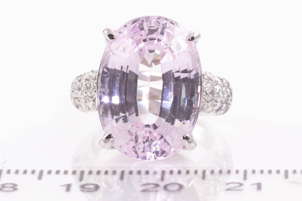 Kunzite and Diamond ring with oval shape Kunzite of 17.37ct and round Diamonds totalling 0.94cts (Estimated grading: G SI). Platinum. Ring size: H1/2 - ring resizing is not recommended. Weight: 15.0g. (Pre-owned)