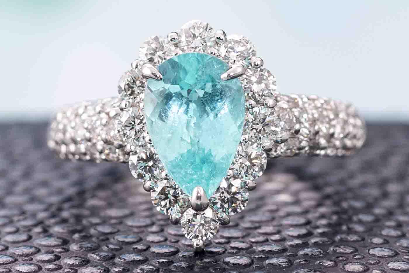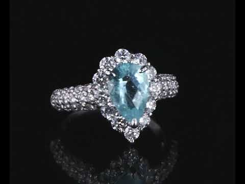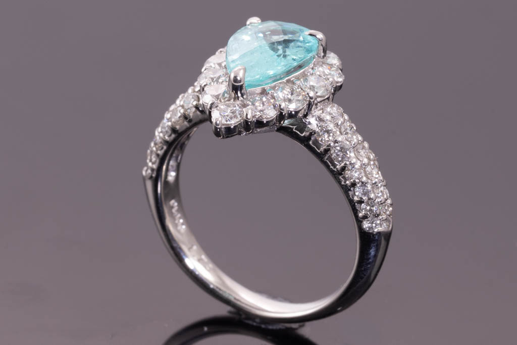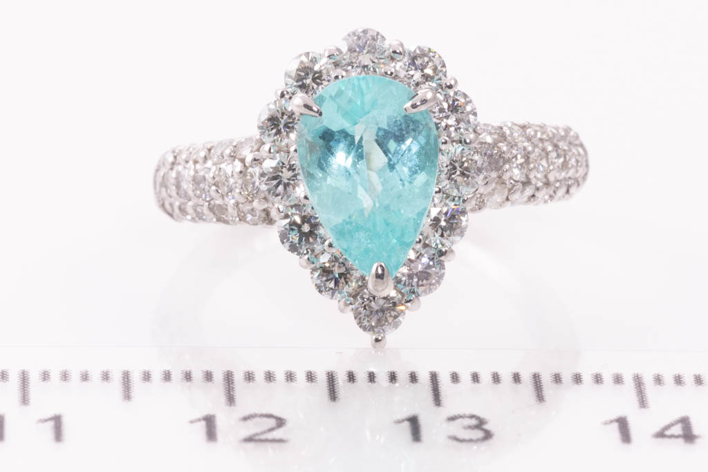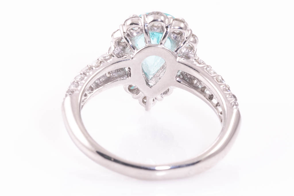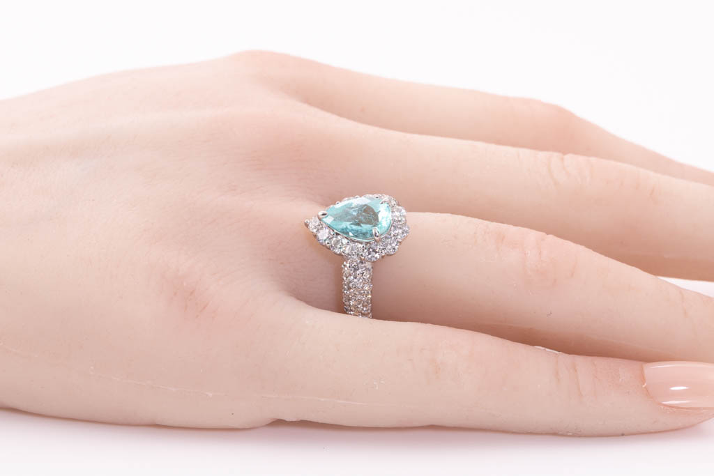 Paraiba Tourmaline and Diamond ring with pear shape Paraiba Tourmaline of 1.73ct and round Diamonds totalling 1.54cts (Estimated grading: G-H SI). Platinum. Ring size N. Weight: 8.2g. With Certificate (Pre-owned)