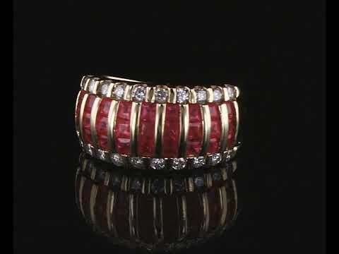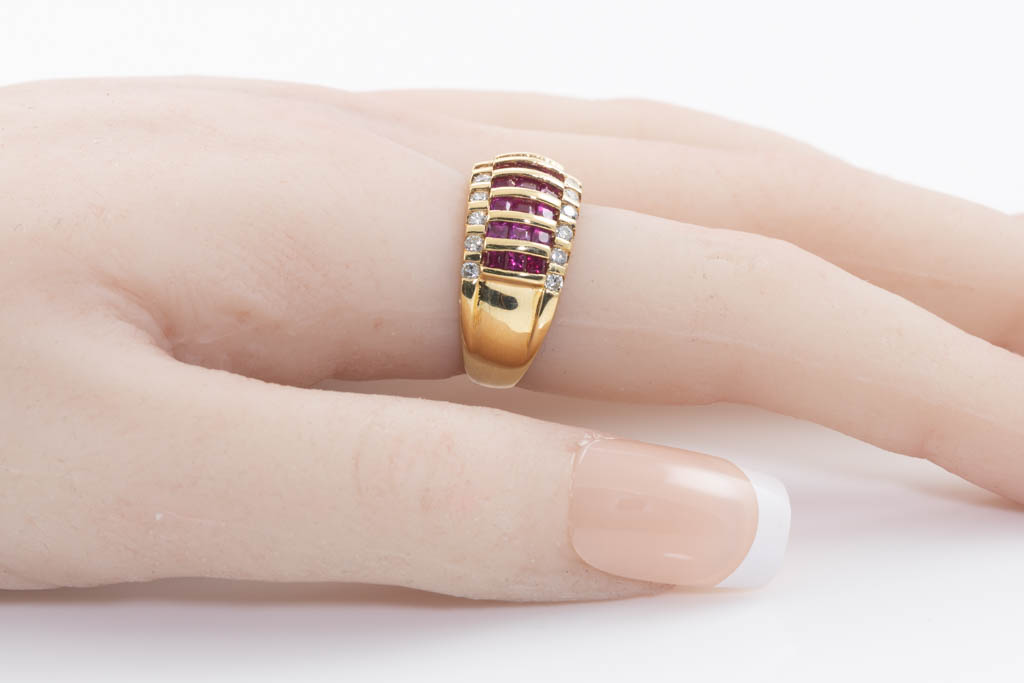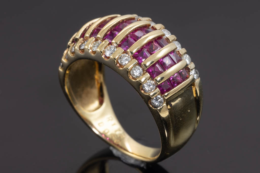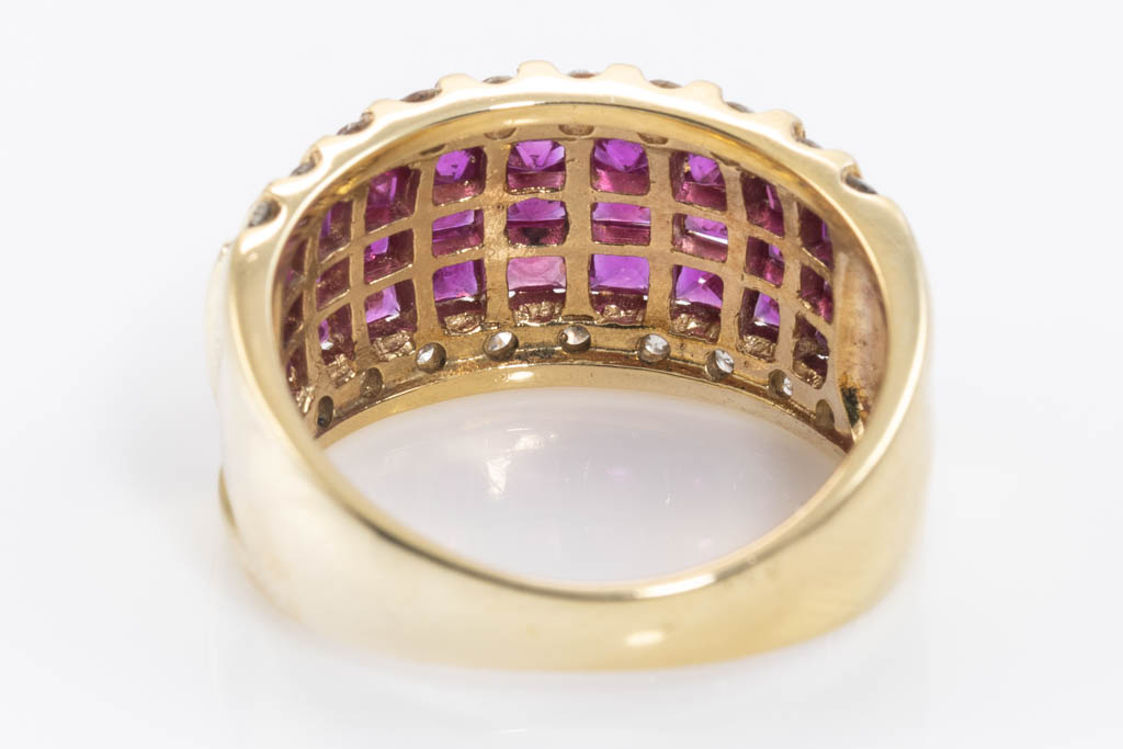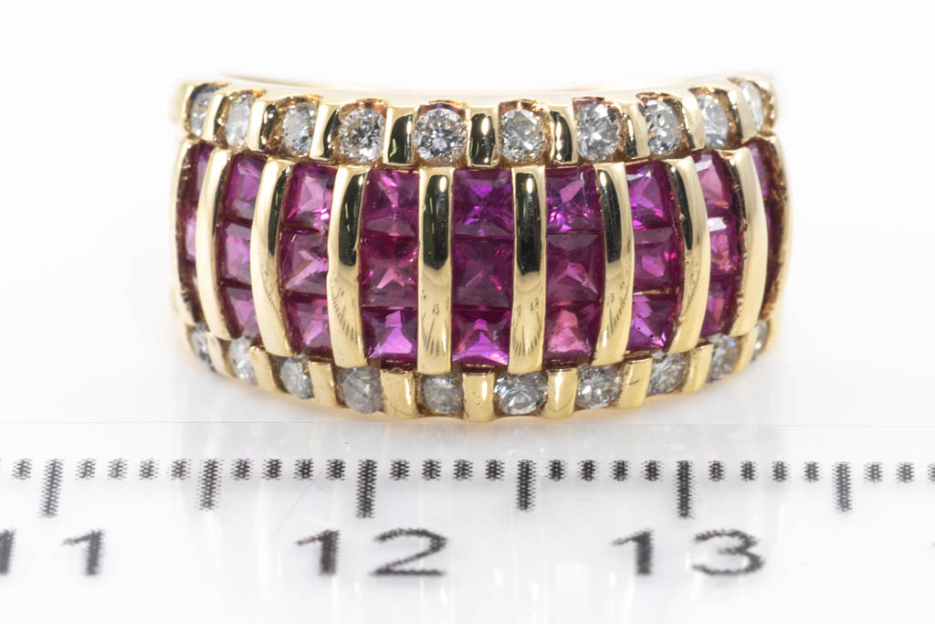 Ruby and Diamond ring with princess cut Rubies totalling 1.73cts and round Diamonds totalling 0.50cts (Estimated grading: I SI-P1). 18ct yellow gold. Ring Size M - ring resize is not recommended. Weight: 7.3g. (Pre-owned)