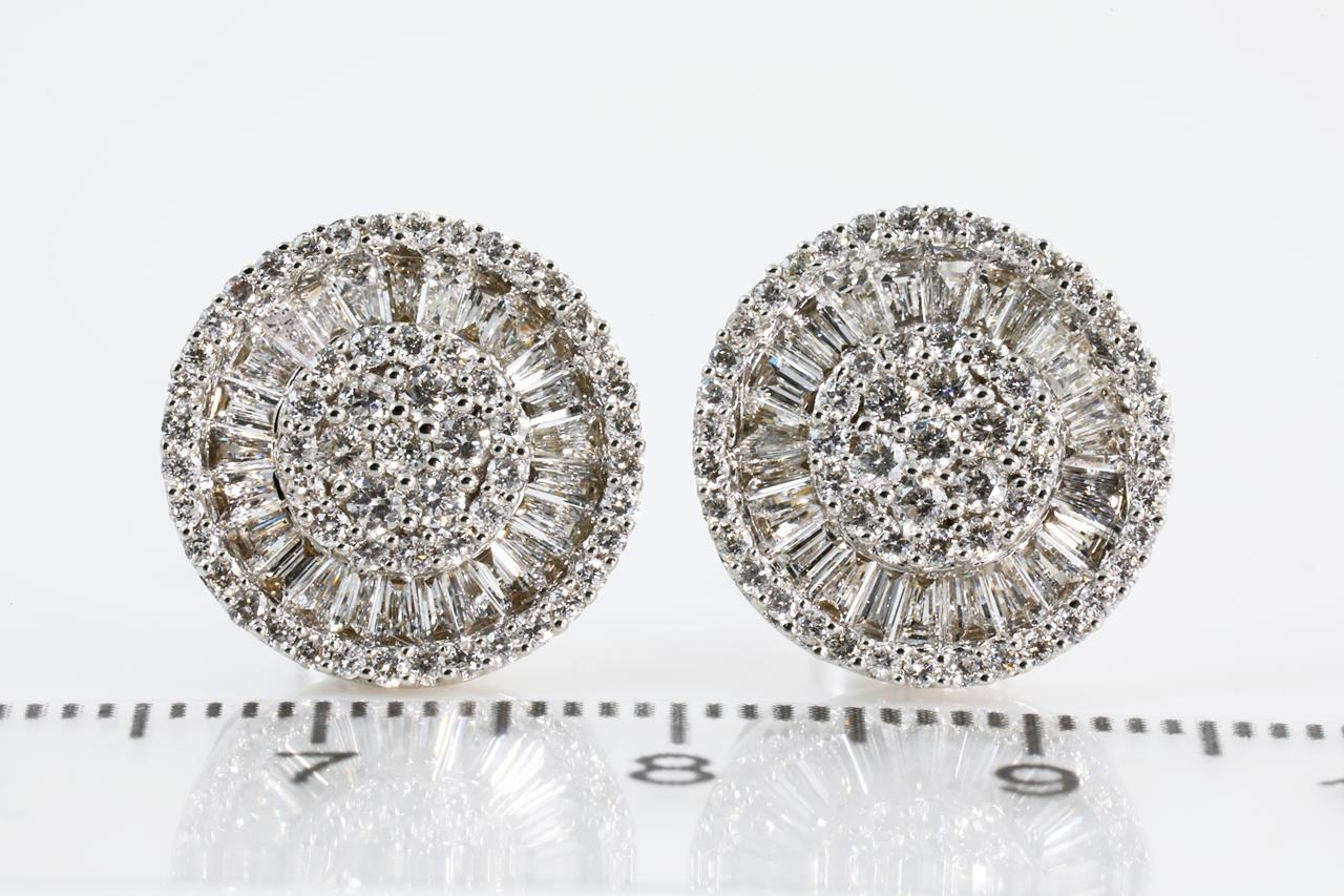 Diamond earrings with round Diamonds totalling 0.79cts and baguette cut Diamonds totalling 0.95cts (Estimated grading: H SI). 14ct White gold. Weight: 4.3g (New)