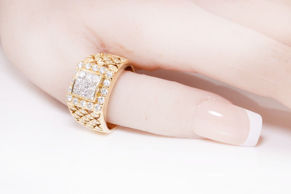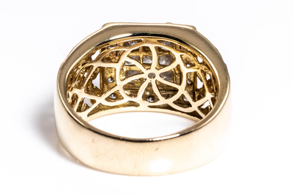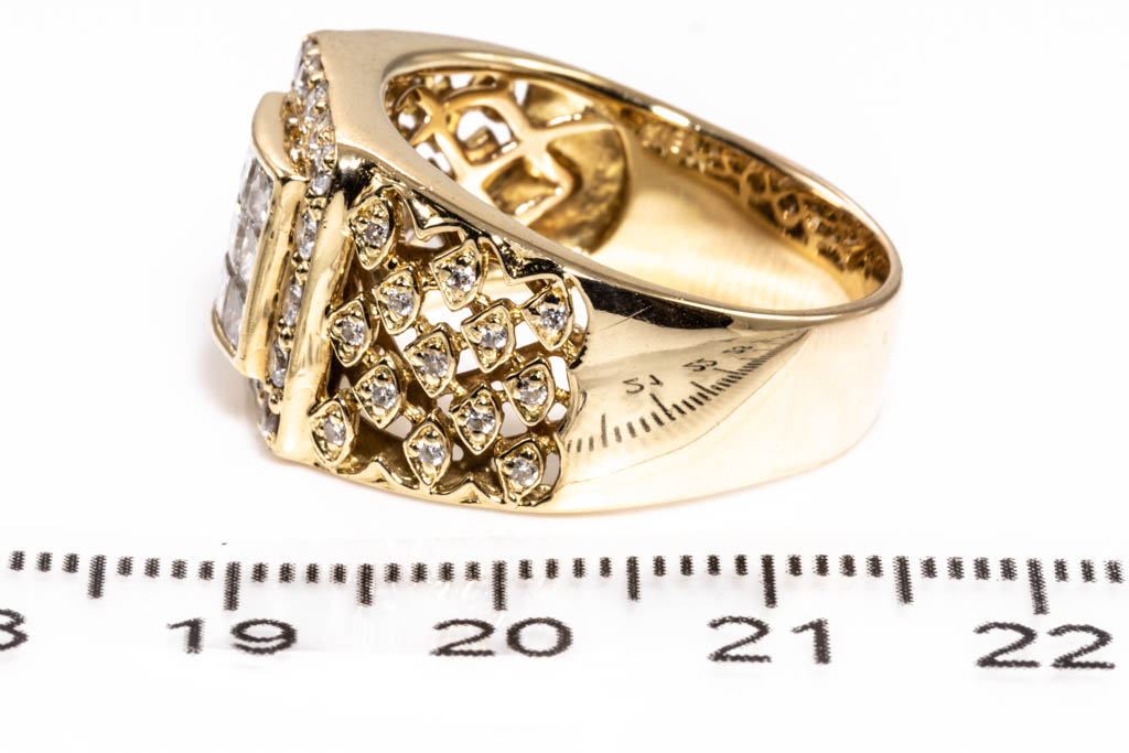 Diamond Mens ring with round and princess cut Diamonds totalling 1.74cts (Estimated grading: H VS-SI). 18ct yellow gold. Ring size: T . Weight: 11.1g. (Pre-owned)