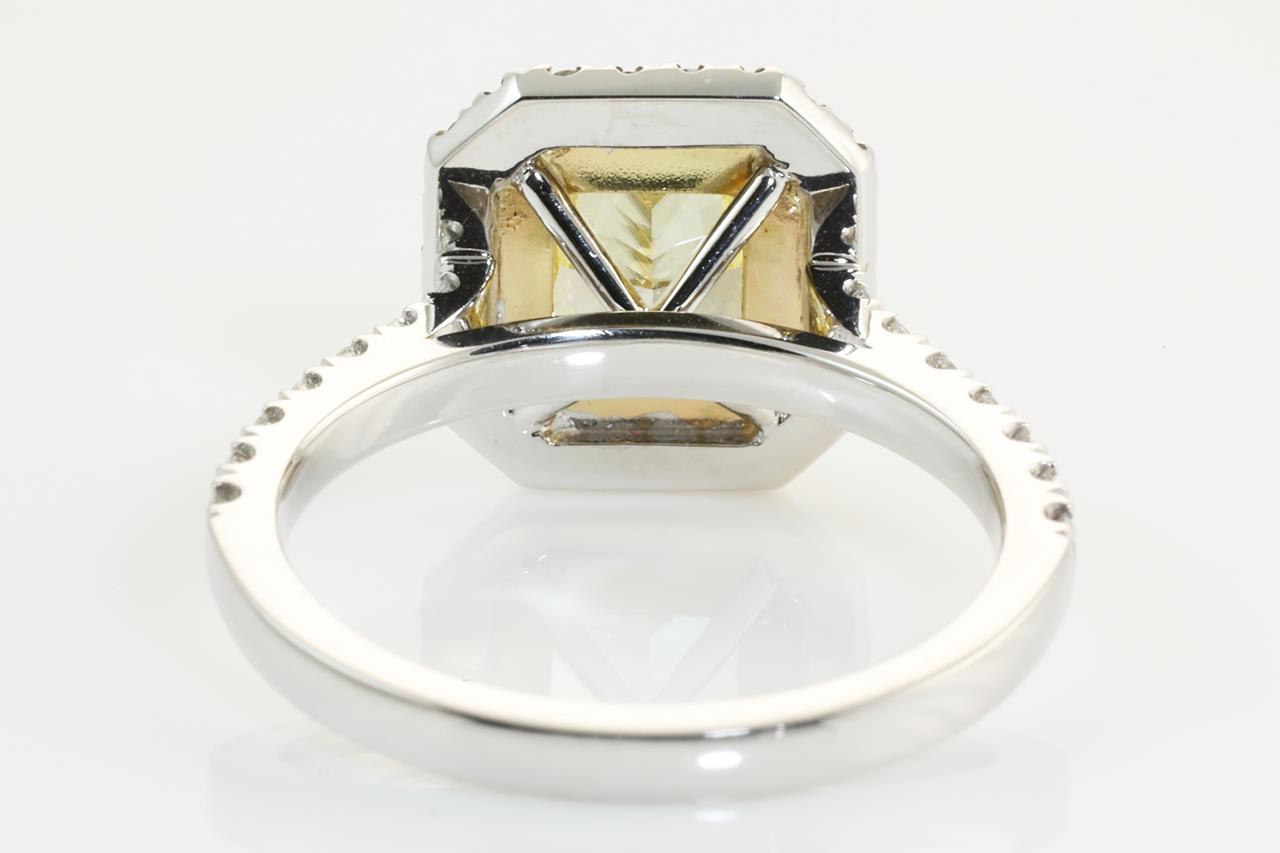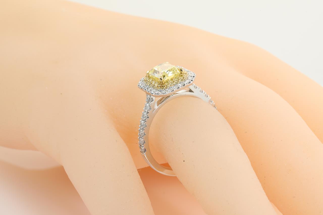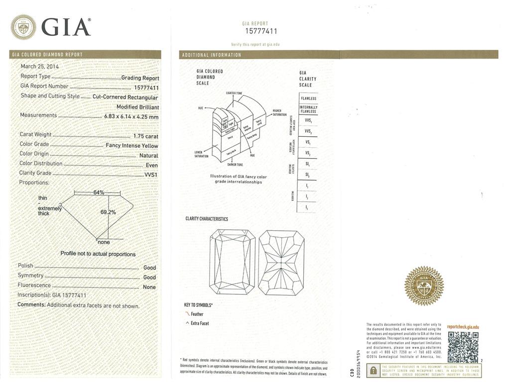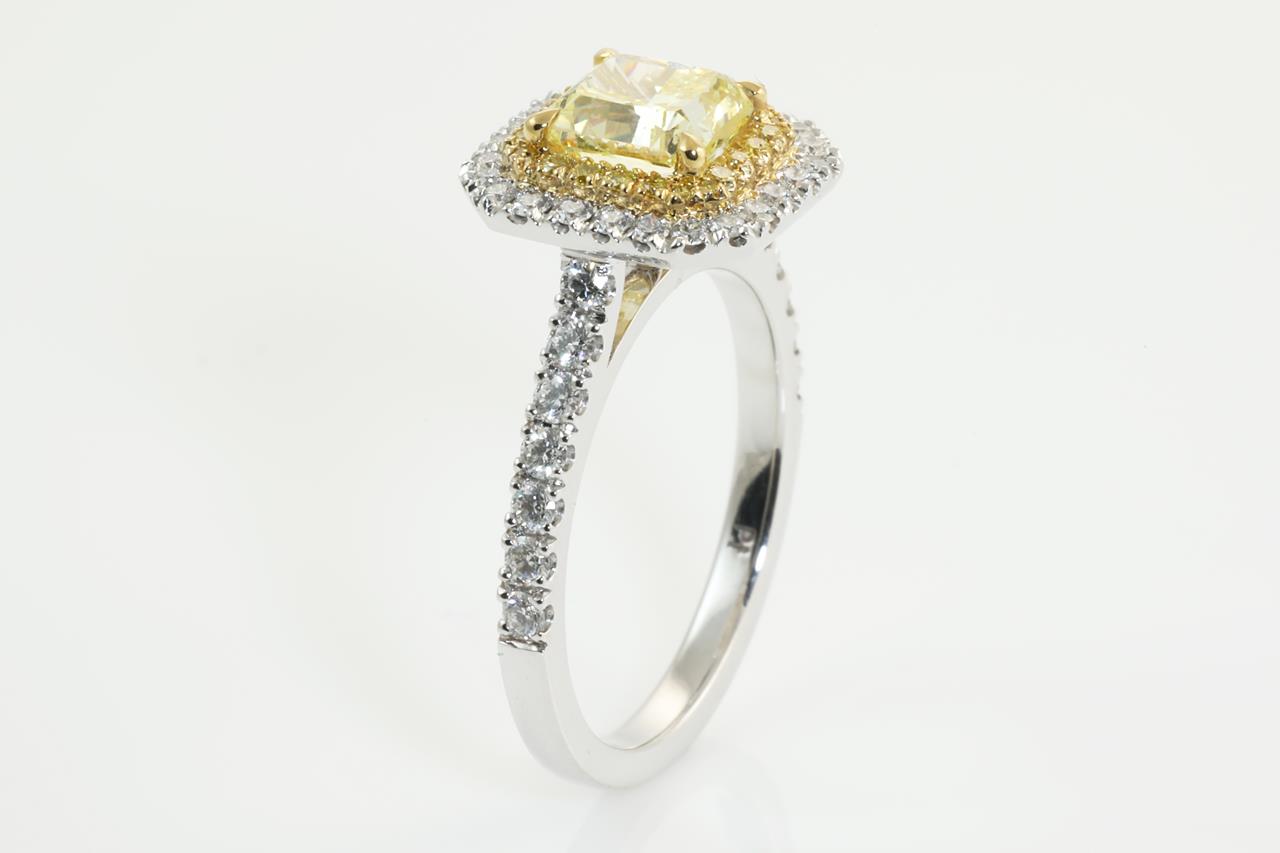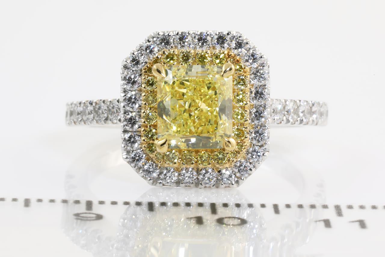 Diamond halo ring with radiant cut (cut-cornered rectangular modified brilliant) Diamond of 1.75ct (with GIA report graded as Natural Fancy Intense Yellow Even VVS1 #15777411) with surrounding yellow Diamonds totalling approximately 0.18cts and white Diamonds totalling approximately 0.80cts (Estimated grading: G VS-SI). Platinum. Ring size: Q. Weight: 8.3g (Pre-owned)