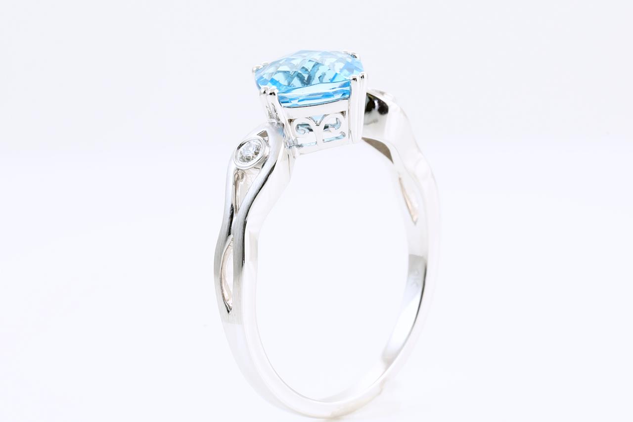 Topaz and Diamond ring with cushion checkerboard cut Blue Topaz of 1.77ct and Diamonds totalling 0.05cts. 9ct white gold. Ring size N1/2. Weight: 2.19g (New)