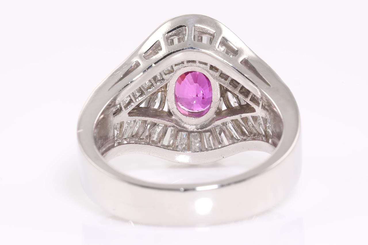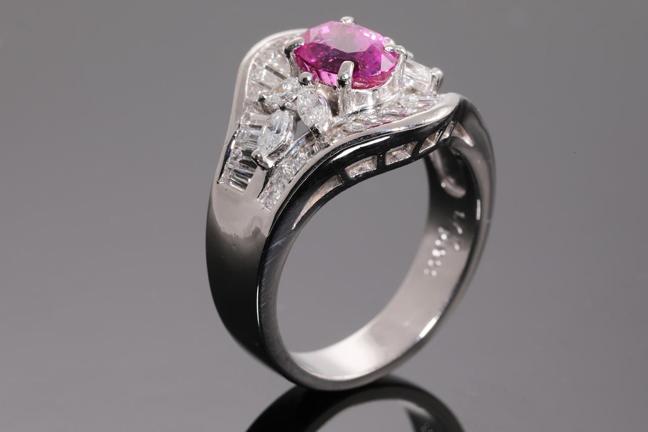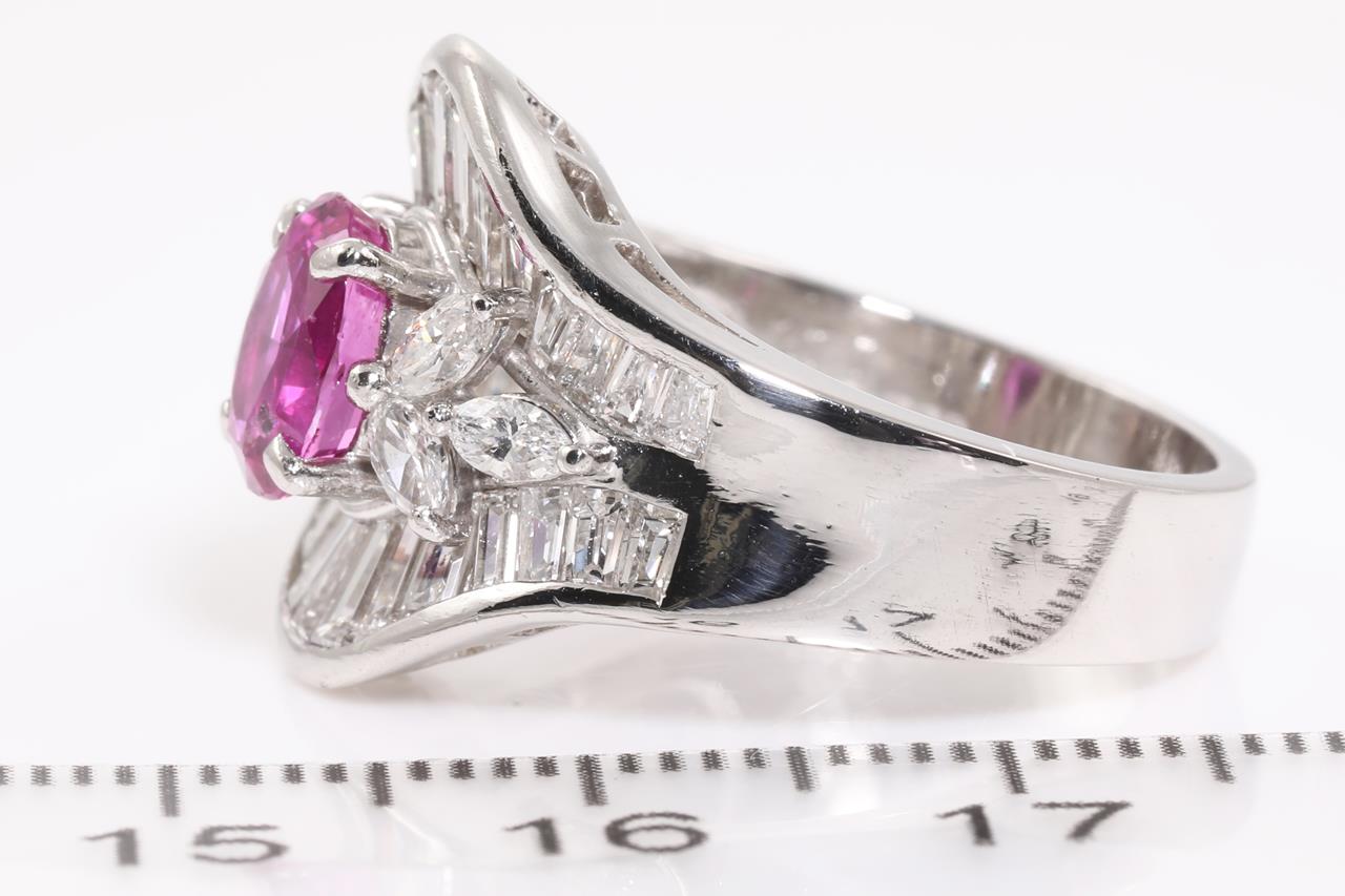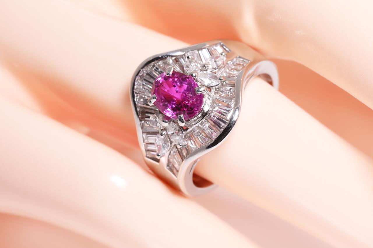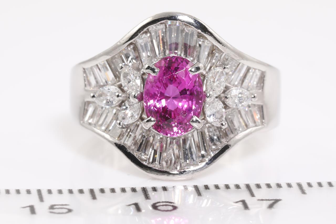 Sapphire and Diamond ring with an oval pink Sapphire of 1.77ct with round and marquise cut Diamonds totalling 1.99cts (Estimated grading: F-G VS-SI). Platinum. Ring size N1/2 - ring resizing is not recommended. Weight: 12.3g. (Pre-owned)
