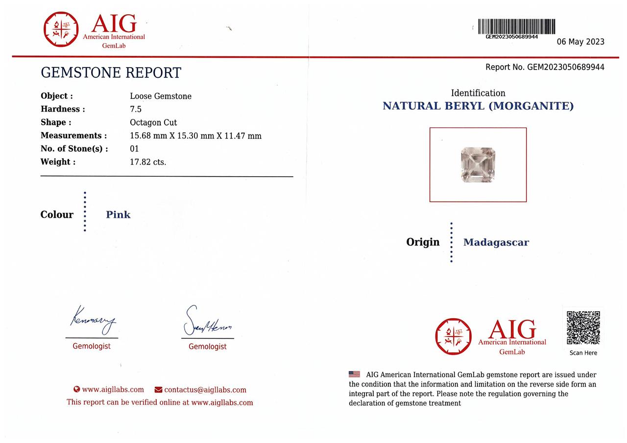 A loose octagonal cut Madagascan Morganite of 17.82ct (with AIG Gemstone Report #GEM2023050689944). (As New)