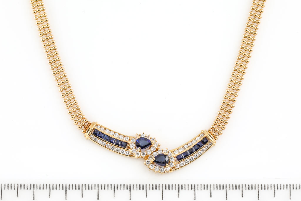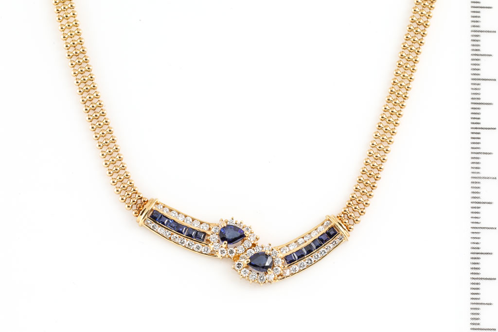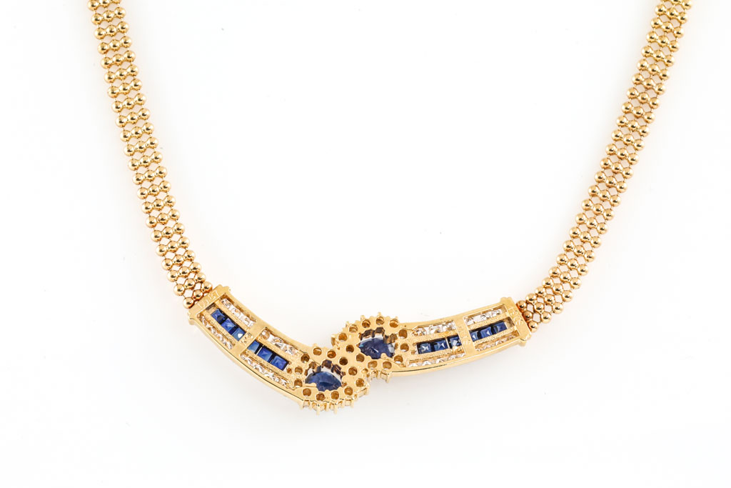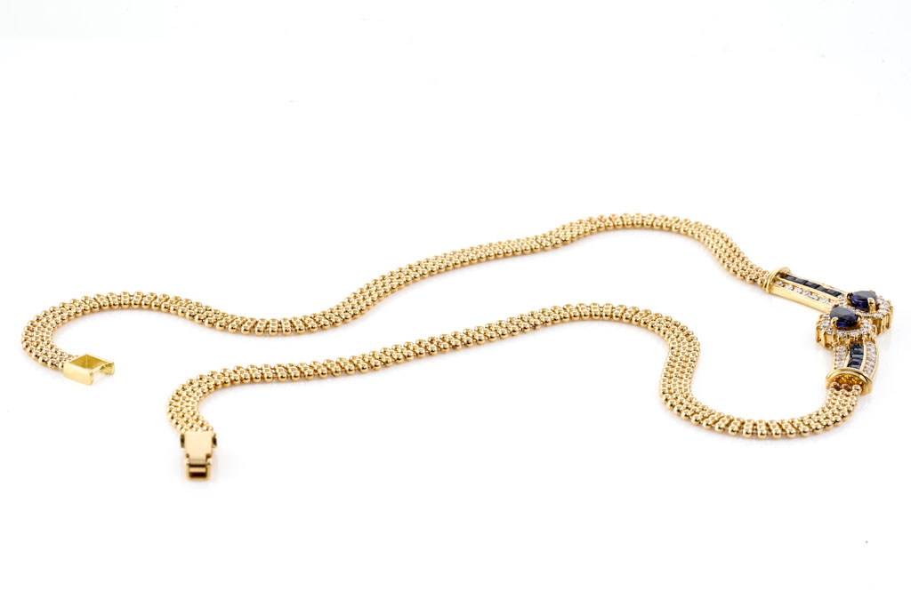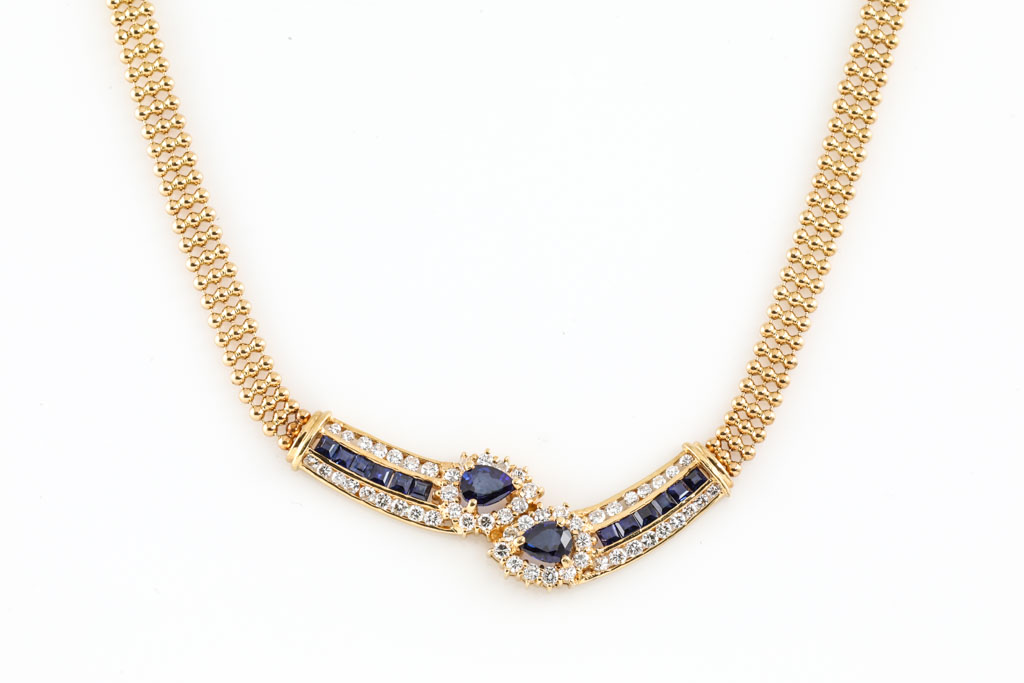 Sapphire and Diamond necklace with 2 central pear shape sapphires and square cut sapphires totalling 1.78cts and round Diamonds totalling 0.87cts (Estimated grading: H SI). 18ct yellow gold. Length: 40cm. Weight: 15.1g. (Pre-owned)