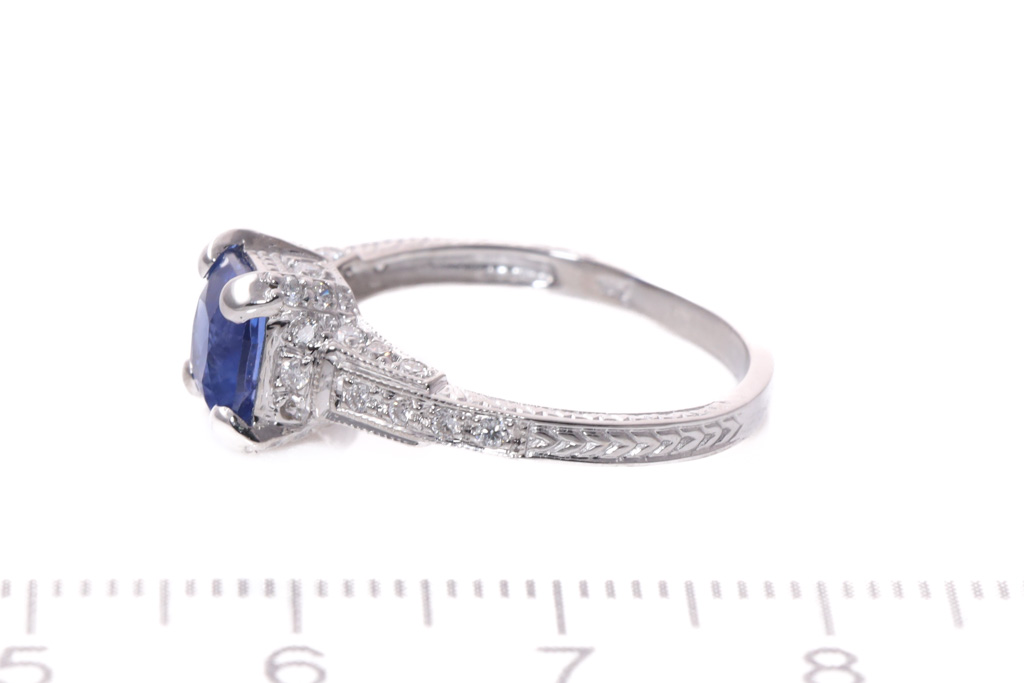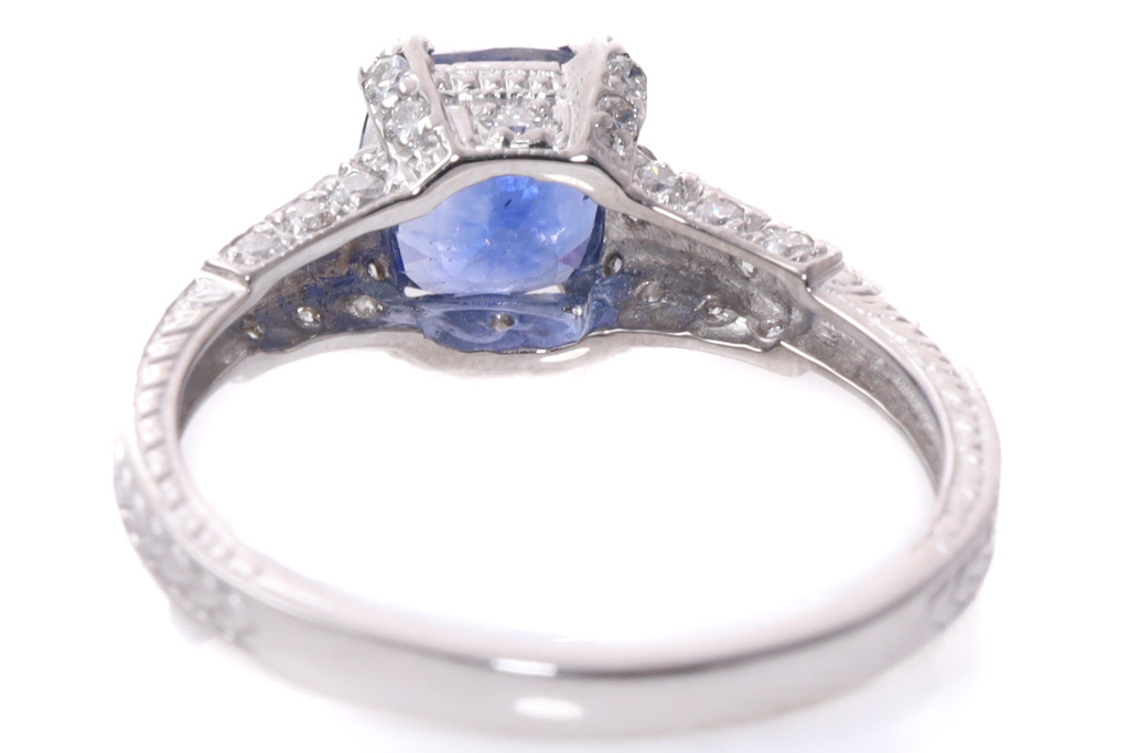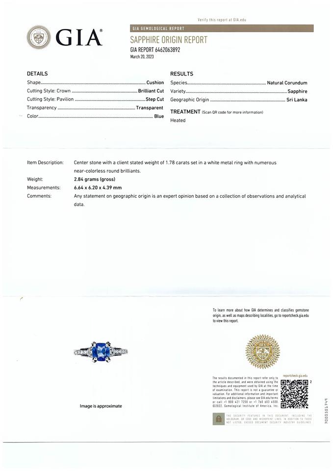 Sapphire and Diamond ring with an cushion cut Sri Lankan Blue Sapphire of 1.78ct and round Diamonds totalling 0.34cts (Estimated grading: G-H SI). 18ct white gold. Ring size: M1/2. Weight: 2.8g. With GIA Report # 6462063892. (Pre-owned)