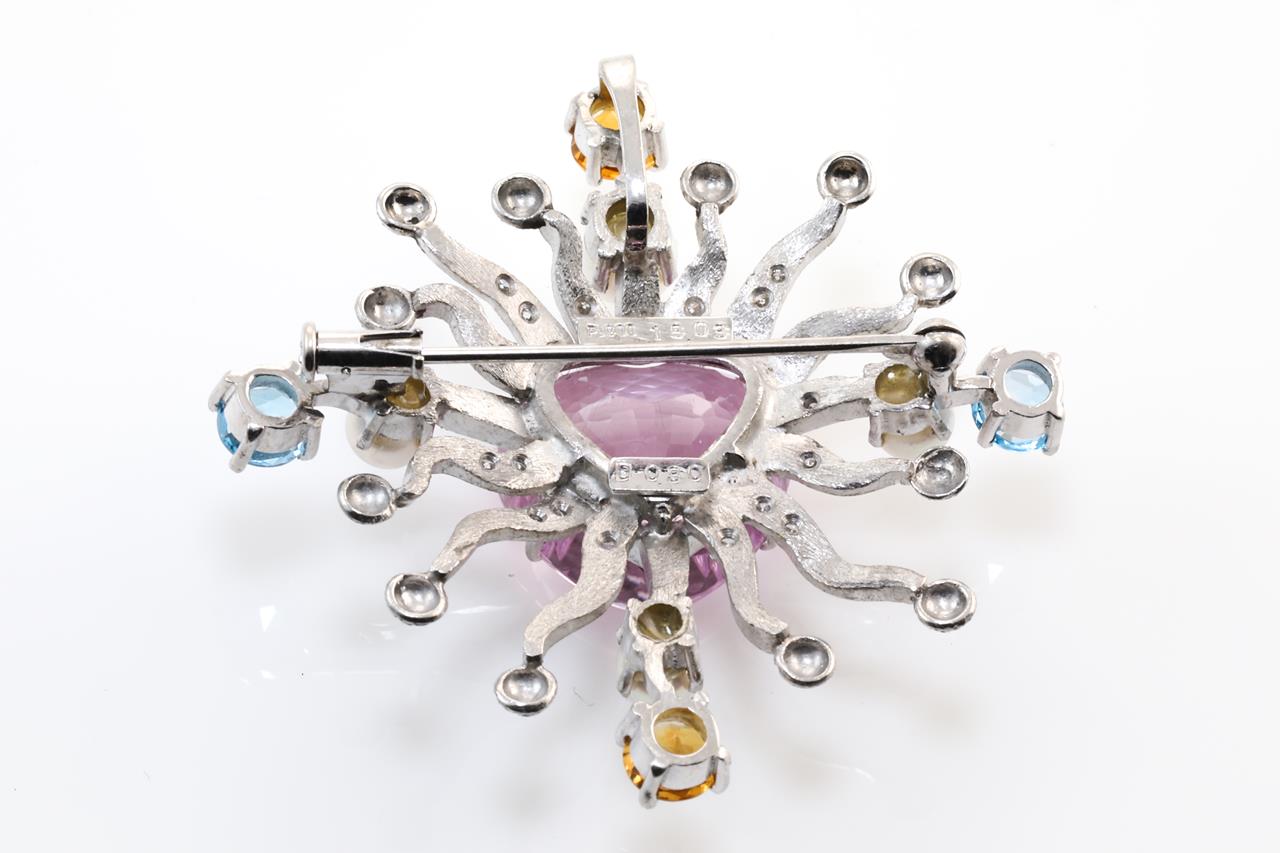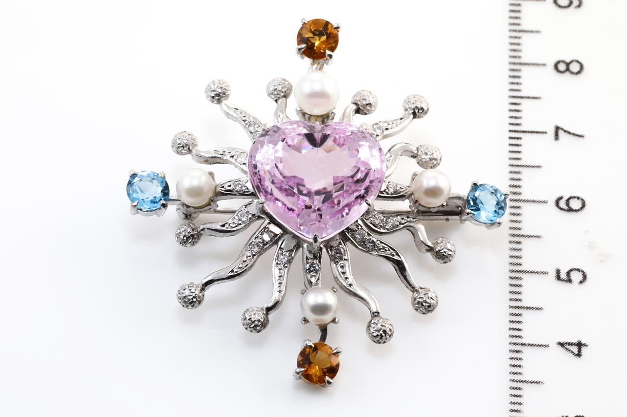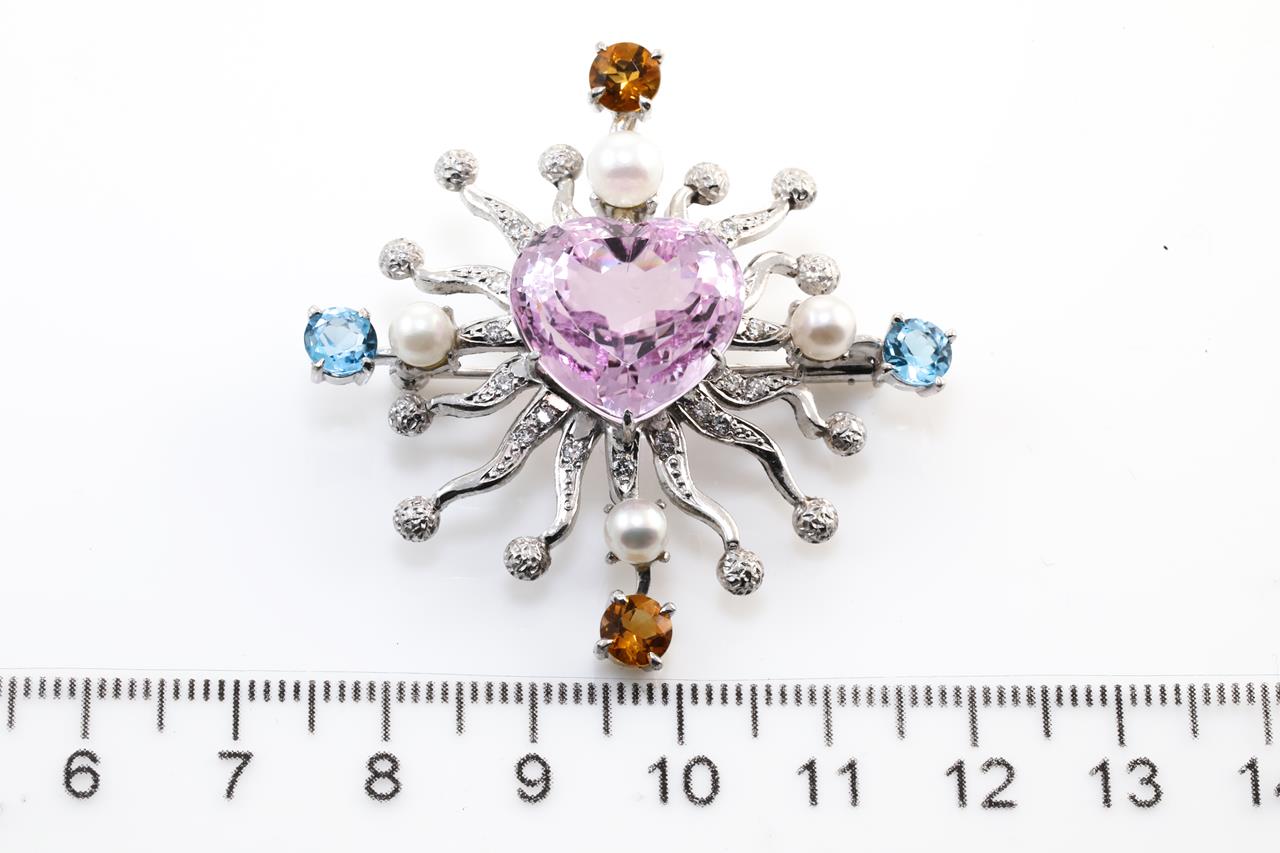 Kunzite, Topaz, Citrine, Pearl and Diamond brooch/pendant with heart shape Kunzite of 18.03ct, 2 round Citrines, 2 round Topaz, Cultured Pearls and Diamonds totalling 0.30cts (Estimated grading: H SI). Platinum. Weight: 19.1g (Pre-owned)