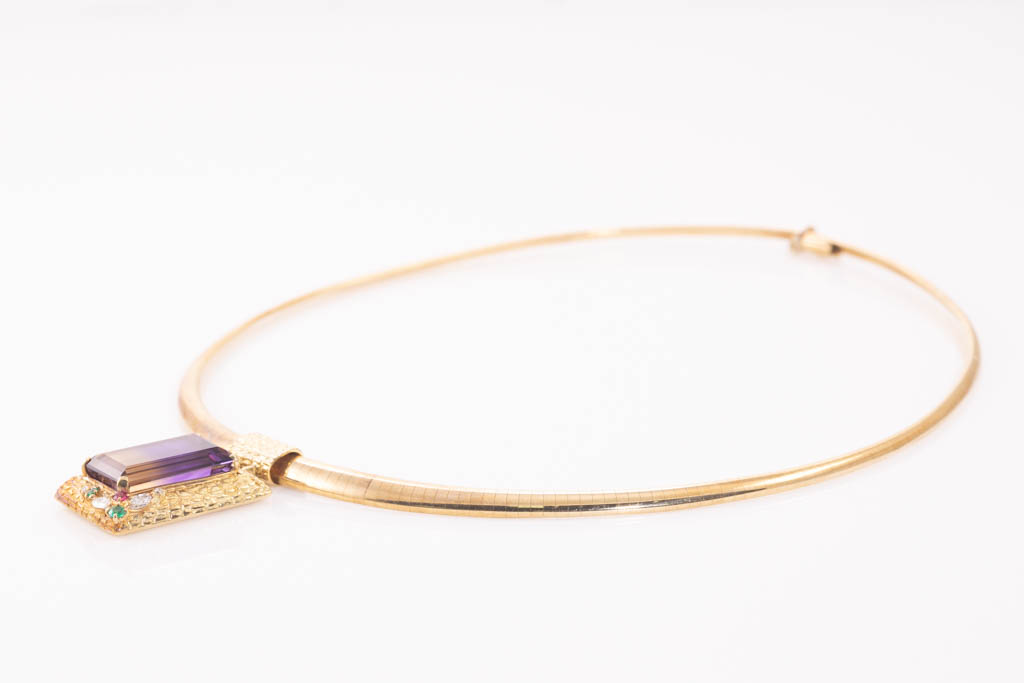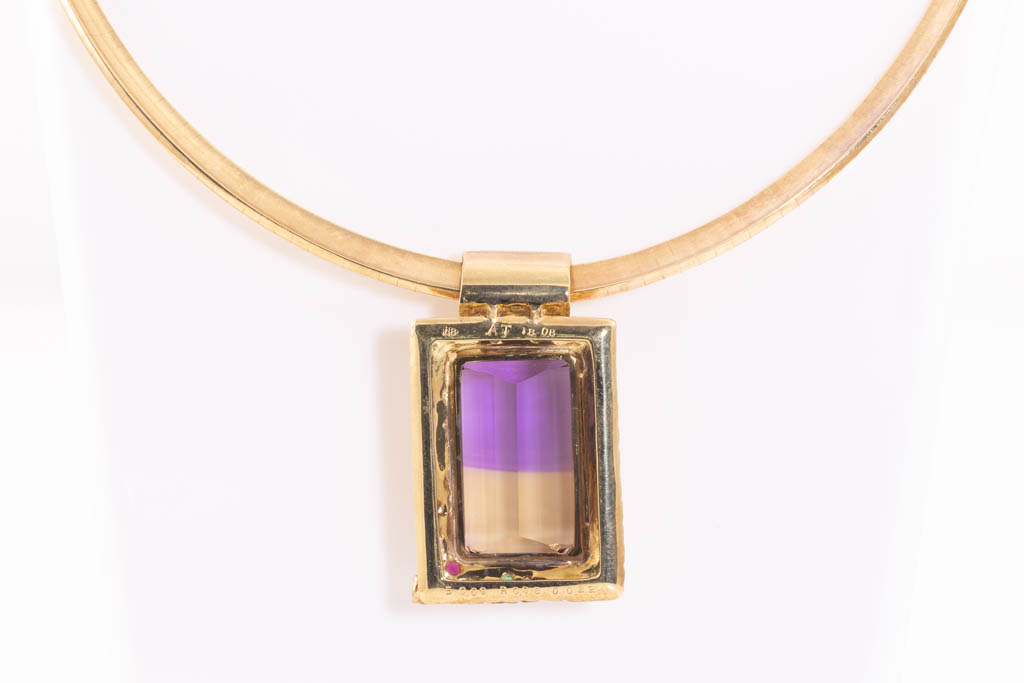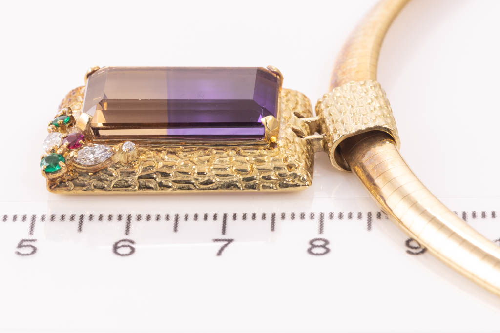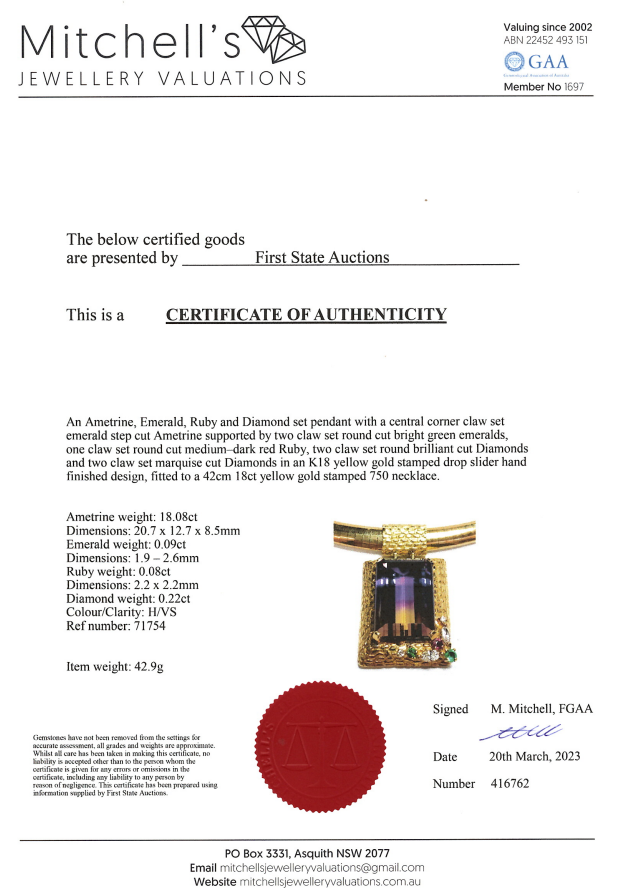 Ametrine and Diamond pendant with emerald cut Ametrine of 18.08ct, round Emerald totalling 0.09ct, round Ruby of 0.08ct and marquise cut & round Diamonds totalling 0.22cts. 18ct yellow gold with 18ct yellow gold omega style chain. Length: 42cm. Weight: 42.9g. With Certificate #416762. (Pre-owned)