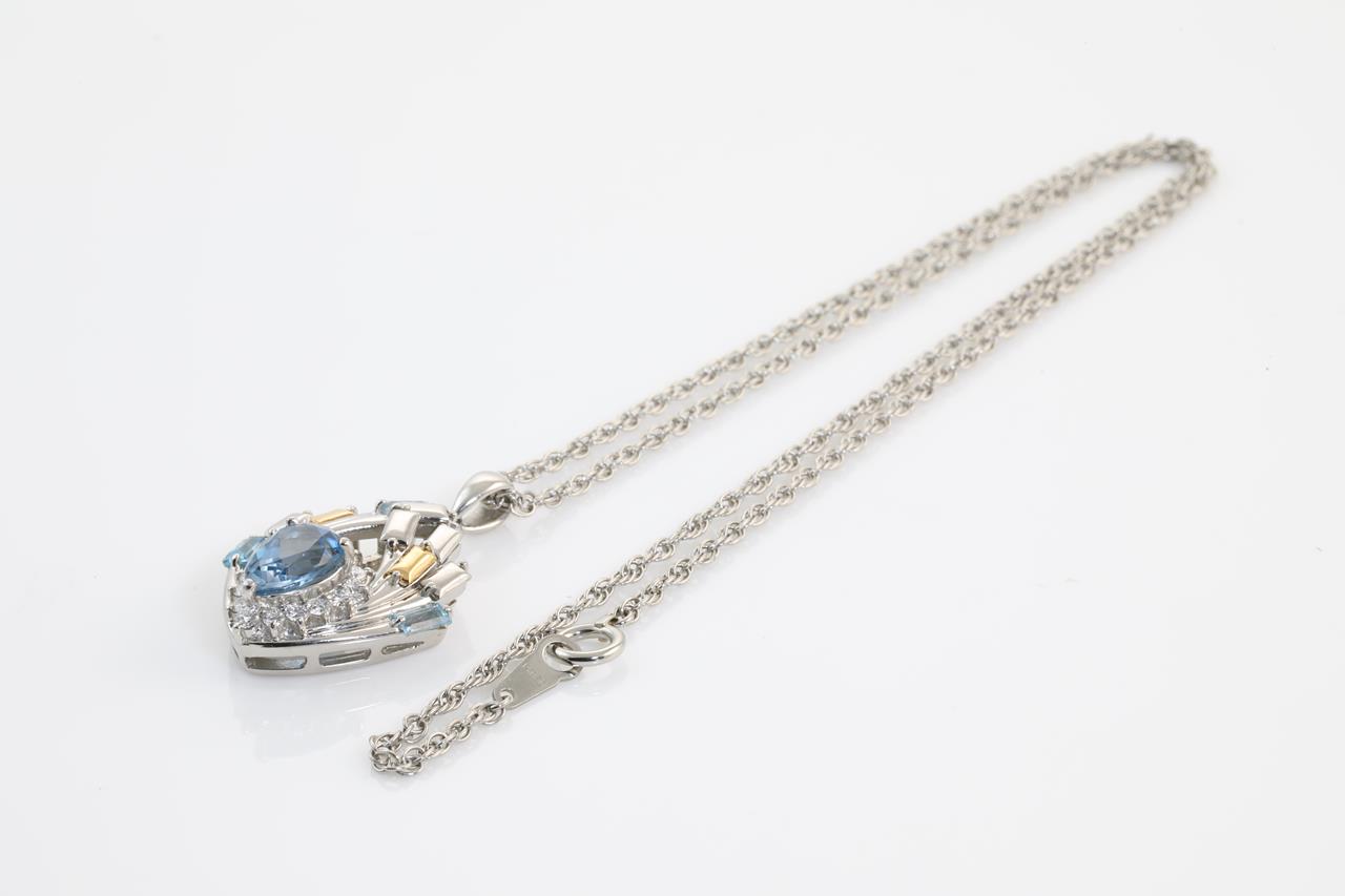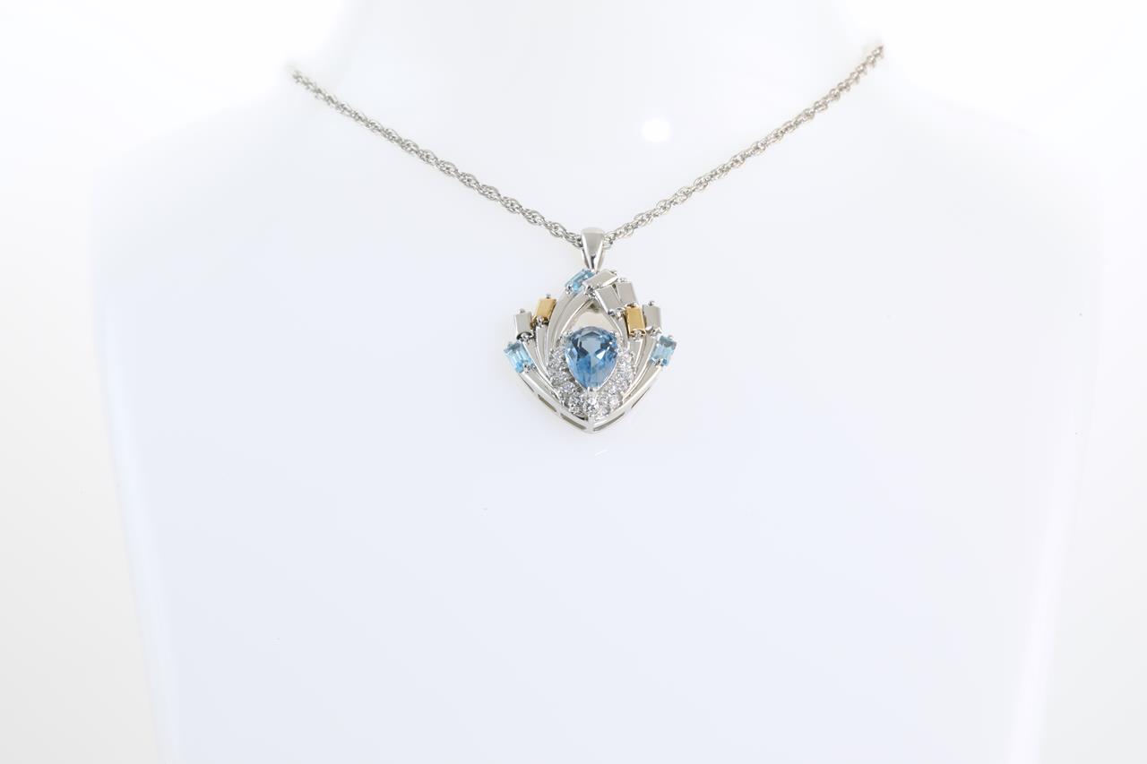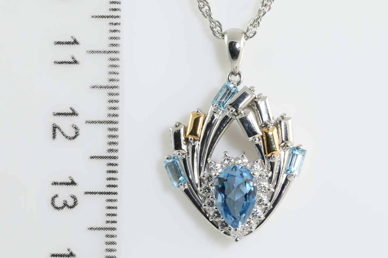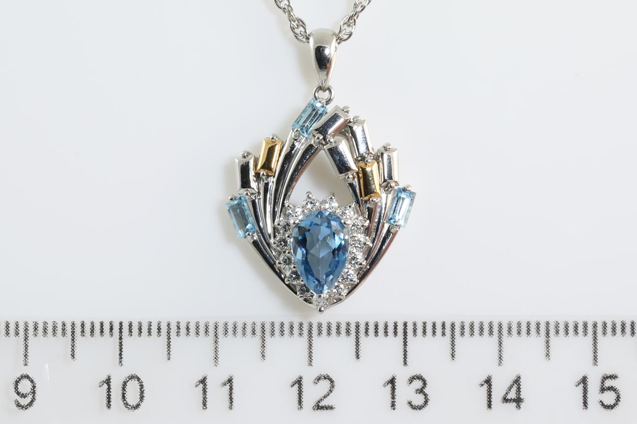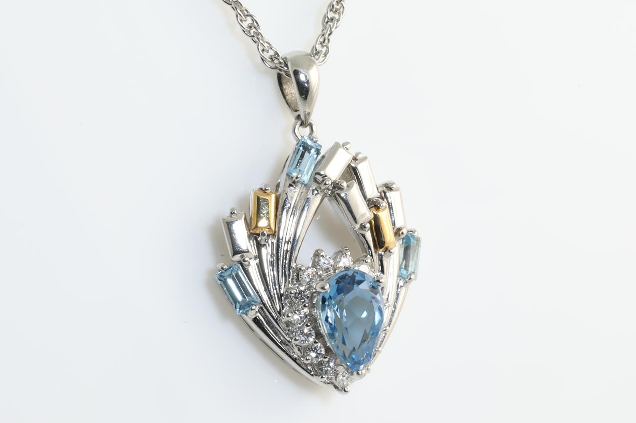Aquamarine and Diamond pendant with pear & baguette cut Aquamarines totalling 1.80cts and Diamonds totalling 0.27cts. 18ct yellow gold & platinum with 40cm chain. Weight: 13.3g. (Pre-owned)