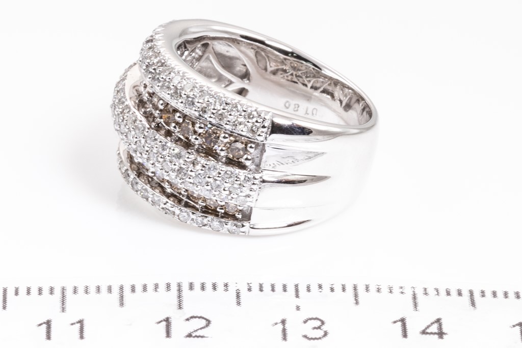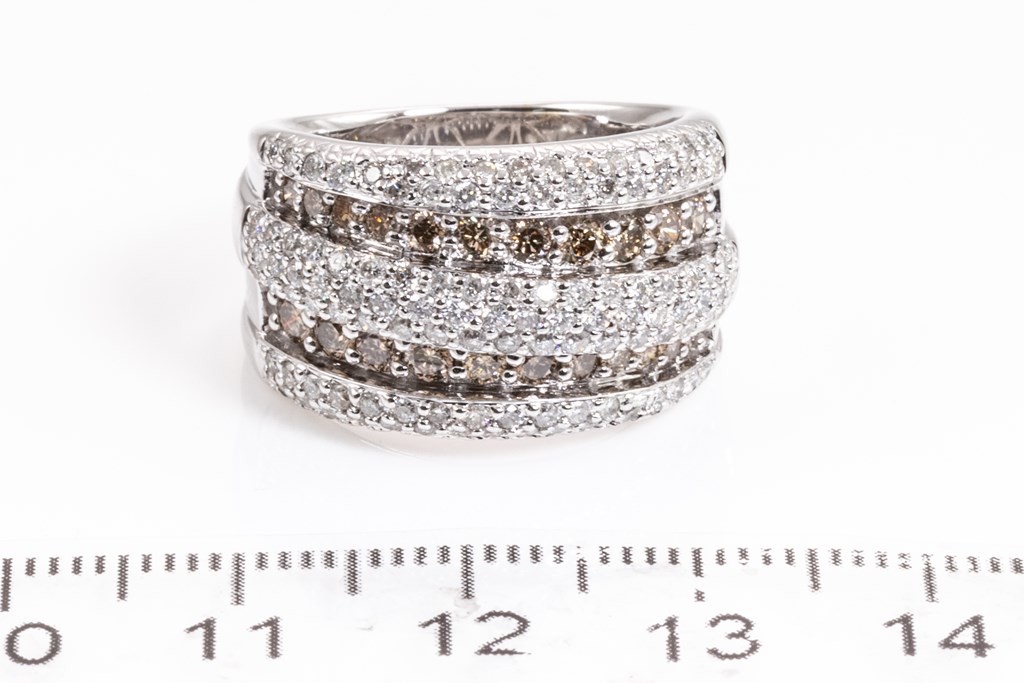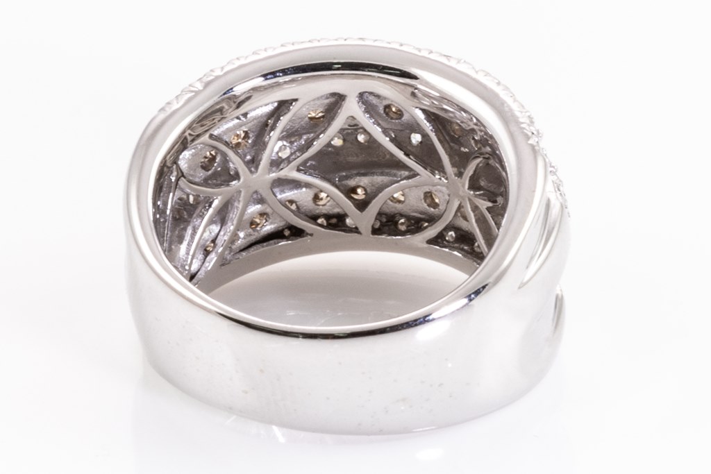 Diamond dress ring with round Diamonds totalling 1.80cts (Estimated grading: Champagne-H-I SI-P1). 18ct white gold. Ring size N - ring resizing is not recommended. Weight: 12.9g. (Pre-owned)