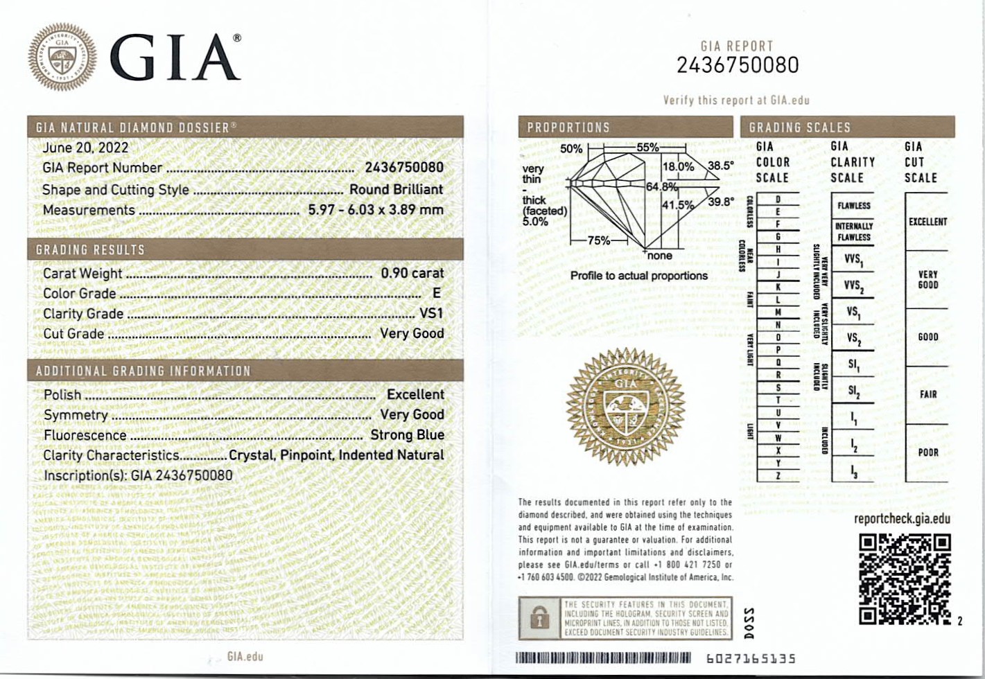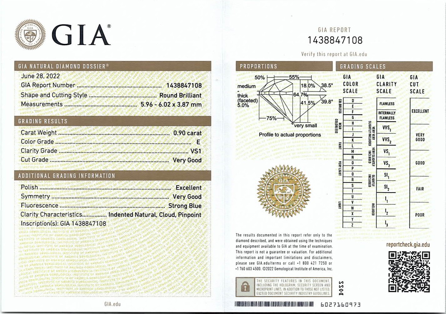 Diamond stud earrings with 2 round brilliant cut Diamonds totalling 1.80cts (with GIA reports graded as E VS1 #2436750080, 1438847108