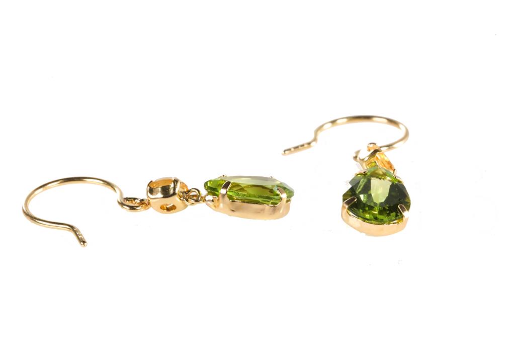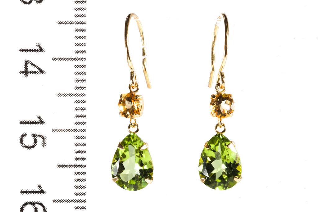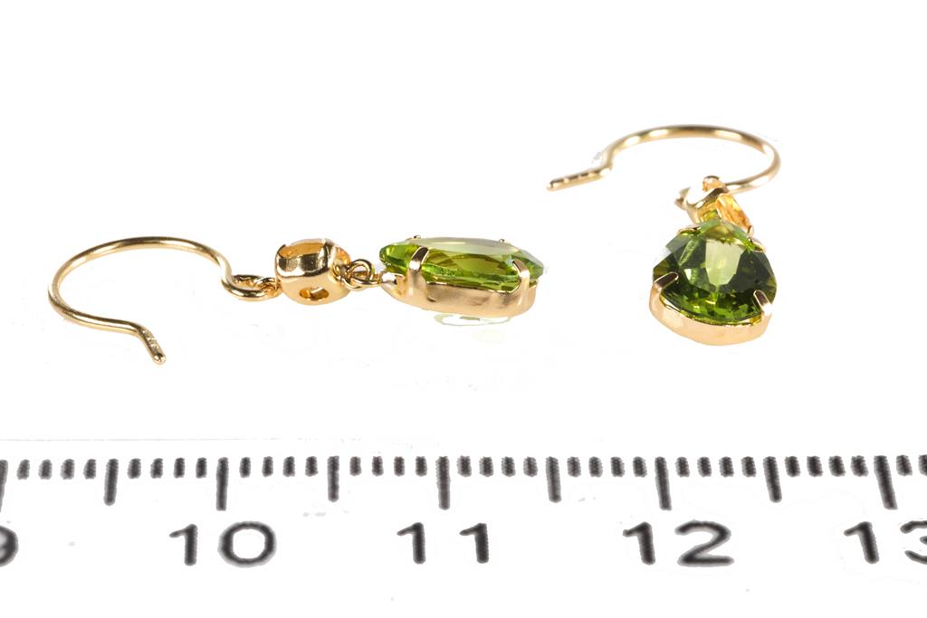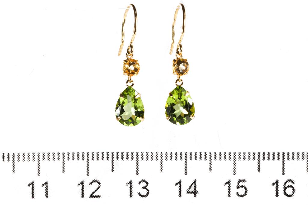 Peridot and Citrine shepherd hook earrings with pear shape Peridots totalling 1.80cts and round Citrines totalling 0.30cts. 18ct yellow gold with silicon backs. Weight: 1.2g (Pre-owned)