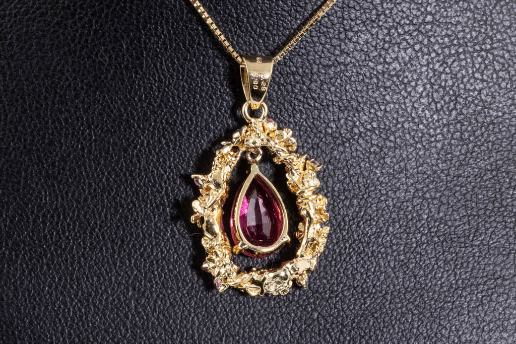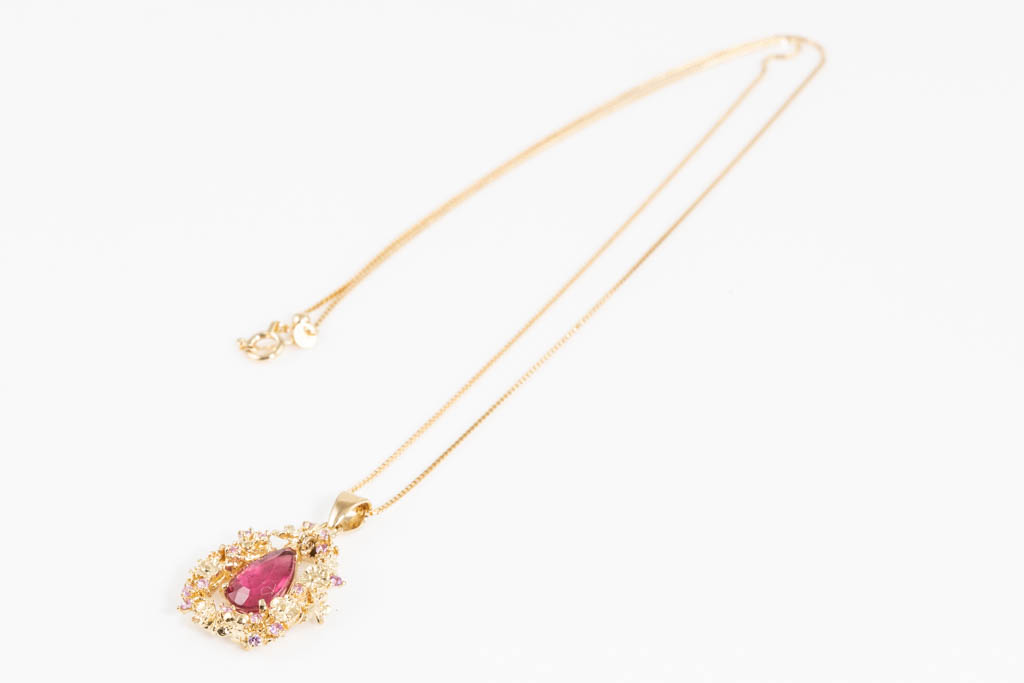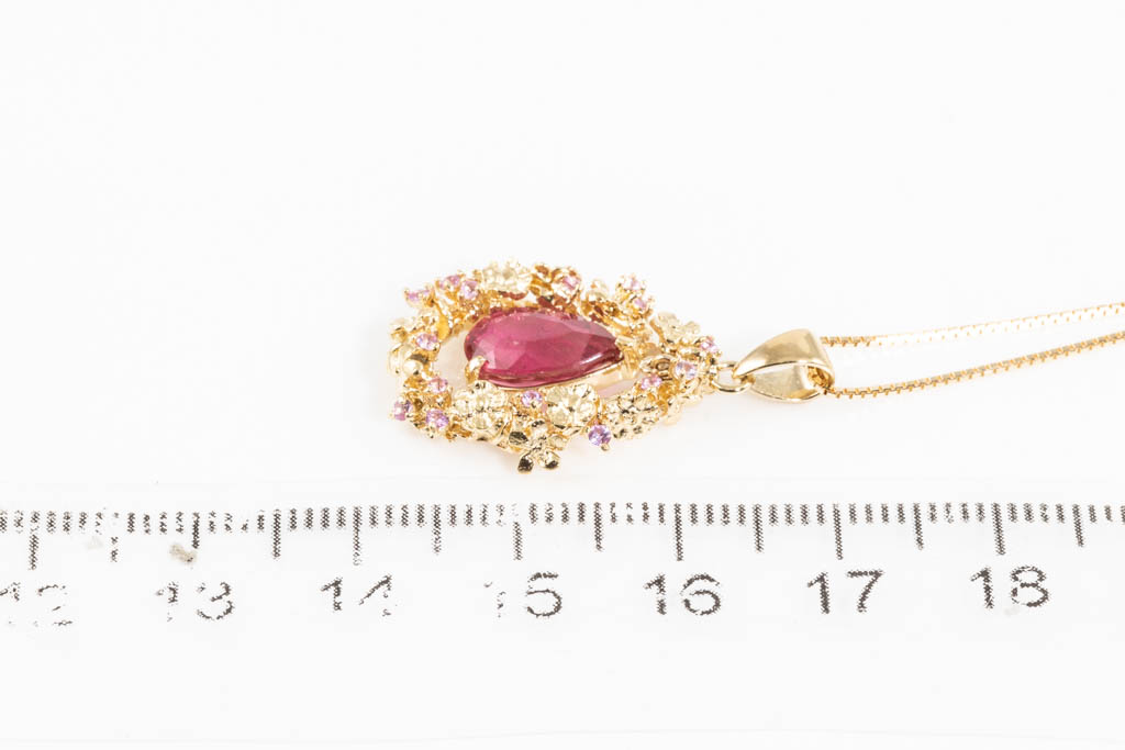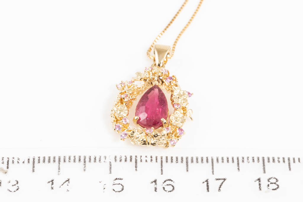 Tourmaline and Diamond pendant with pear shape pink Tourmaline of 1.80ct and pink round Sapphires totalling 0.29cts. 18ct yellow gold with 18ct yellow gold adjustable 44cm chain. Weight: 6.4g. (Pre-owned)