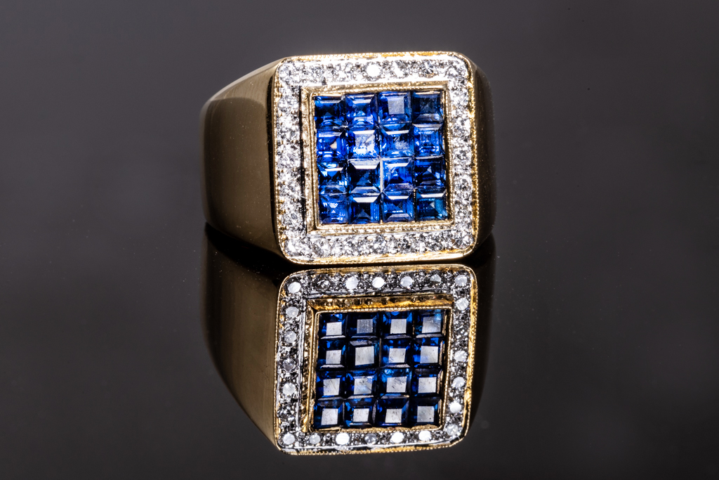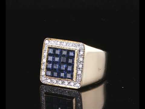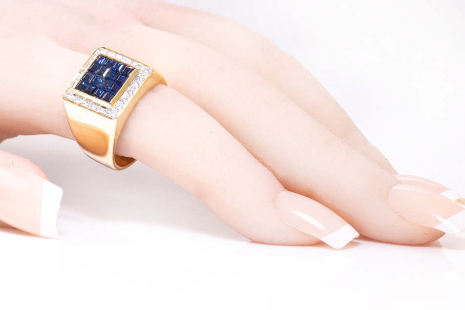 Sapphire and Diamond ring with carre cut blue Sapphires totalling 1.80cts and round Diamonds totalling 0.28cts. 18ct yellow gold. Ring size P1/2 - ring resizing is not recommended. Weight: 13.7g. (Pre-owned)