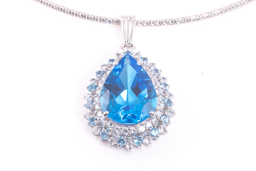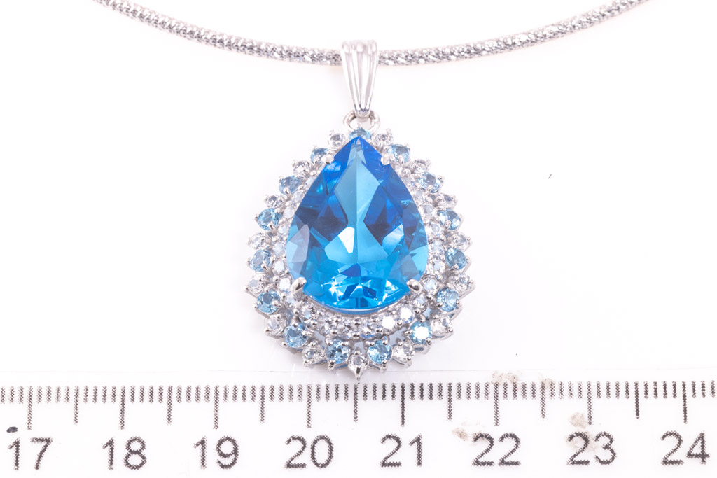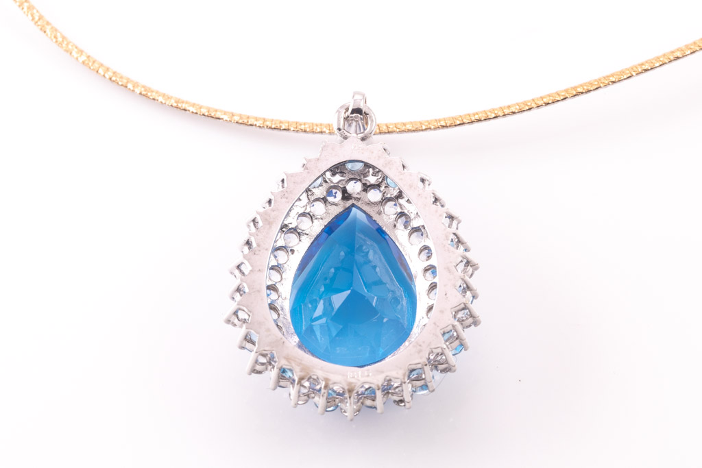 Topaz pendant with centre pear shape blue Topaz of 18.16ct and round blue & colourless Topaz totalling approximately 0.60cts. 14ct white gold with 45cm 14ct yellow and white gold adjustable wire chain. Weight: 17.1g. (Pre-owned)