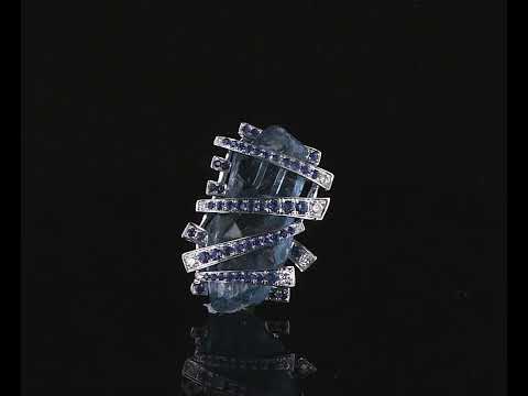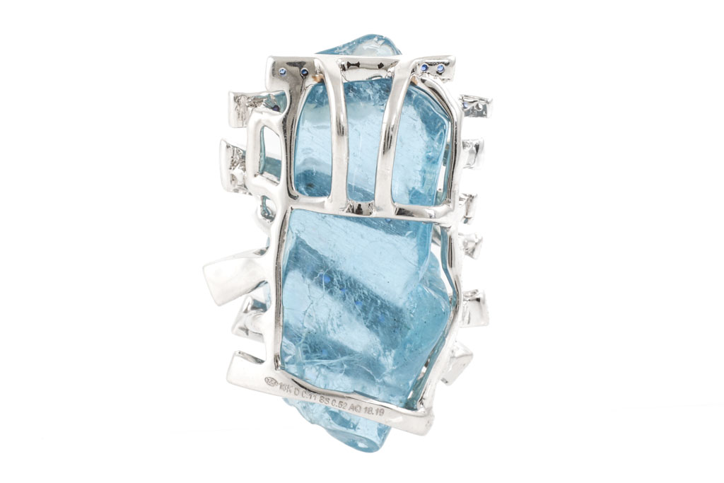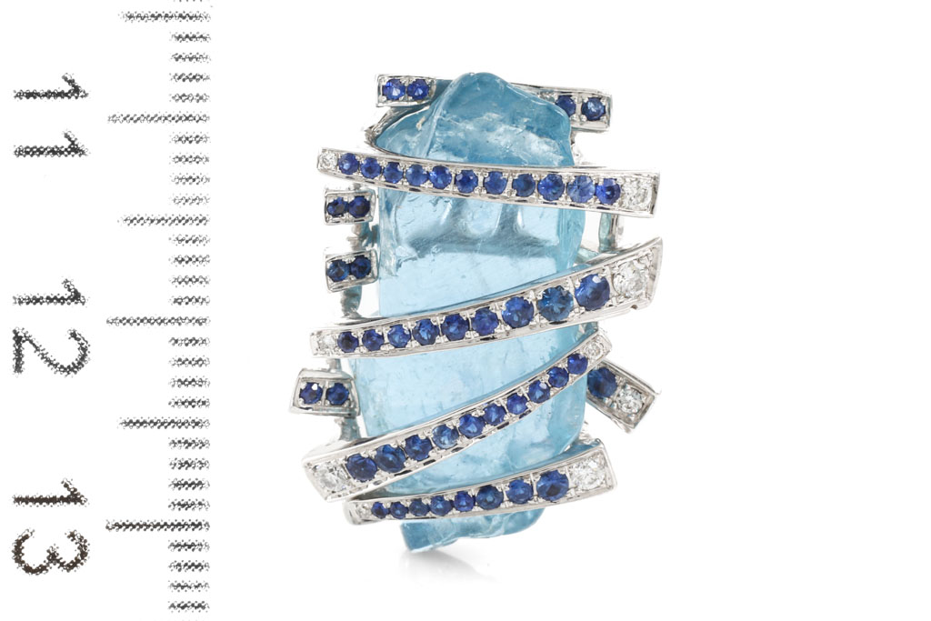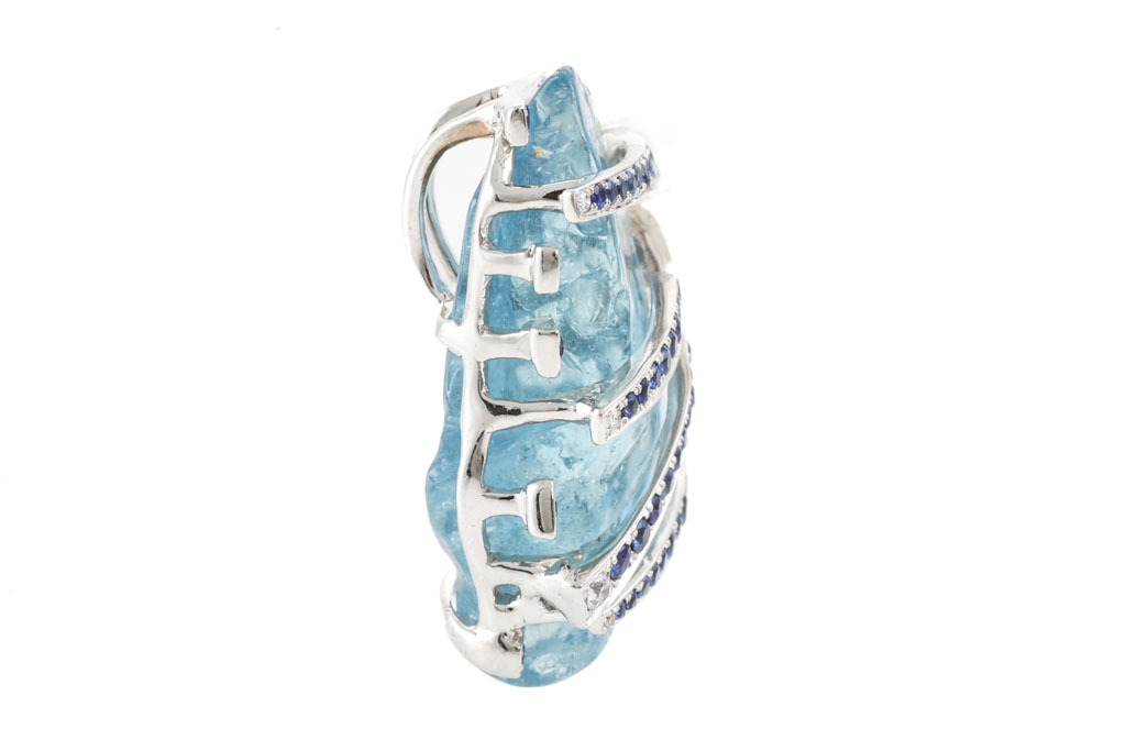 Aquamarine, Sapphire and Diamond pendant with rough Aquamarine of 18.19ct, round blue Sapphires totalling 0.52cts and round Diamonds totalling 0.01cts. 18ct white gold. No chain provided. Weight: 8.6g (Pre-owned)