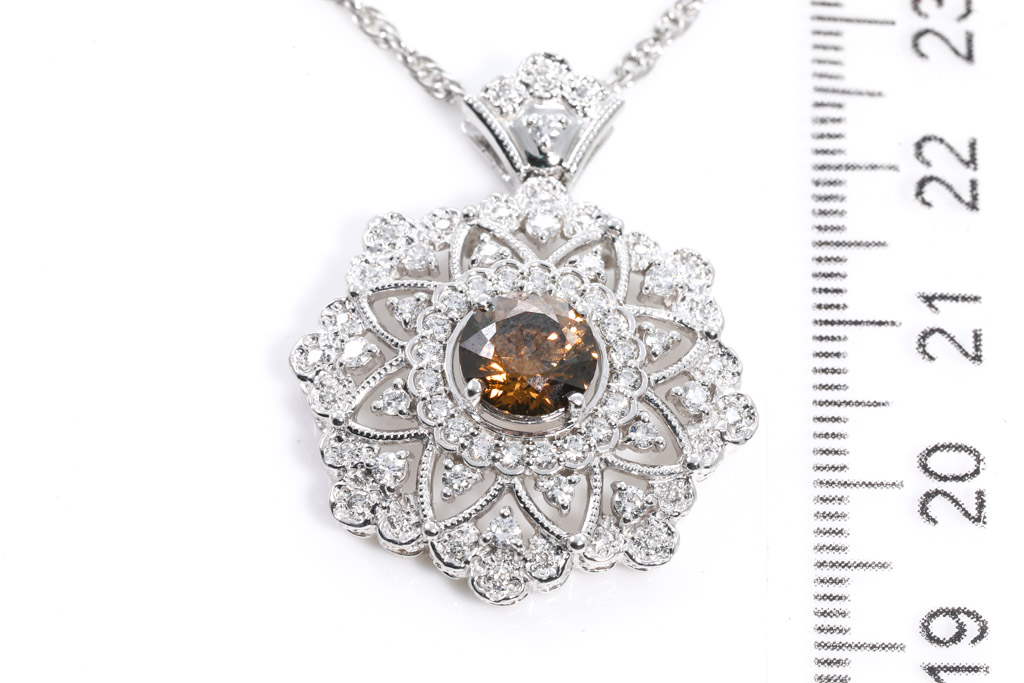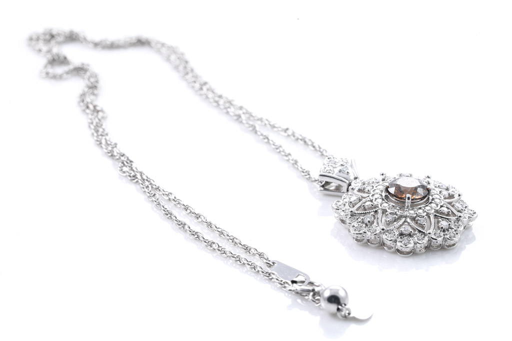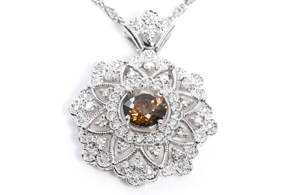 Diamond pendant with a centre round Cognac Diamond of 1.81ct (Estimated grading: Cognac SI) and remaining round Diamonds totalling 0.84cts (Estimated grading H-I SI). Platinum with 50cm platinum adjustable chain. Weight: 17.3g. With certificate #416475. (Pre-owned)