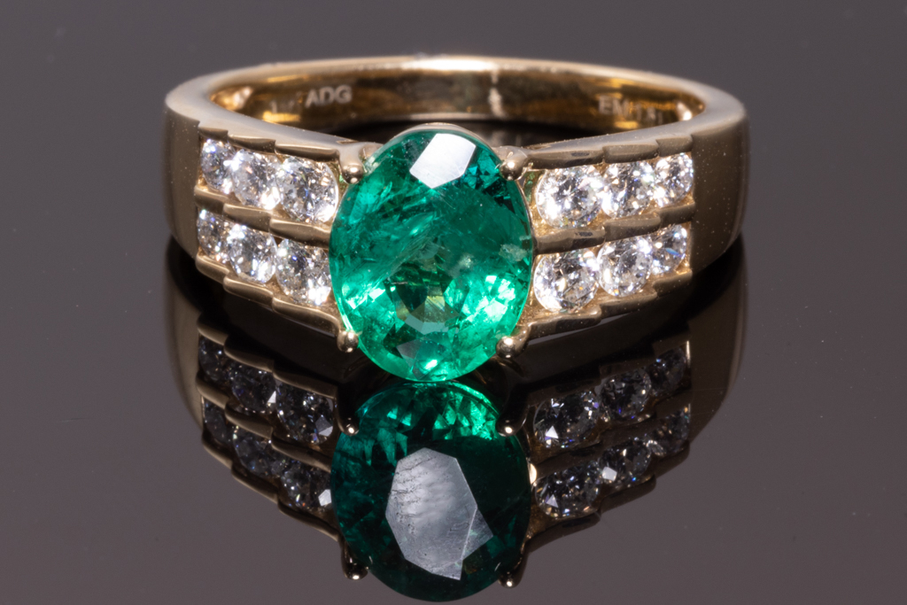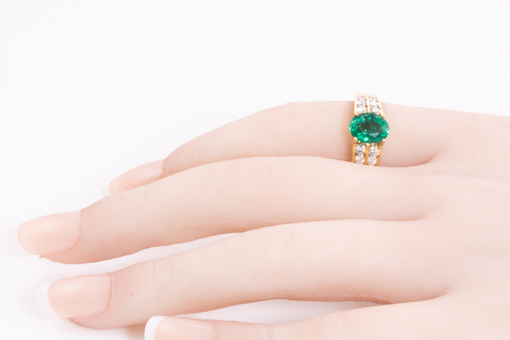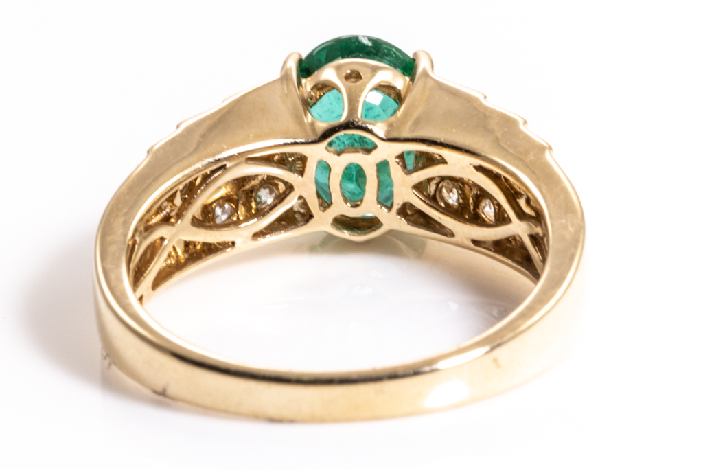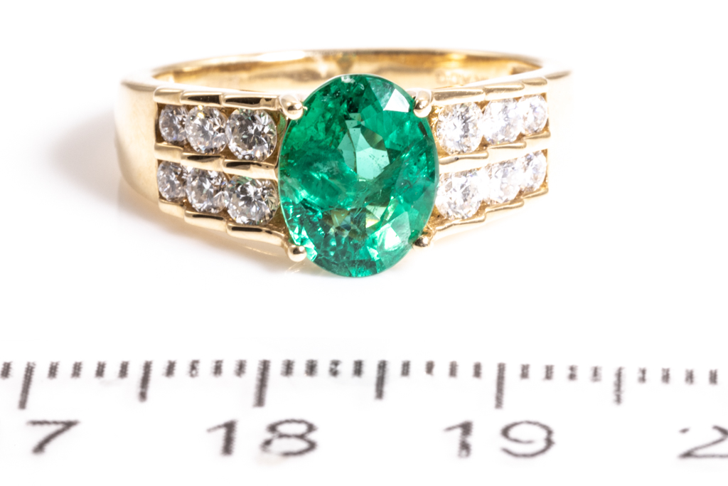 Emerald and Diamond ring with an oval Emerald of 1.81ct and round Diamonds totalling 0.60cts (Estimated grading: H-I SI). 14ct yellow gold. Ring size N1/2 - ring resizing not recommended. Weight 4.8g (As New)