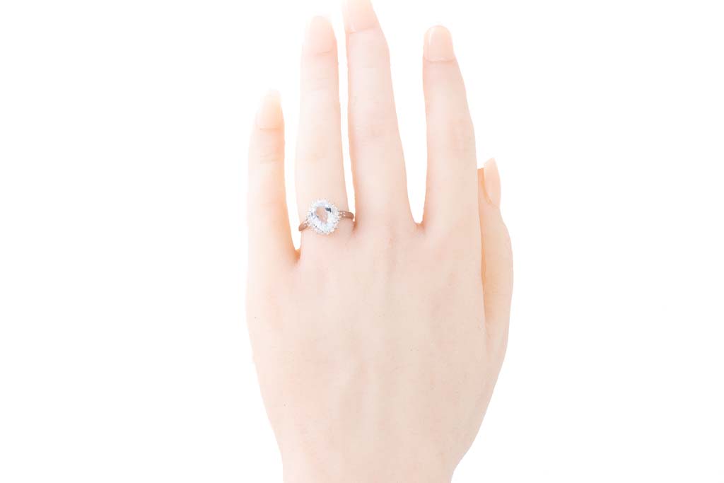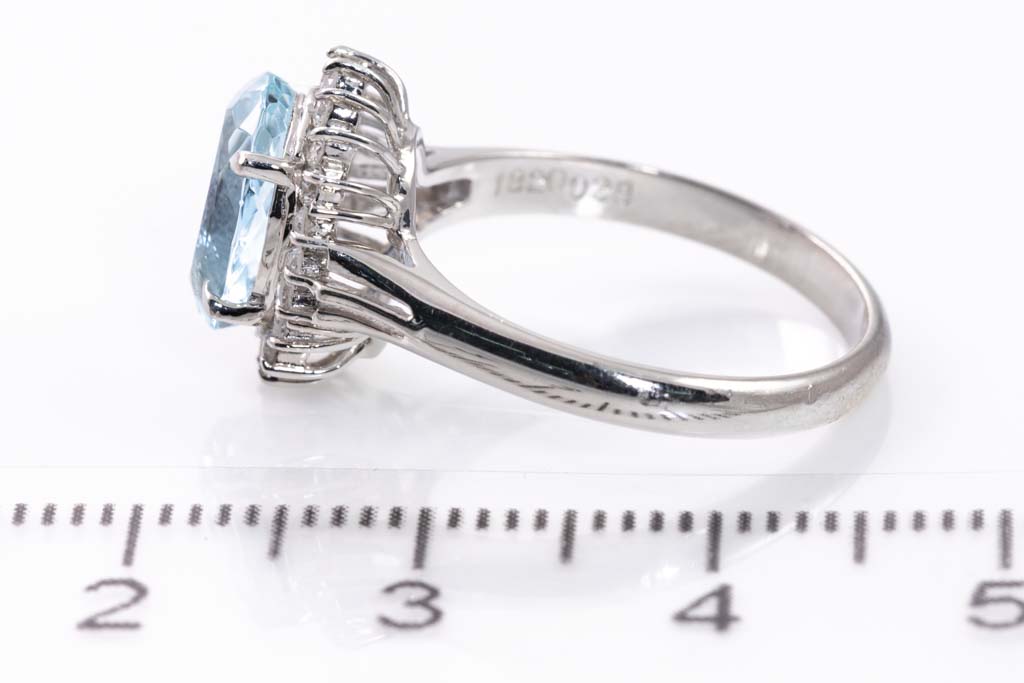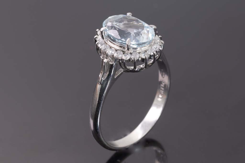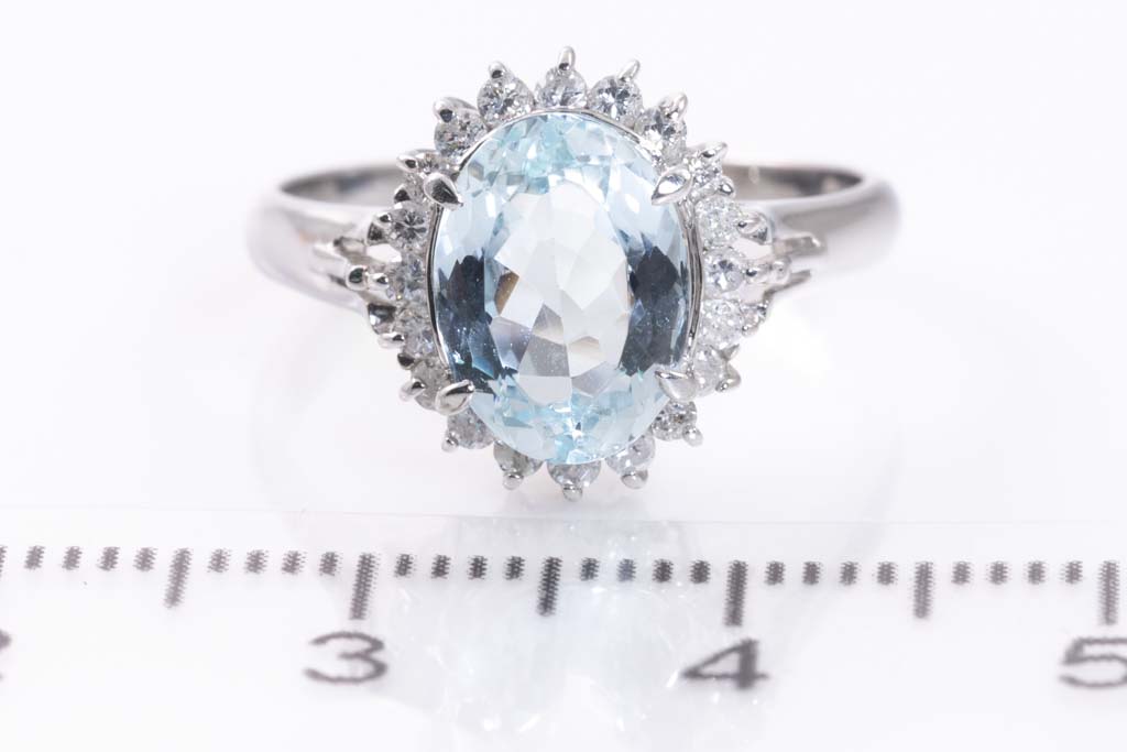 Aquamarine and Diamond ring with oval shape Aquamarine of 1.82ct and Diamonds totalling 0.28cts. Platinum - 850. Ring size L. Weight: 4.2g. (Pre-owned)