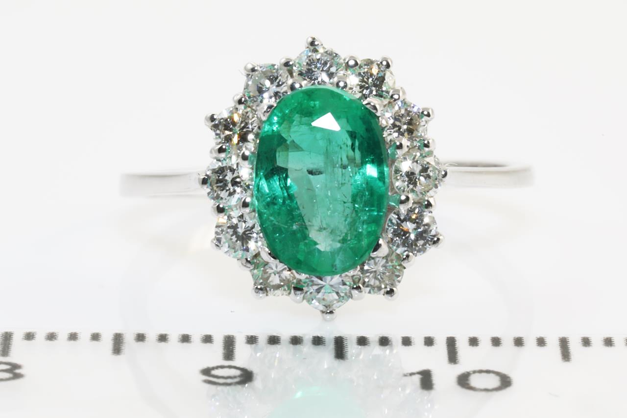 Emerald and Diamond ring with an oval Emerald of 1.82ct and Diamonds totalling 0.62cts (Estimated grading:H-I SI). 18ct white gold. Weight: 3.1g. Ring size: M1/2. (As New)