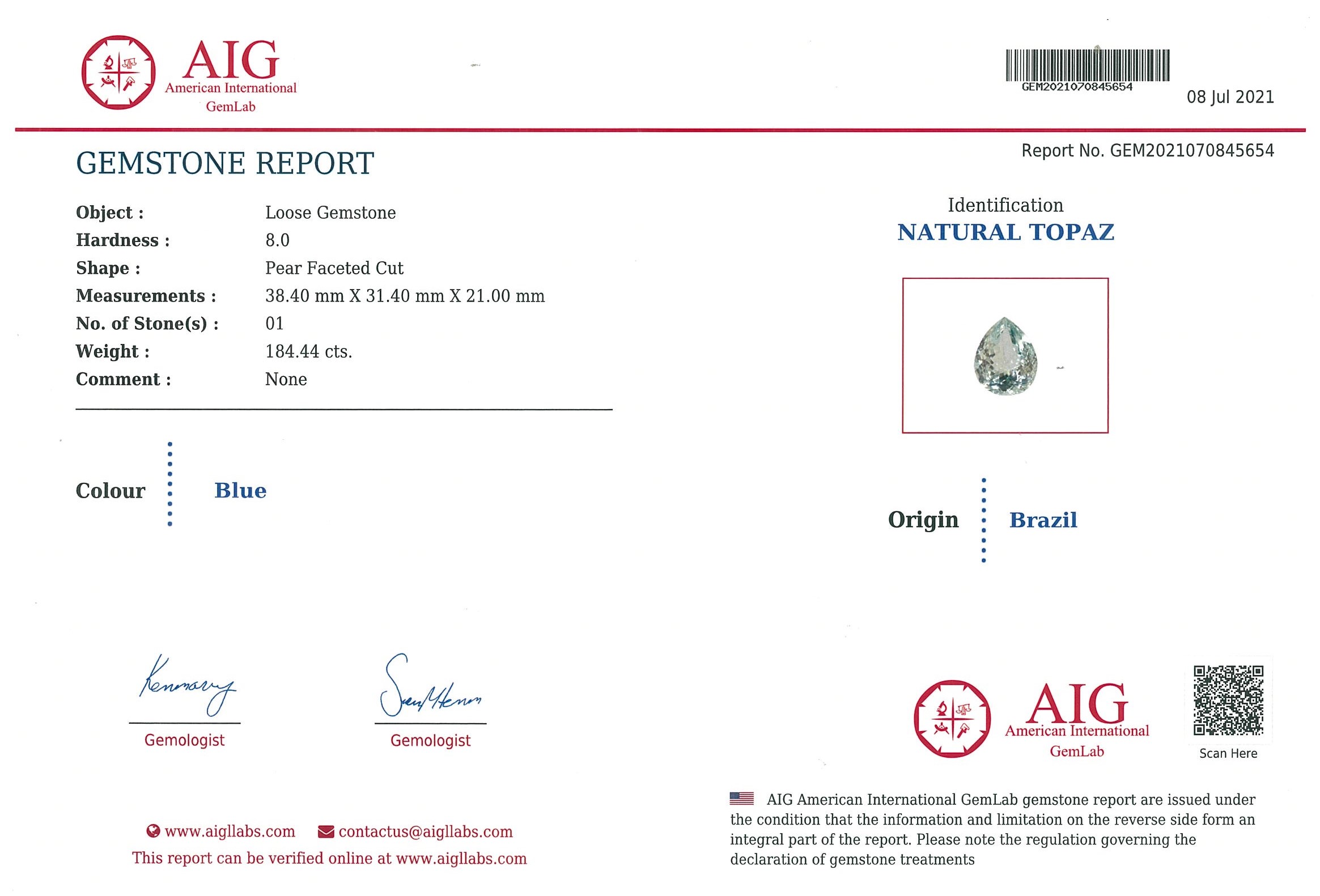 A loose pear cut Topaz of 184.44ct. Dimensions 38.40 x 31.40 x 21.00mm. With AIG report #GEM2021070845654. (As New)