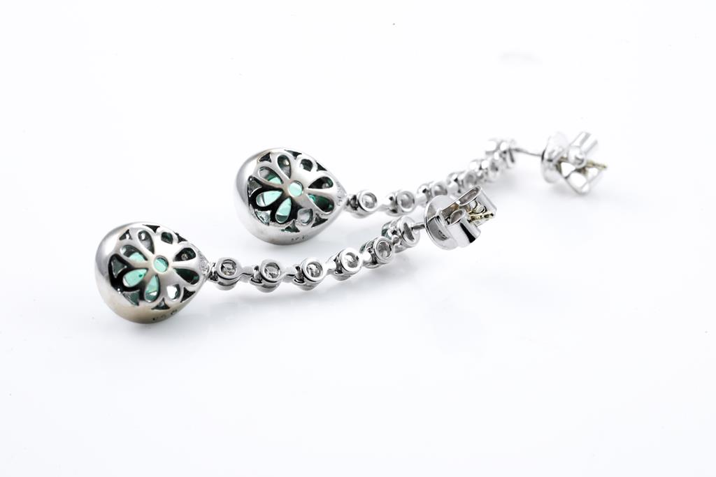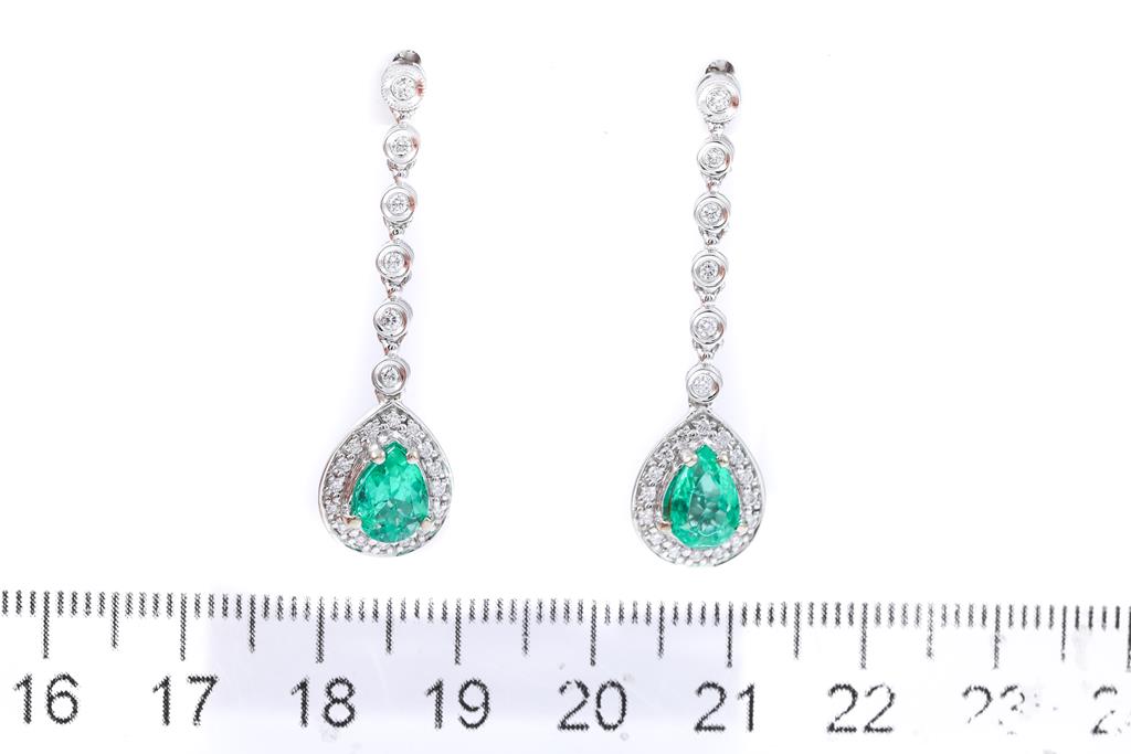 Emerald and Diamond drop earrings with pear shape Emeralds totalling 1.84cts and round Diamonds totalling approximately 0.21cts. 18ct white gold with 18ct backs. Weight: 7.5g. With Certificate #416013. (Pre-owned)